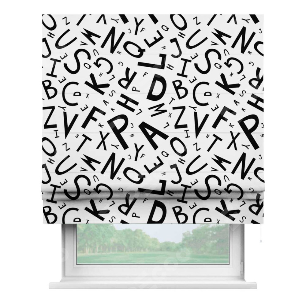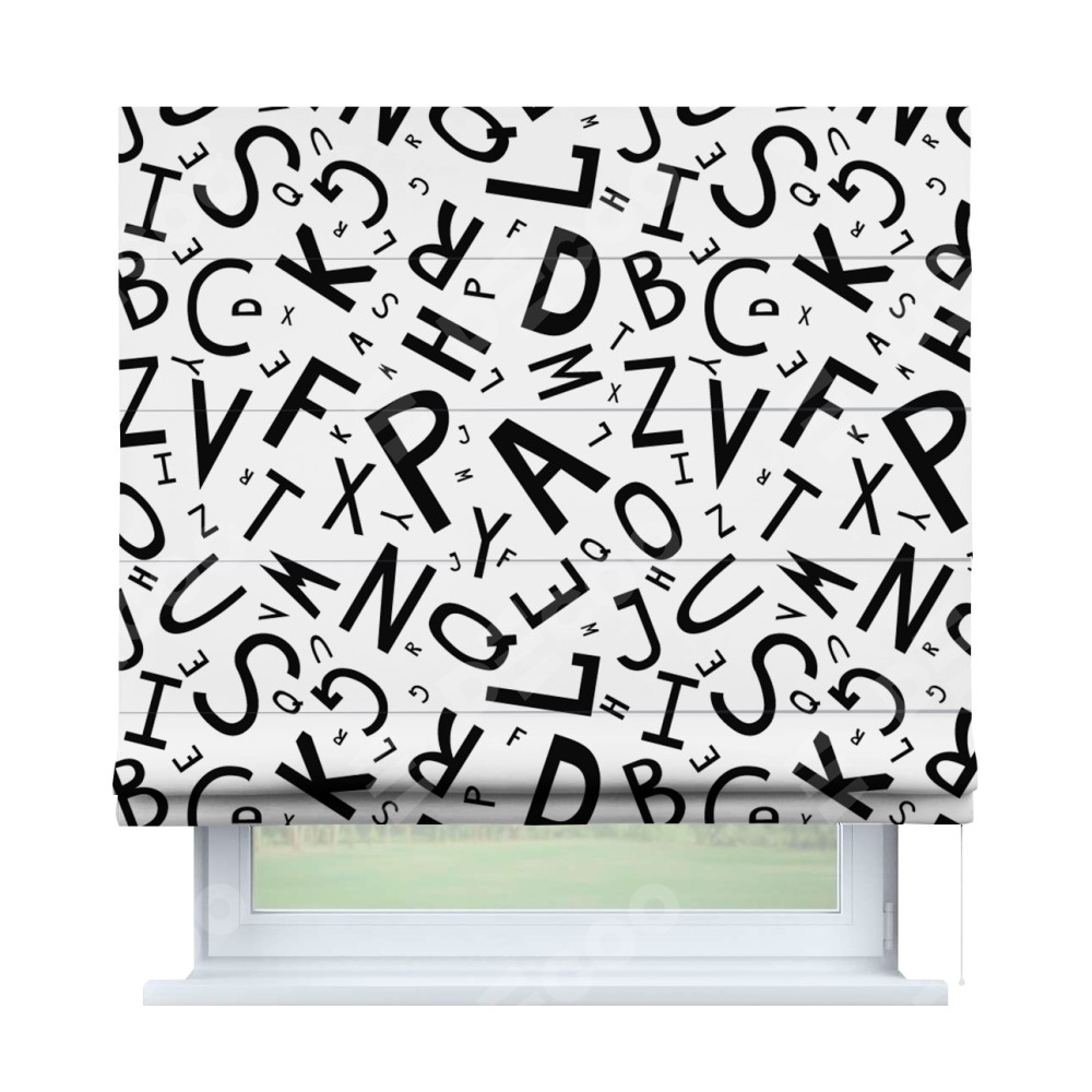 Римская штора производителя «Cortin», используется для проёма, пошита из ткани блэкаут с нанесением сублимационной печати «Литеры на белом». Имеет универсальный механизм и подходит для монтажа: на потолок, на стену и в нишу.