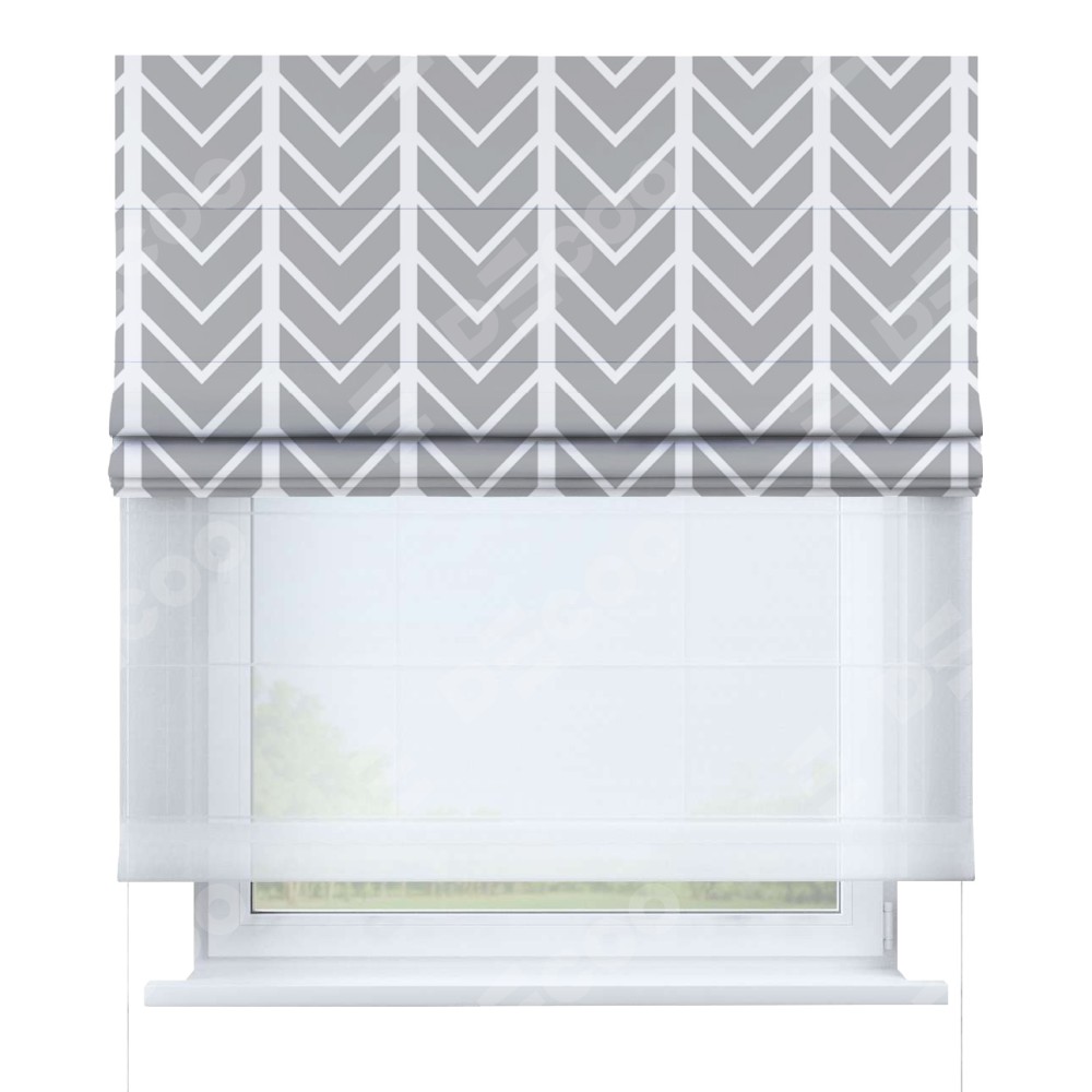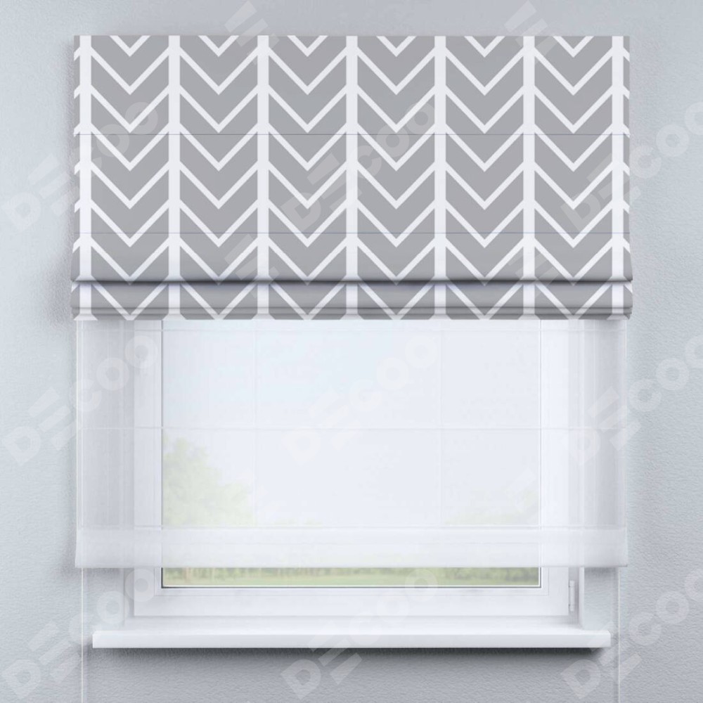 Римская штора день-ночь производителя «Cortin», используется для проёма, пошита из двух полотен, с лицевой блэкаут с нанесением сублимационной печати «Современная геометрия», вторая ткань тюль (по стандарту комплектуется тюль белого цвета артикул V-01). Имеет универсальный механизм и подходит для монтажа: на потолок, на стену и в нишу.