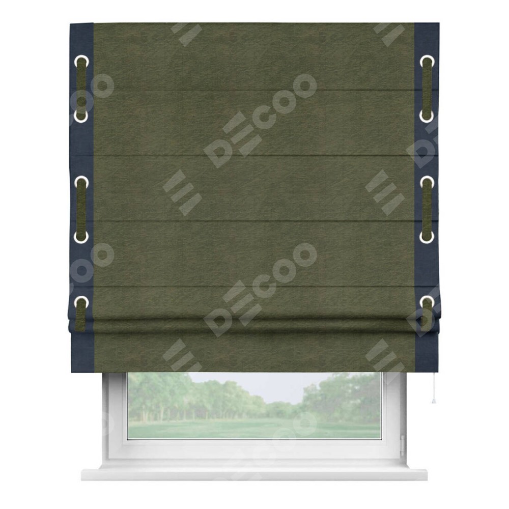 Римская штора производителя «Cortin», используется для проёма, пошита из ткани софт однотонный зелёный, артикул 33110. Отделка шторы кантом «Стрим Дуо» на кантах расположены люверсы с пояском, ткань для канта используется из софта разной расцветки на выбор. Ткань для пояска обычно используется из основной ткани шторы, а так же можно сделать из любой расцветки по желанию. Имеет универсальный механизм и подходит для монтажа: на потолок, на стену и в нишу.