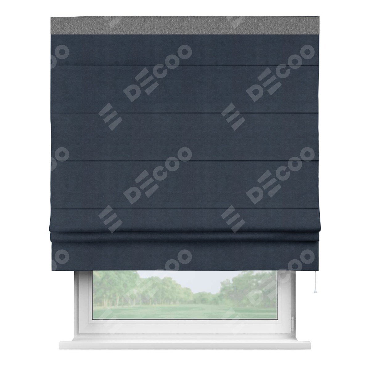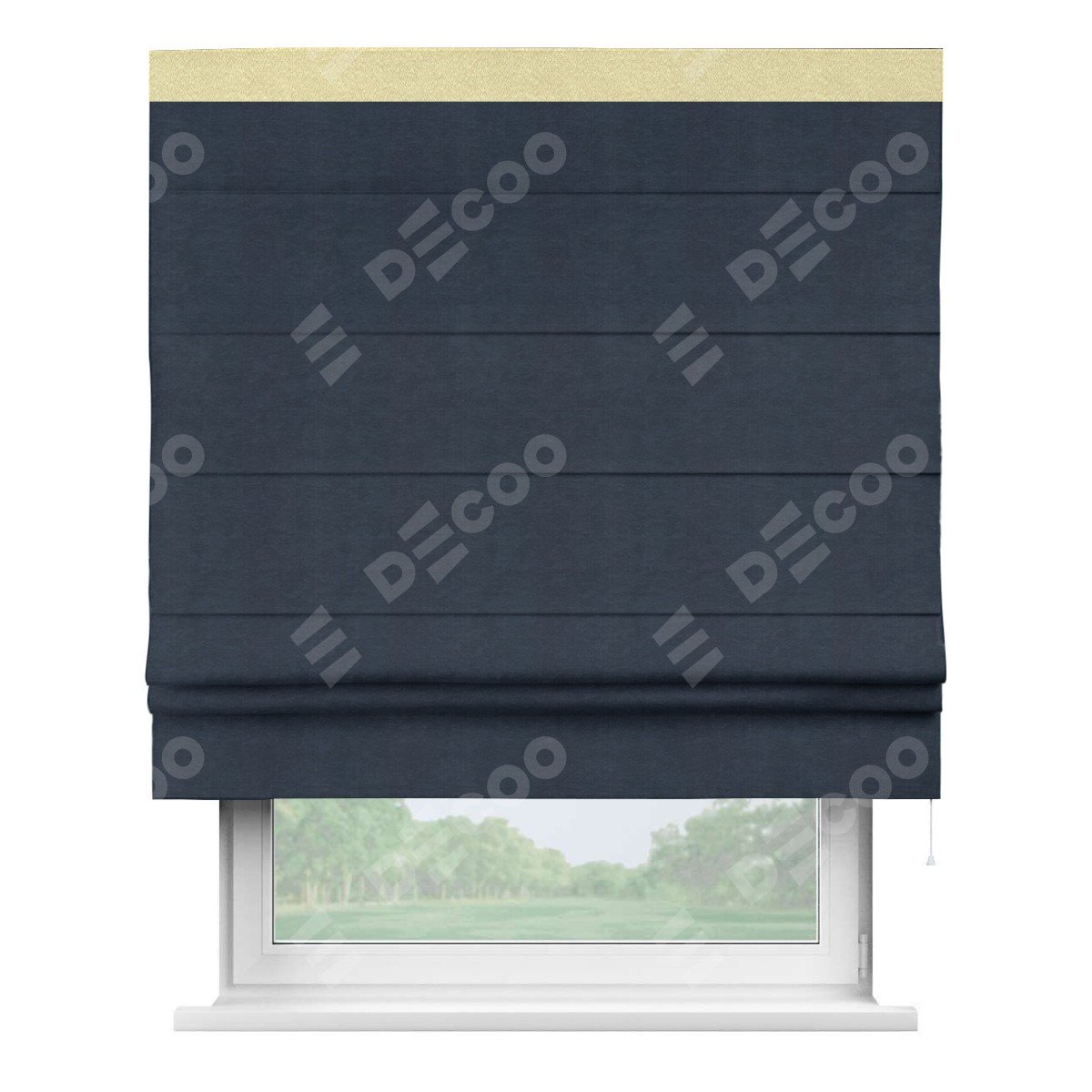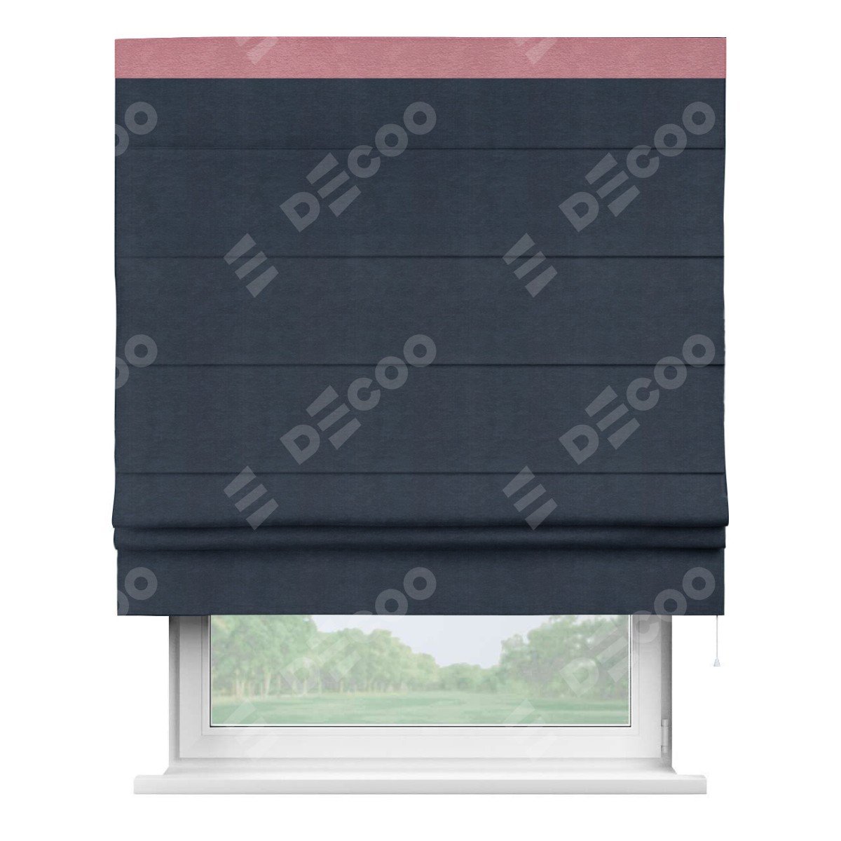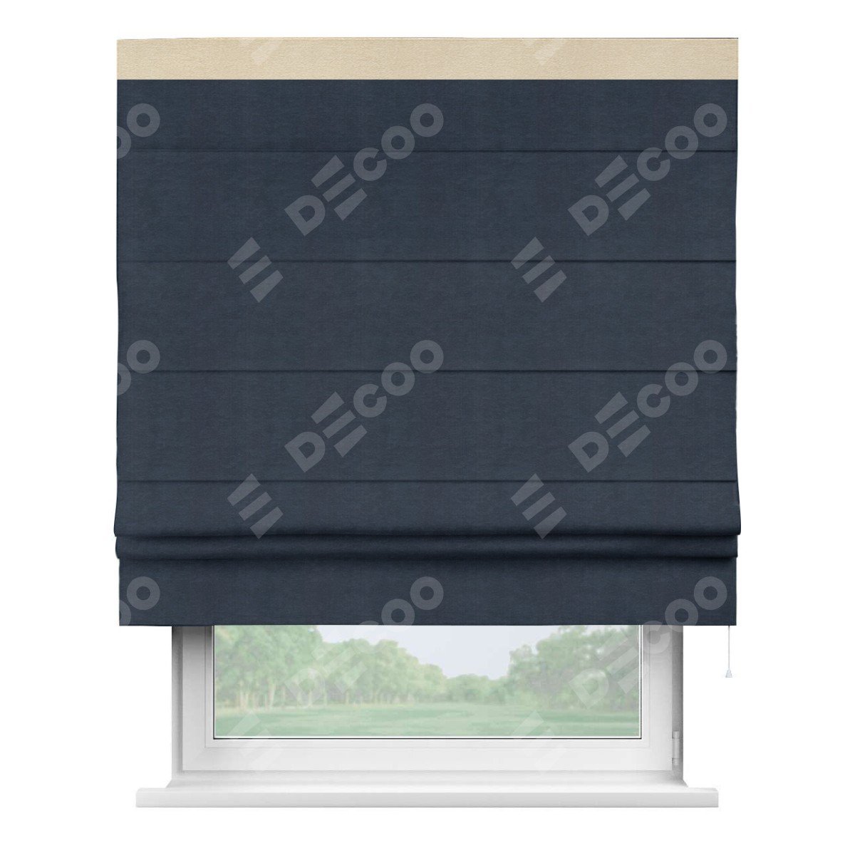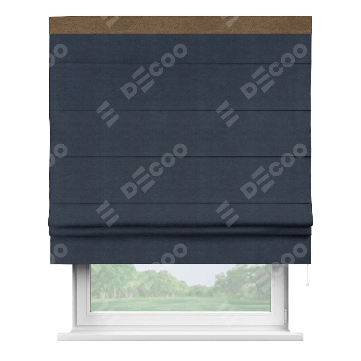 Римская штора производителя «Cortin», используется для проёма, пошита из ткани софт однотонный тёмно-синий, артикул 33111. Отделка шторы кантом «Кинг», ткань для канта используется из софта разной расцветки на выбор. Имеет универсальный механизм и подходит для монтажа: на потолок, на стену и в нишу.