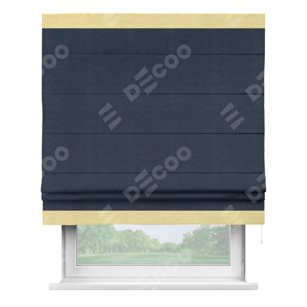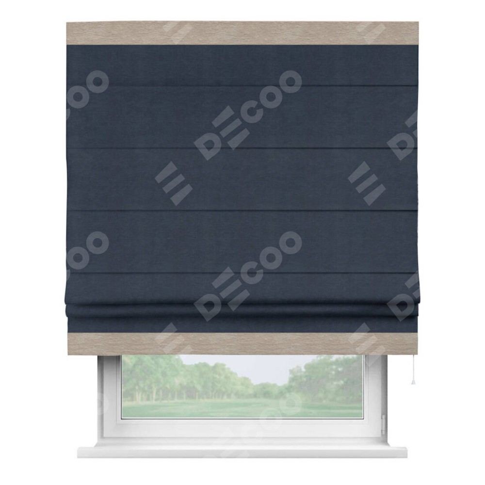 Римская штора производителя «Cortin», используется для проёма, пошита из ткани софт однотонный тёмно-синий, артикул 33111. Отделка шторы кантом «Горизонт», ткань для канта используется из софта разной расцветки на выбор. Имеет универсальный механизм и подходит для монтажа: на потолок, на стену и в нишу.