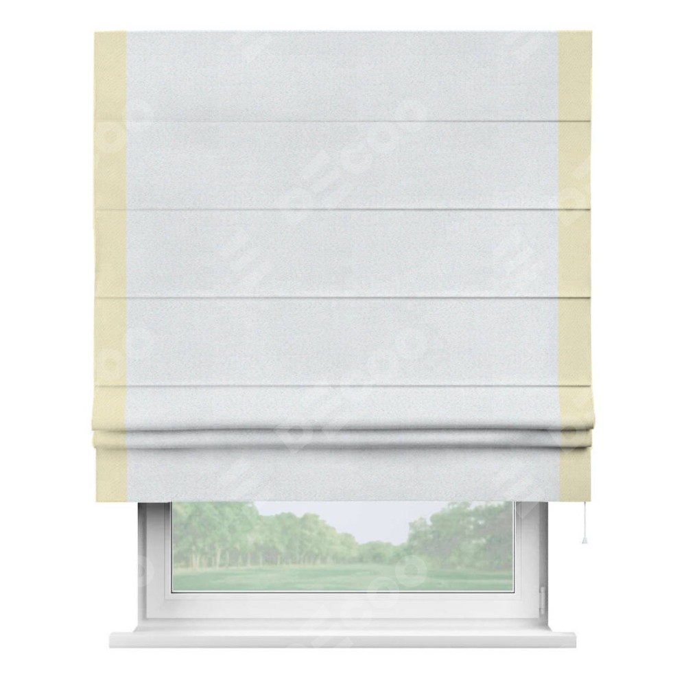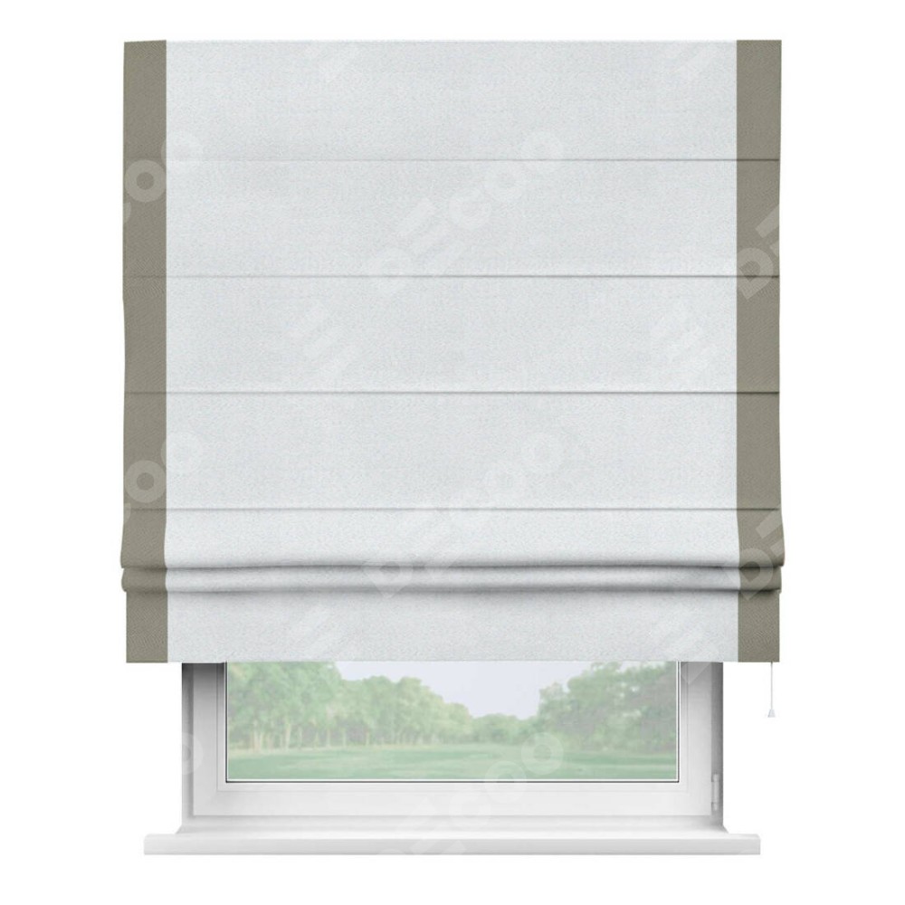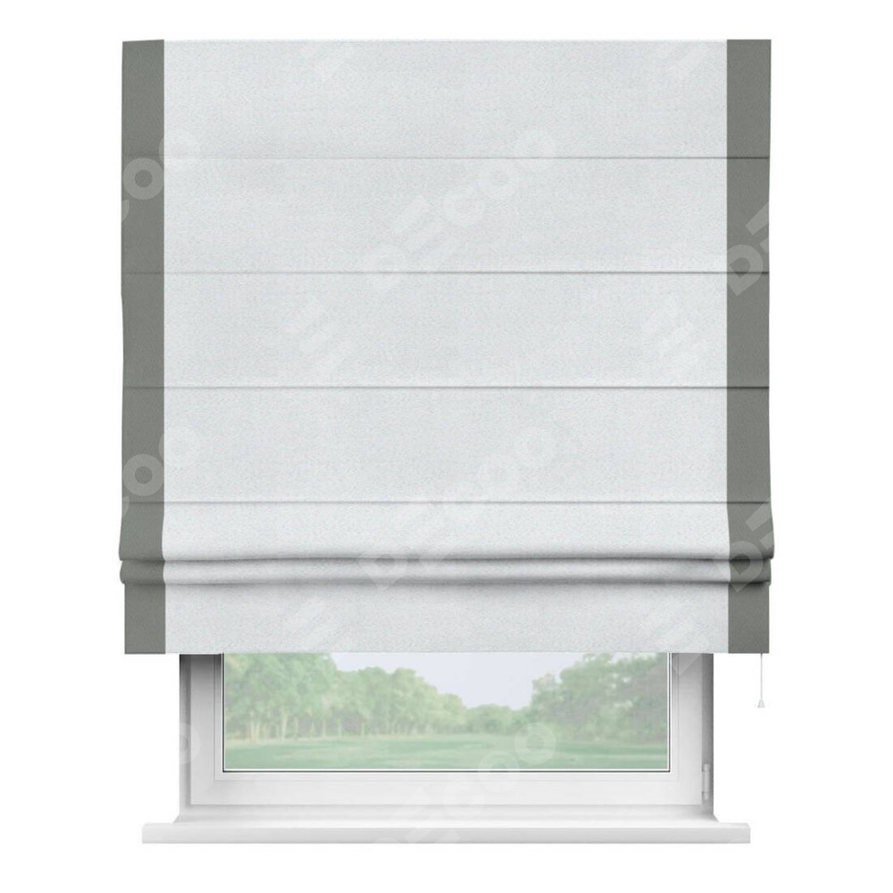Римская штора производителя «Cortin», используется для проёма, пошита из ткани блэкаут однотонный дымчато-белый, артикул ткани 101. Отделка шторы кантом «Стрим Дуо», ткань для канта используется из блэкаута однотонного разной расцветки на выбор. Имеет универсальный механизм и подходит для монтажа: на потолок, на стену и в нишу.