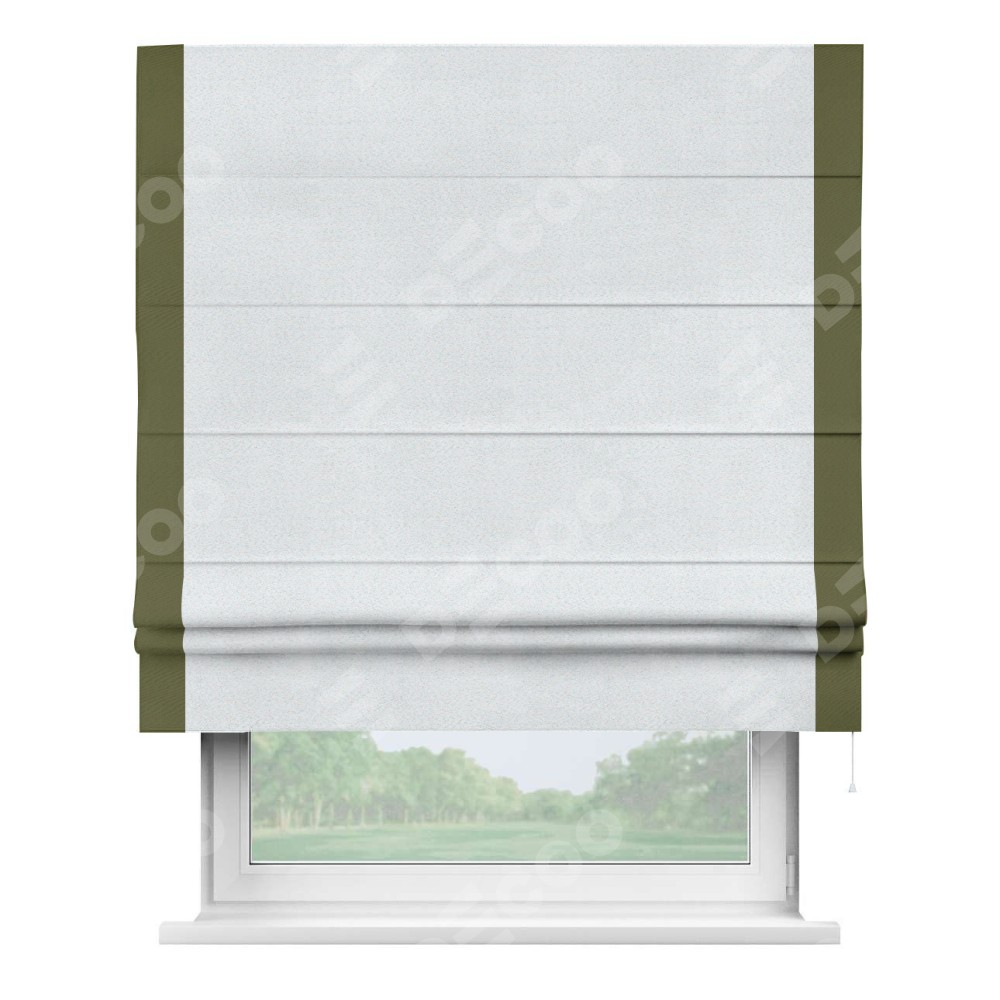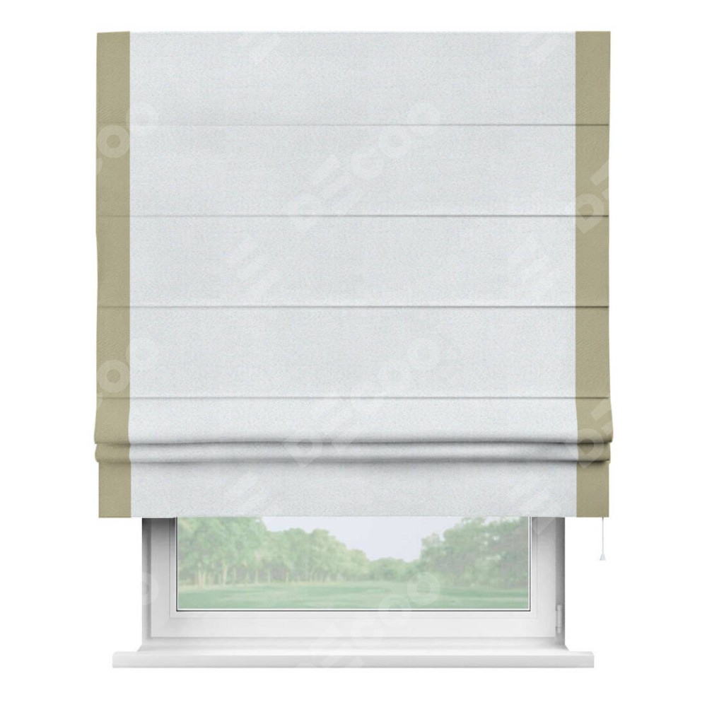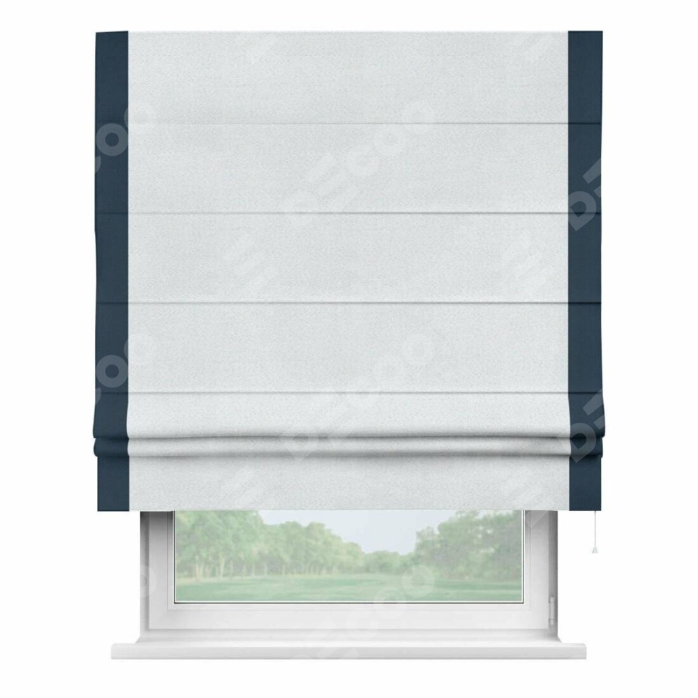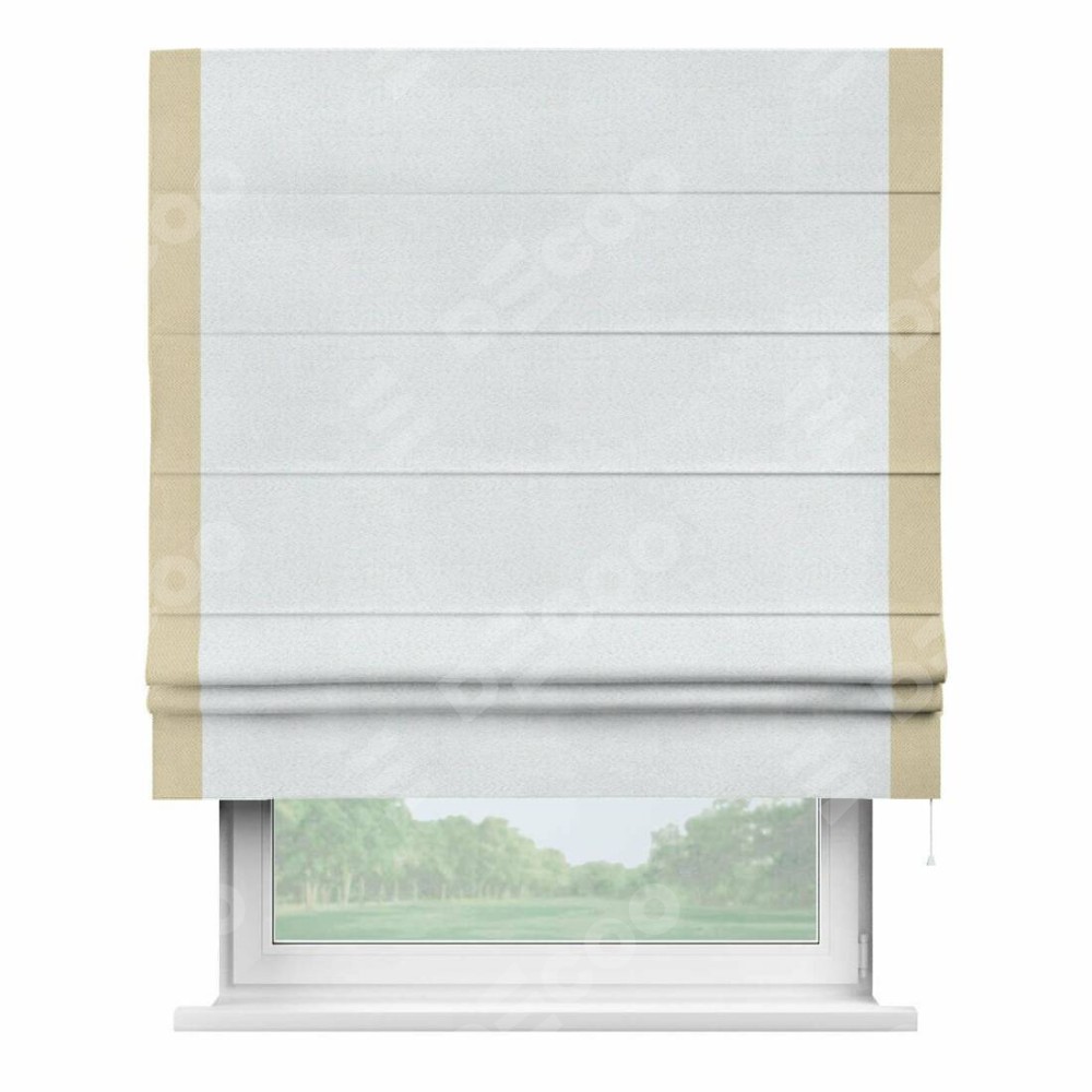 Римская штора производителя «Cortin», используется для проёма, пошита из ткани блэкаут однотонный дымчато-белый, артикул ткани 101. Отделка шторы кантом «Стрим Дуо», ткань для канта используется из блэкаута однотонного разной расцветки на выбор. Имеет универсальный механизм и подходит для монтажа: на потолок, на стену и в нишу.