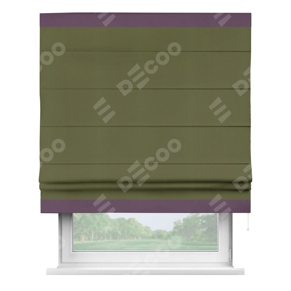 Римская штора производителя «Cortin», используется для проёма, пошита из ткани блэкаут однотонный зелёный, артикул ткани 81859. Отделка шторы кантом «Горизонт», ткань для канта используется из блэкаута однотонного разной расцветки на выбор. Имеет универсальный механизм и подходит для монтажа: на потолок, на стену и в нишу.