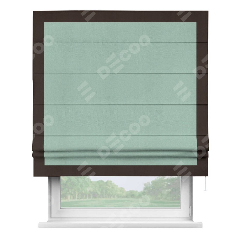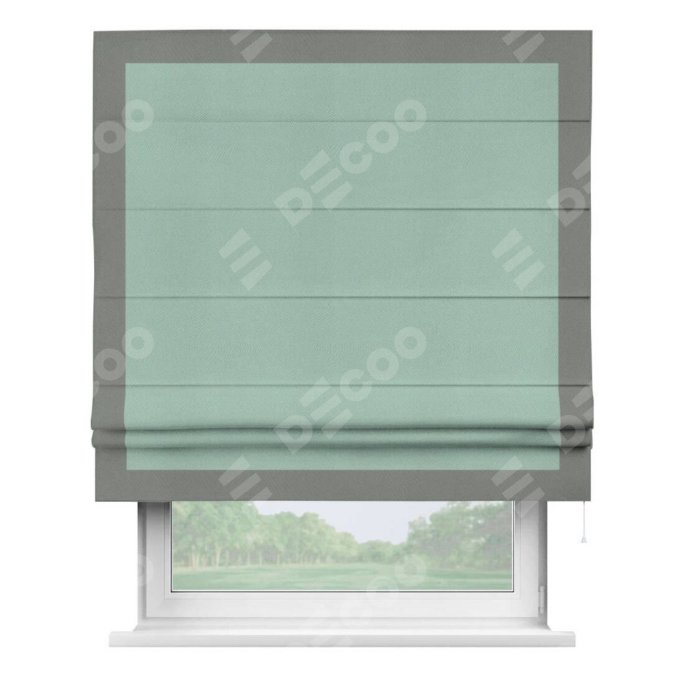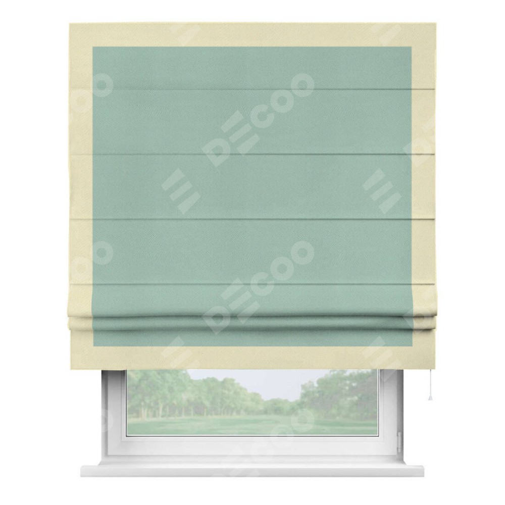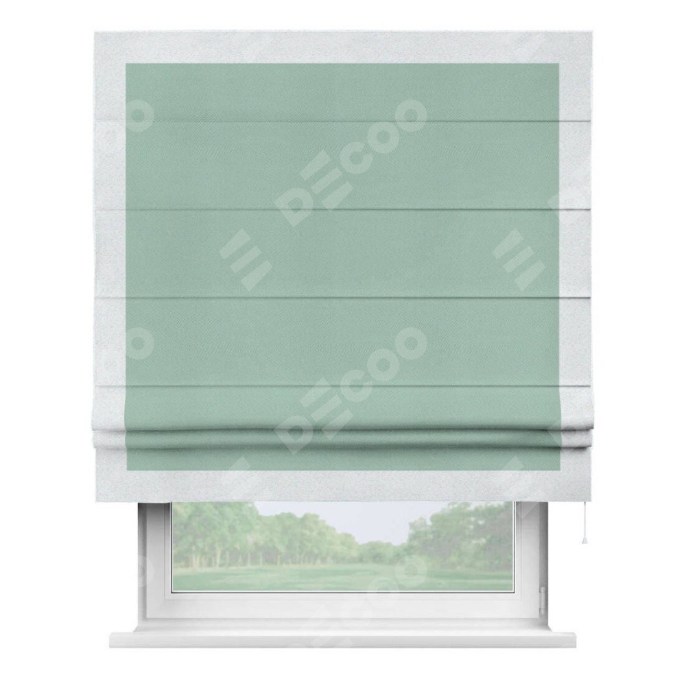 Римская штора производителя «Cortin», используется для проёма, пошита из ткани блэкаут однотонный ментоловый, артикул ткани 29584. Отделка шторы кантом «Чесс», ткань для канта используется из блэкаута однотонного разной расцветки на выбор. Имеет универсальный механизм и подходит для монтажа: на потолок, на стену и в нишу.