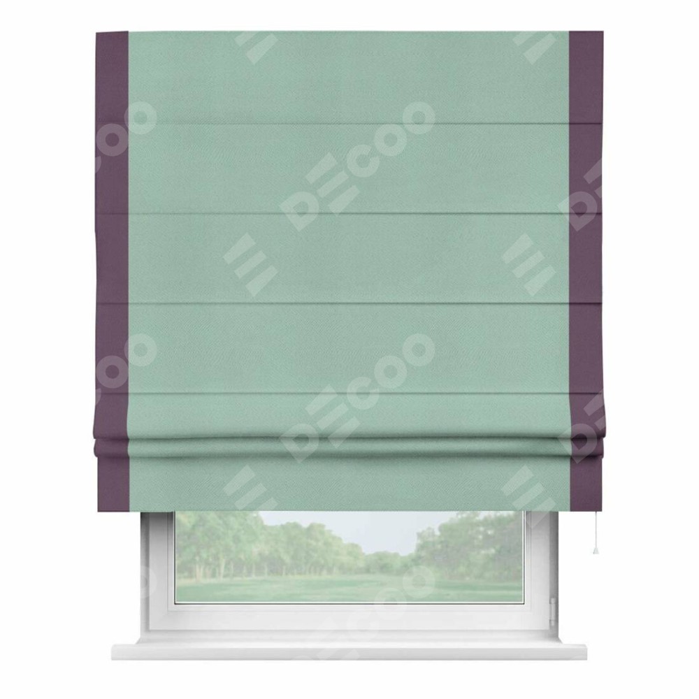 Римская штора производителя «Cortin», используется для проёма, пошита из ткани блэкаут однотонный ментоловый, артикул ткани 29584. Отделка шторы кантом «Стрим Дуо», ткань для канта используется из блэкаута однотонного разной расцветки на выбор. Имеет универсальный механизм и подходит для монтажа: на потолок, на стену и в нишу.