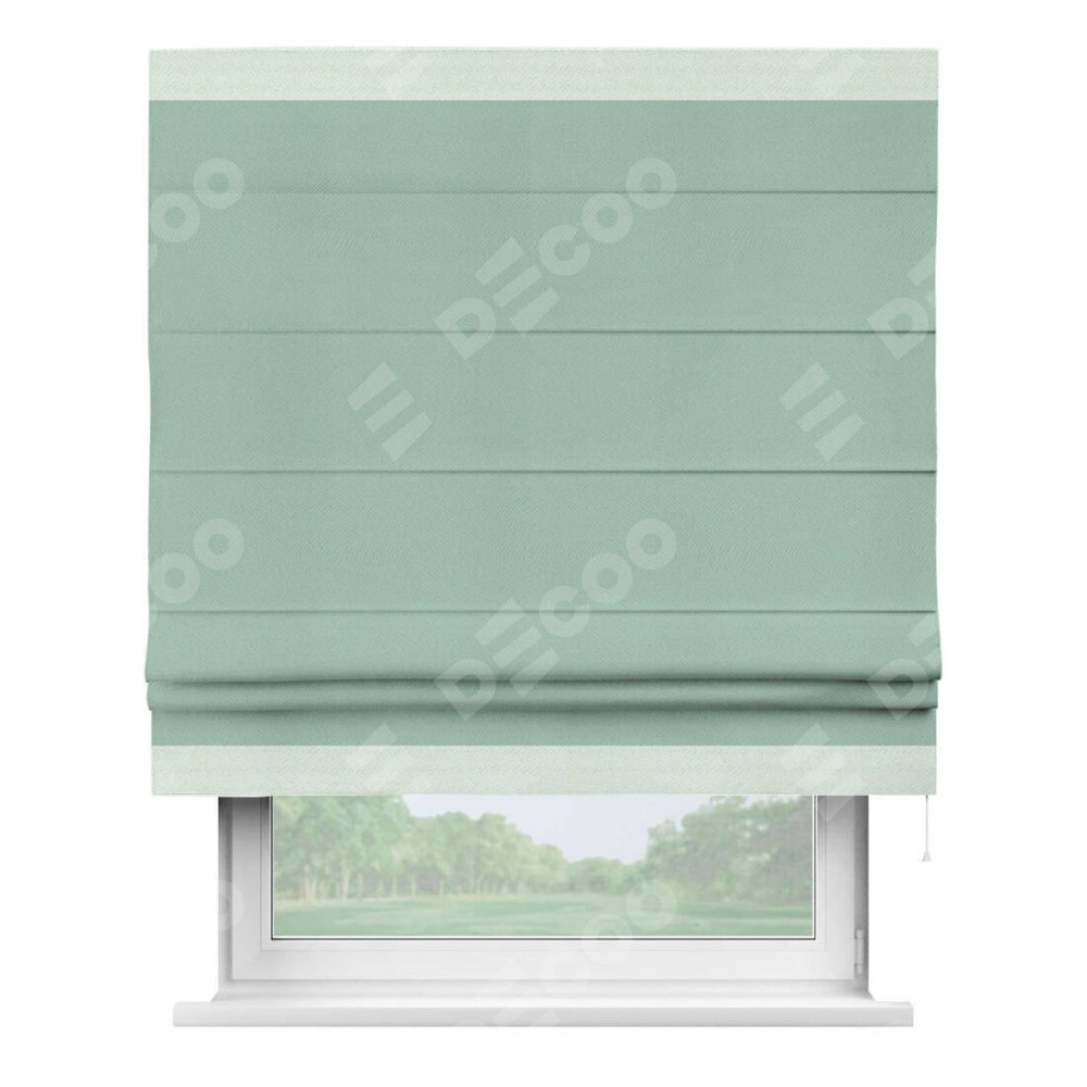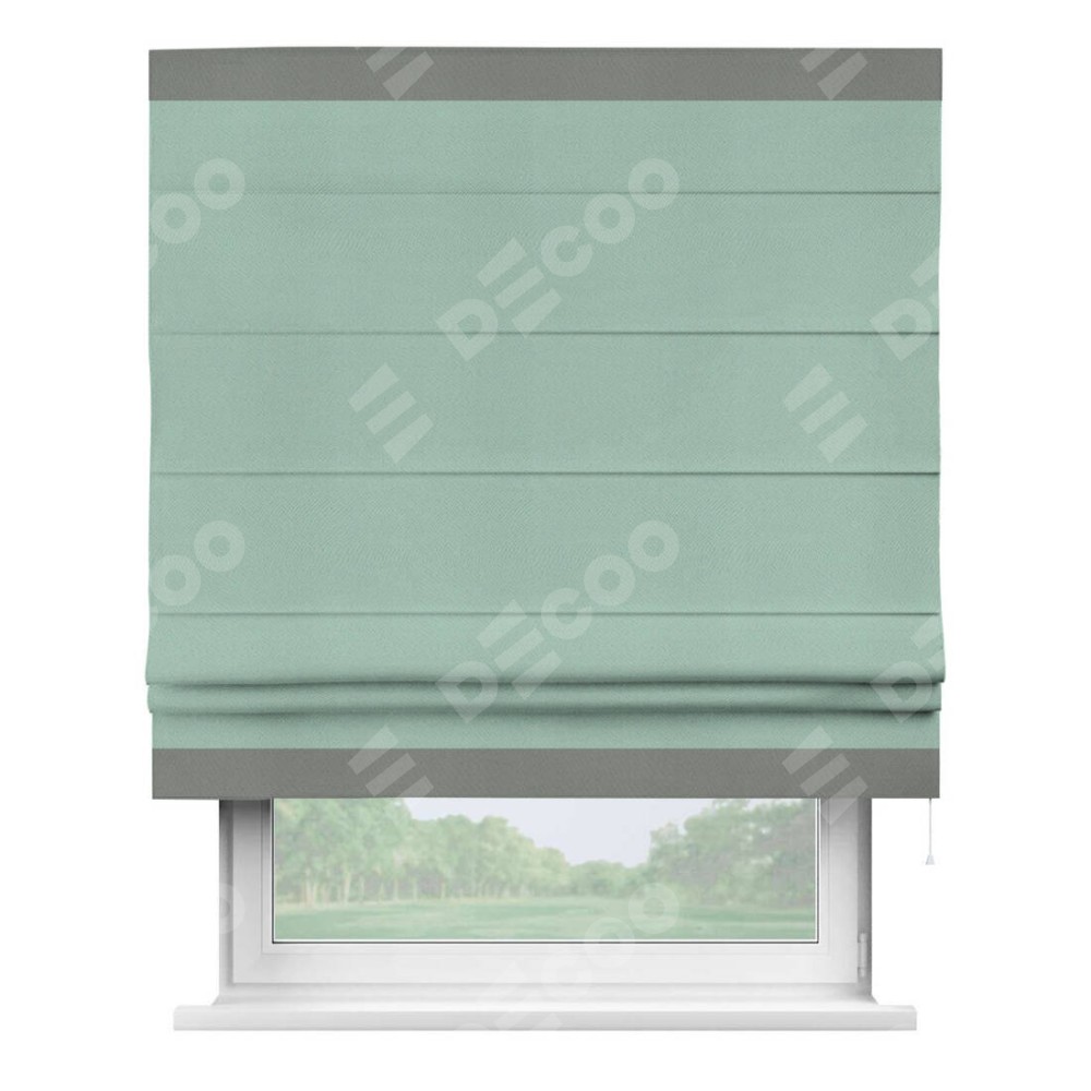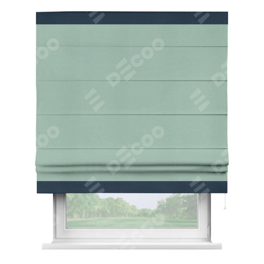 Римская штора производителя «Cortin», используется для проёма, пошита из ткани блэкаут однотонный ментоловый, артикул ткани 29584. Отделка шторы кантом «Горизонт», ткань для канта используется из блэкаута однотонного разной расцветки на выбор. Имеет универсальный механизм и подходит для монтажа: на потолок, на стену и в нишу.