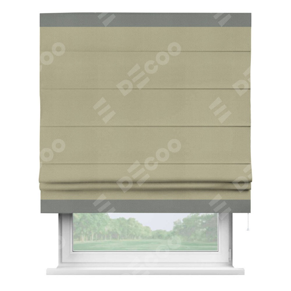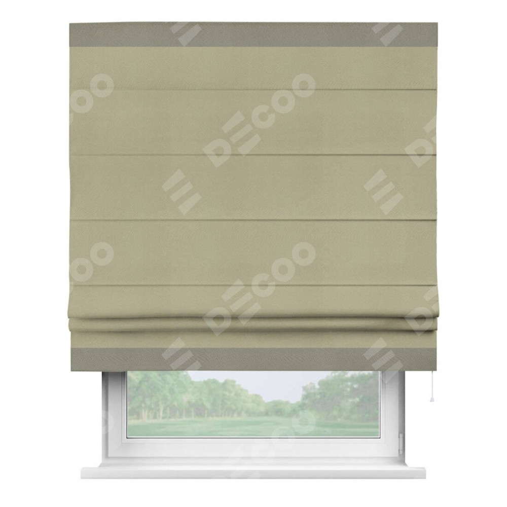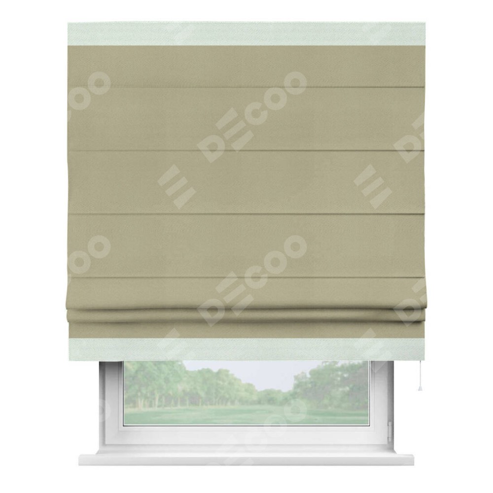 Римская штора производителя «Cortin», используется для проёма, пошита из ткани блэкаут однотонный милано капучино, артикул ткани 06. Отделка шторы кантом «Горизонт», ткань для канта используется из блэкаута однотонного разной расцветки на выбор. Имеет универсальный механизм и подходит для монтажа: на потолок, на стену и в нишу.