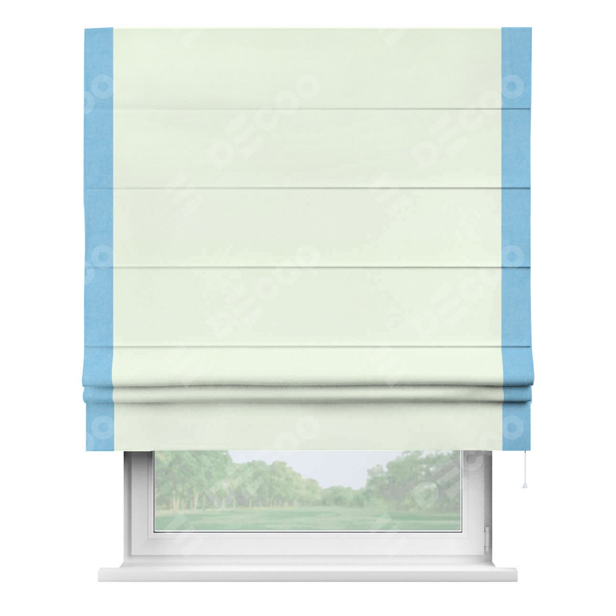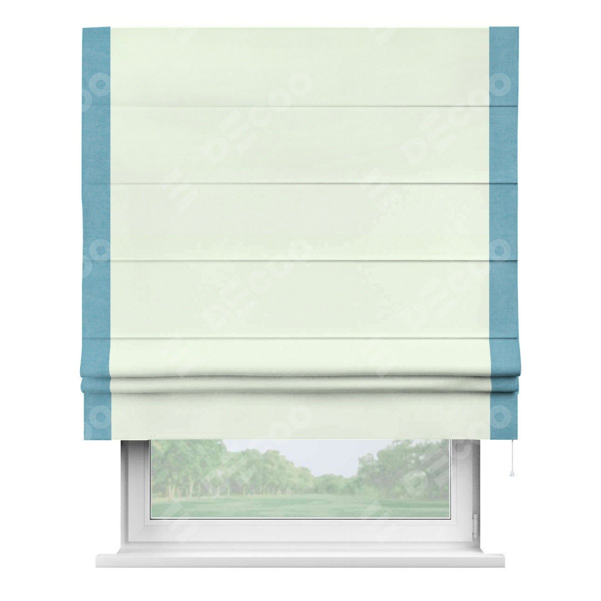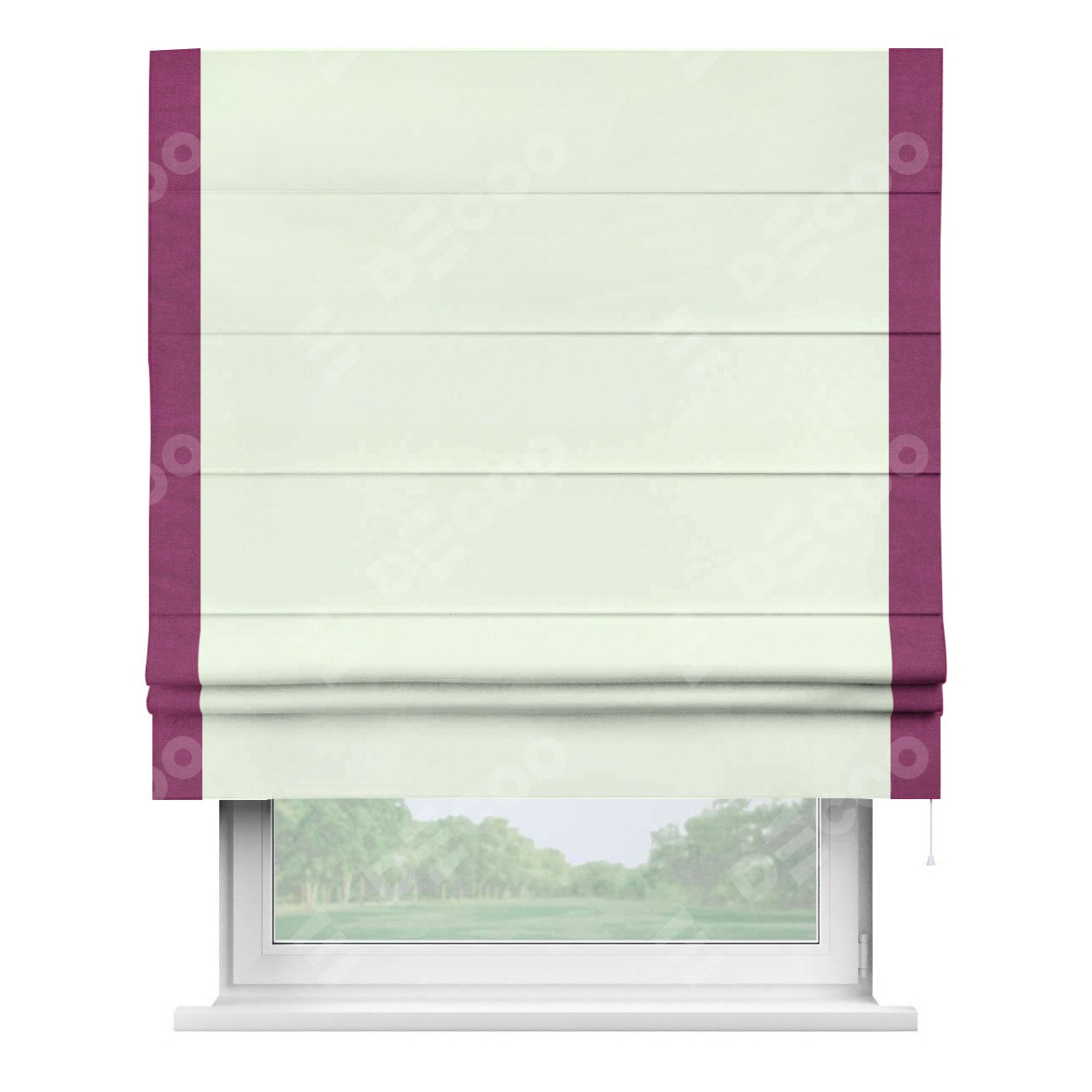Римская штора производителя «Cortin», используется для проёма, пошита из ткани вельвет кремовый, артикул ткани 85524. Отделка шторы кантом «Стрим Дуо», ткань для канта используется из вельвета разной расцветки на выбор. Имеет универсальный механизм и подходит для монтажа: на потолок, на стену и в нишу.