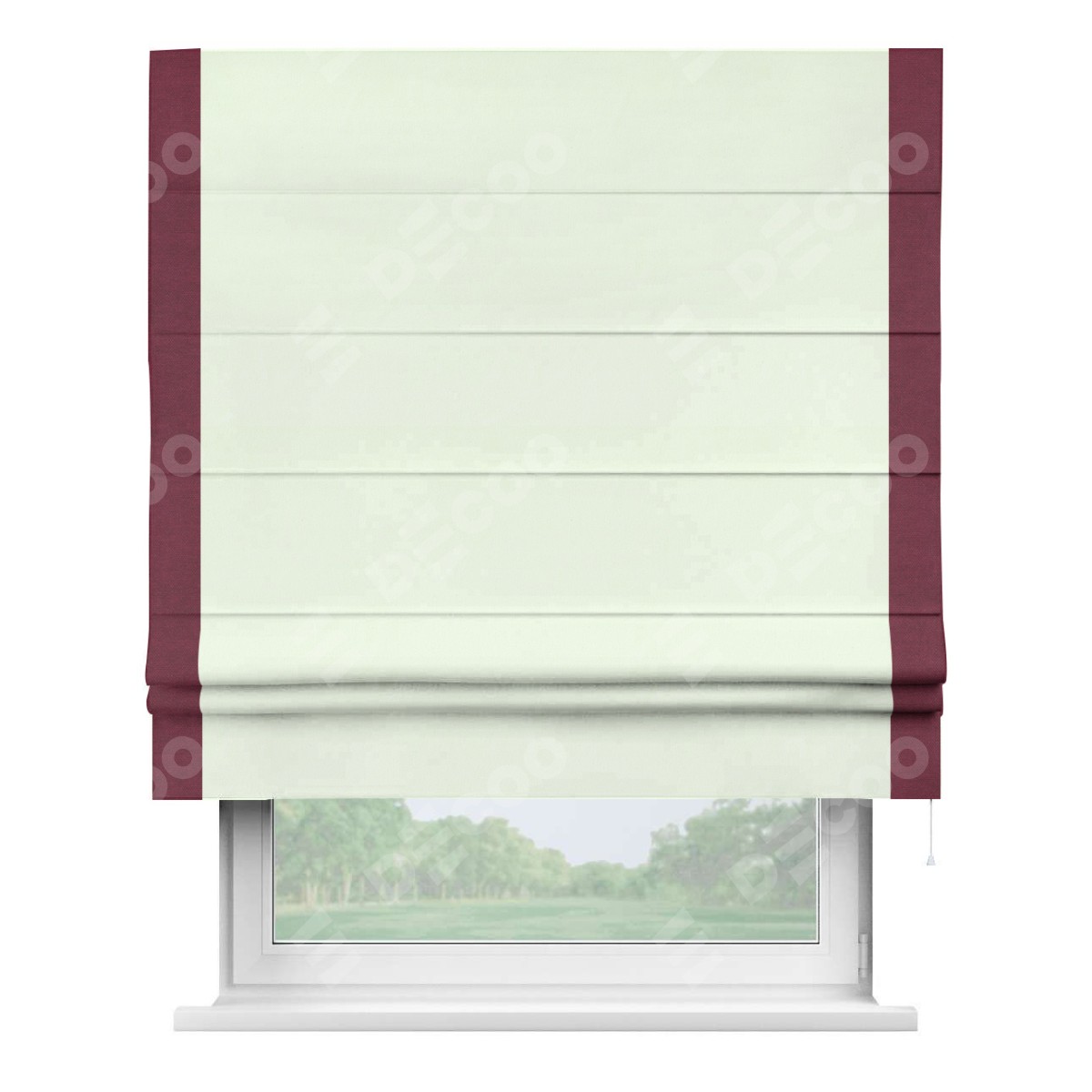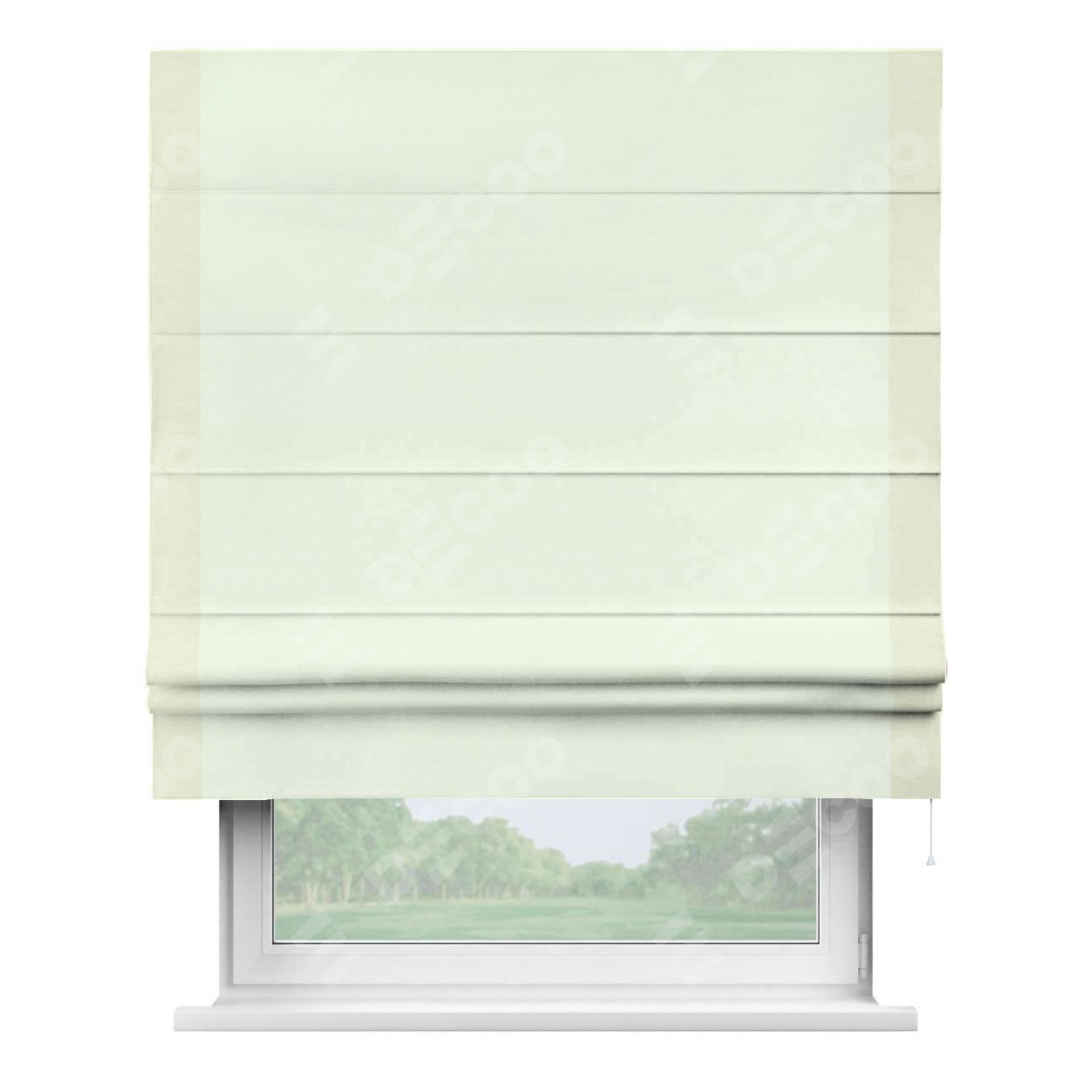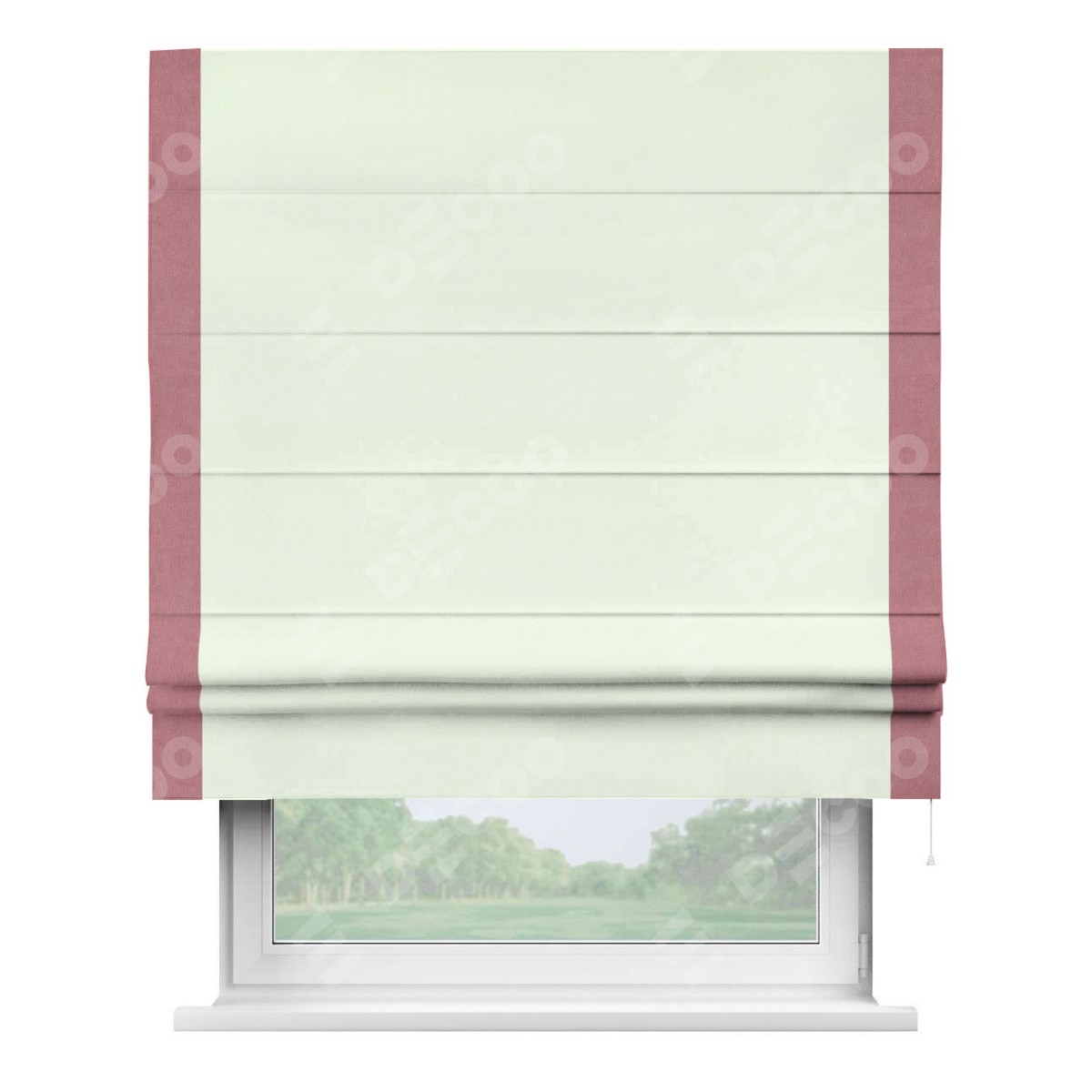 Римская штора производителя «Cortin», используется для проёма, пошита из ткани вельвет кремовый, артикул ткани 85524. Отделка шторы кантом «Стрим Дуо», ткань для канта используется из вельвета разной расцветки на выбор. Имеет универсальный механизм и подходит для монтажа: на потолок, на стену и в нишу.