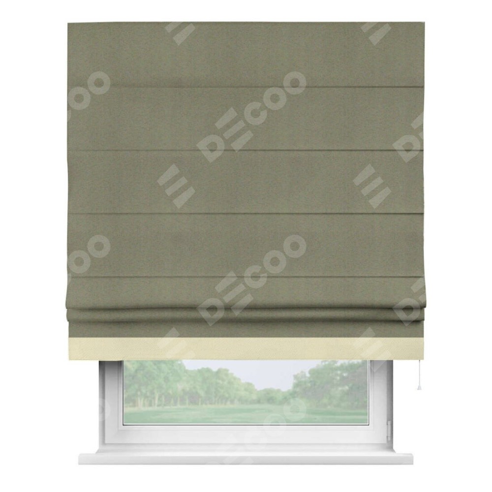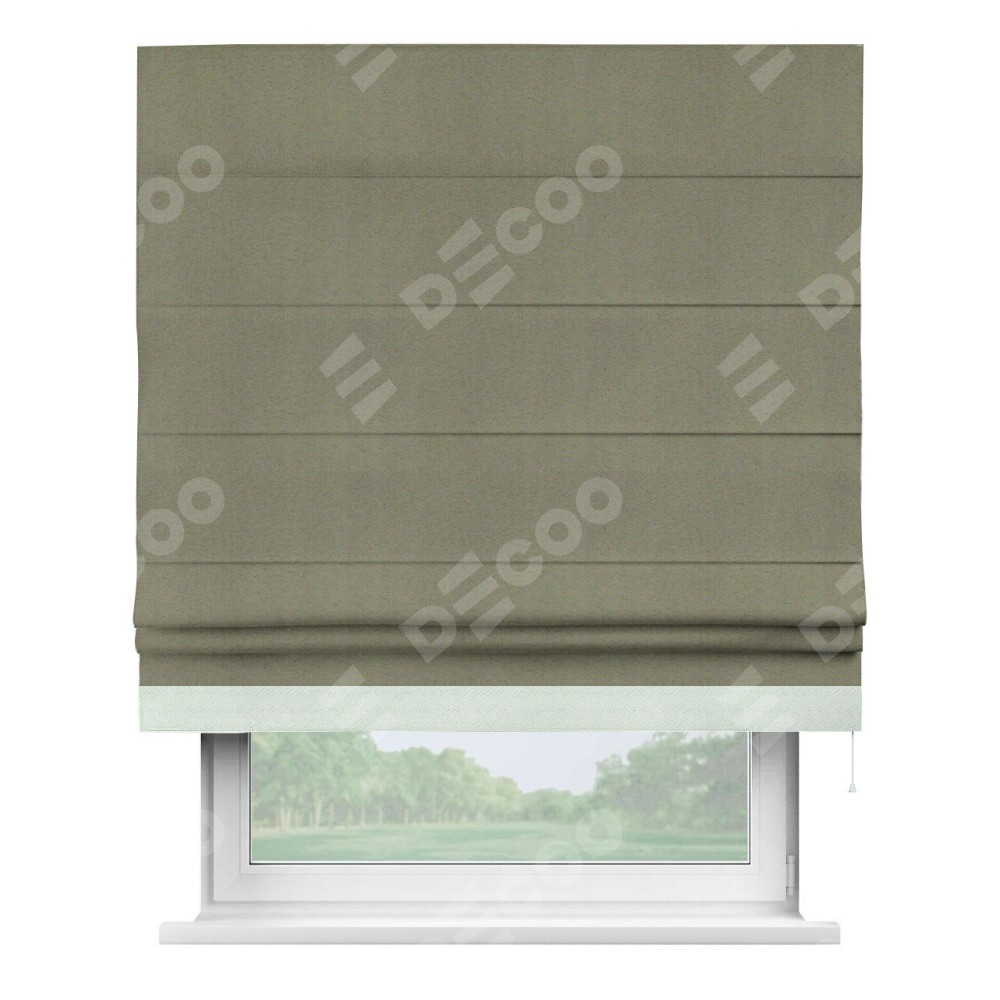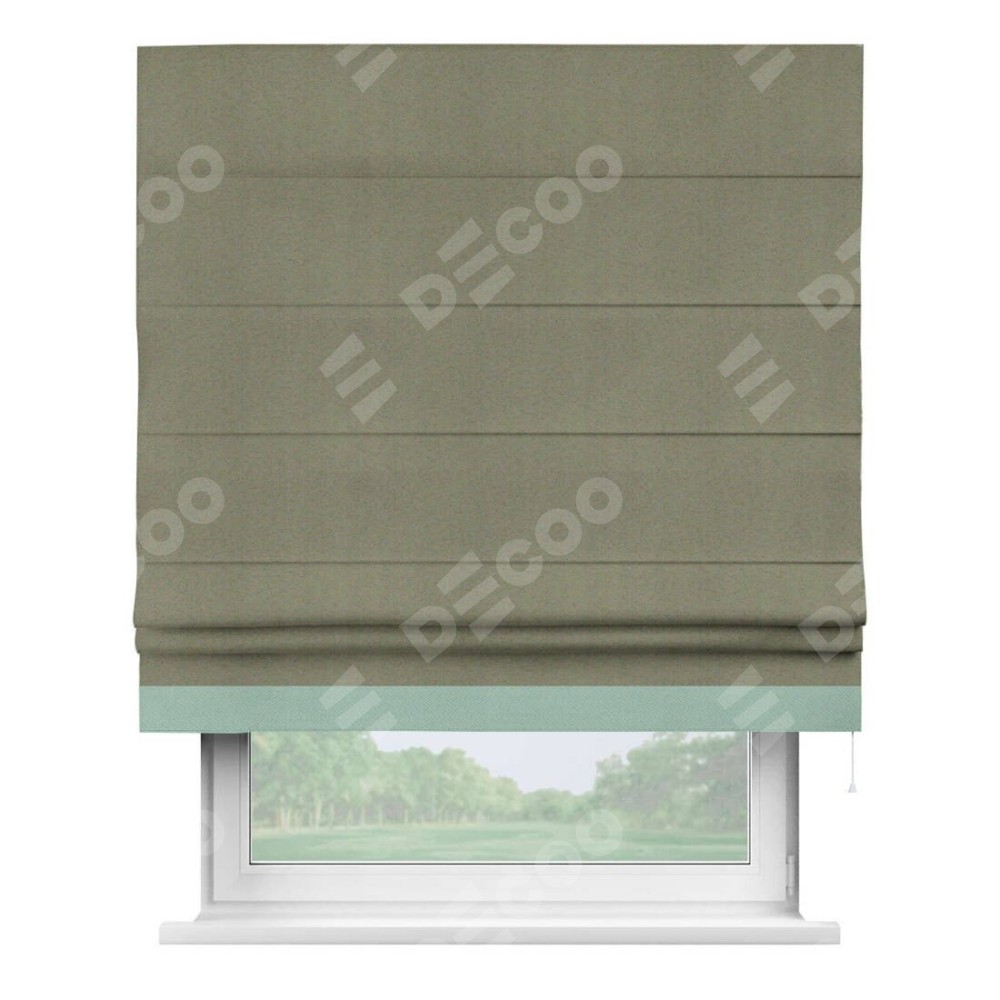 Римская штора производителя «Cortin», используется для проёма, пошита из ткани блэкаут однотонный серо-коричневый, артикул ткани 29568. Отделка шторы кантом «Джестер», ткань для канта используется из блэкаута однотонного разной расцветки на выбор. Имеет универсальный механизм и подходит для монтажа: на потолок, на стену и в нишу.