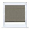 Римская штора кассетного типа, производителя «Cortin», устанавливается только на пластиковые окна и прилегает к стеклопакету, пошита из ткани из ткани блэкаут тиснение с блеском графитовый, артикул 34648. Изнаночная сторона материала черного цвета, что обеспечивает необходимую светонепроницаемость.