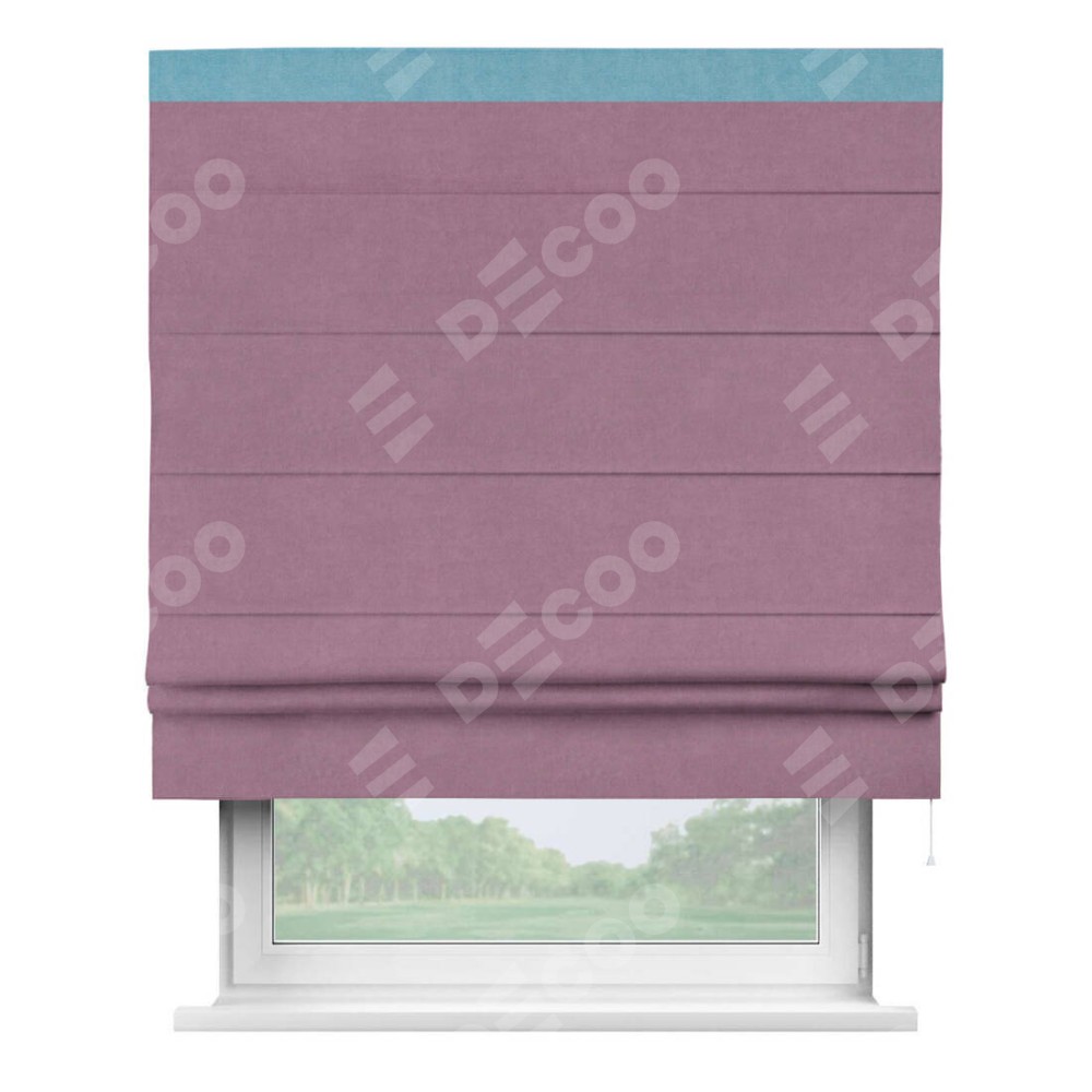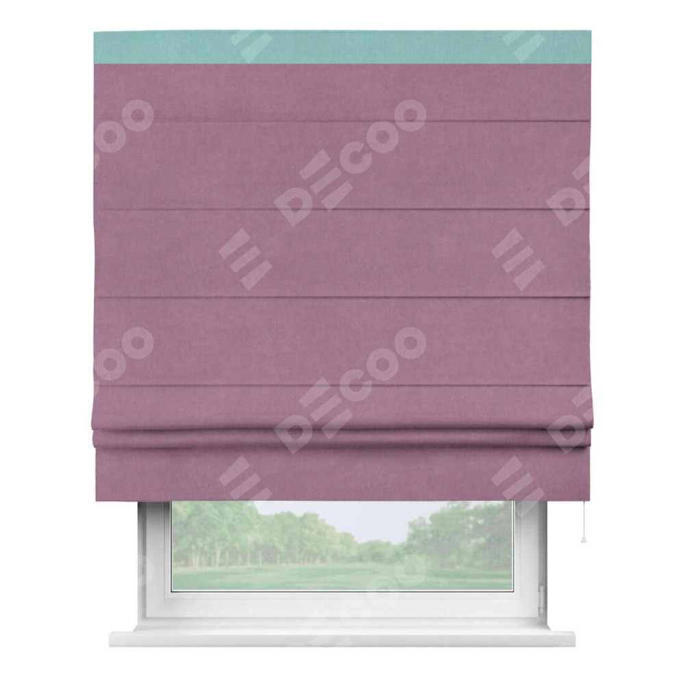 Римская штора производителя «Cortin», используется для проёма, пошита из ткани вельвет лиловый, артикул ткани 17752. Отделка шторы кантом «Кинг», ткань для канта используется из вельвета разной расцветки на выбор. Имеет универсальный механизм и подходит для монтажа: на потолок, на стену и в нишу.
