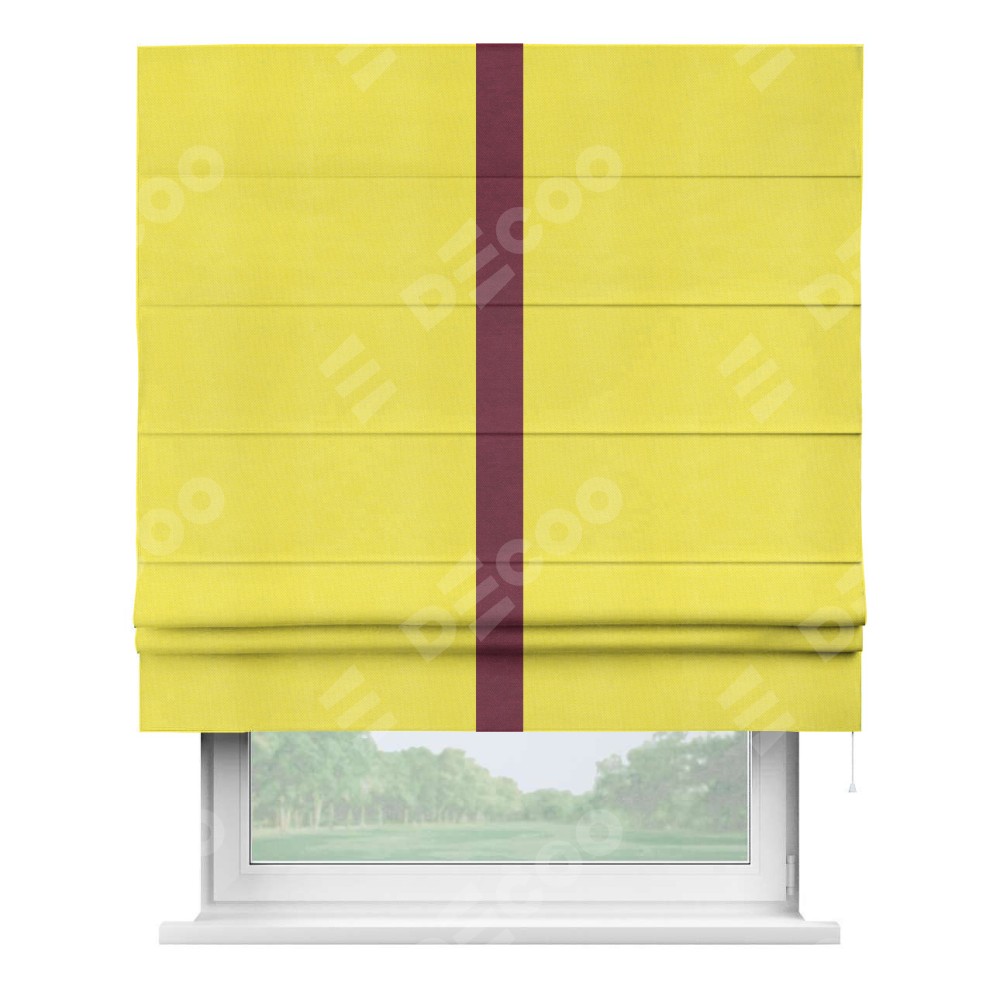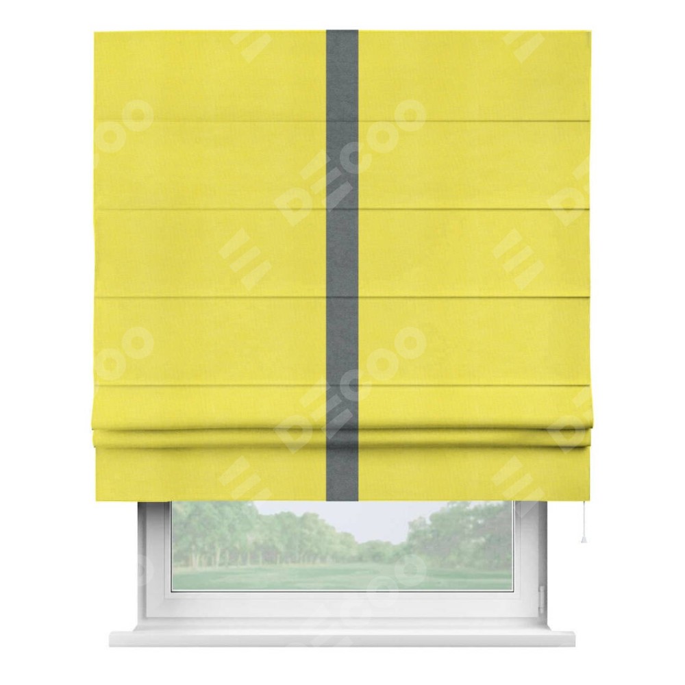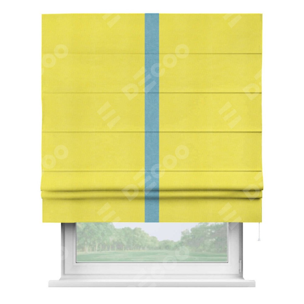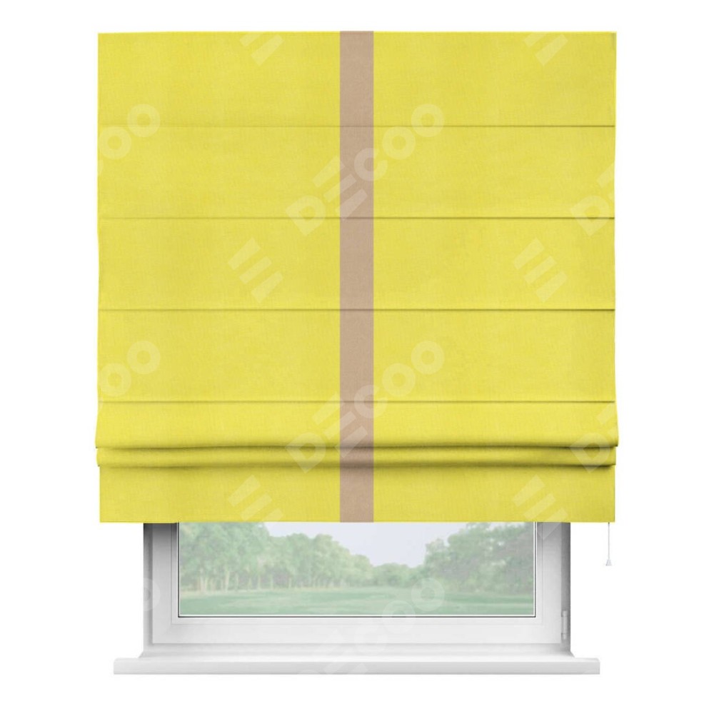 Римская штора производителя «Cortin», используется для проёма, пошита из ткани вельвет cветло-желтый, артикул ткани 30997. Отделка шторы кантом «Хайвей», ткань для канта используется из вельвета разной расцветки на выбор. Имеет универсальный механизм и подходит для монтажа: на потолок, на стену и в нишу.