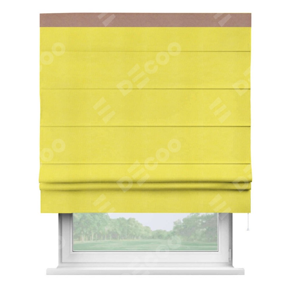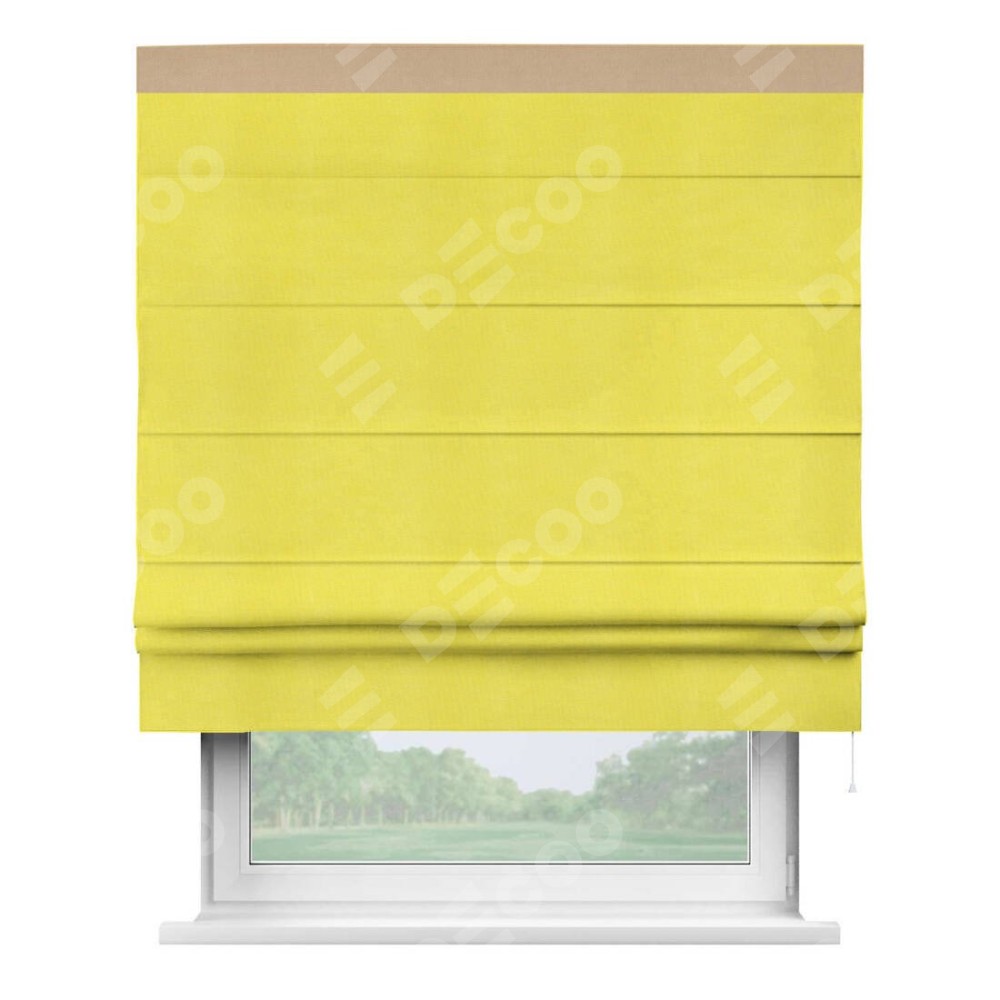Римская штора производителя «Cortin», используется для проёма, пошита из ткани вельвет cветло-желтый, артикул ткани 30997. Отделка шторы кантом «Кинг», ткань для канта используется из вельвета разной расцветки на выбор. Имеет универсальный механизм и подходит для монтажа: на потолок, на стену и в нишу.
