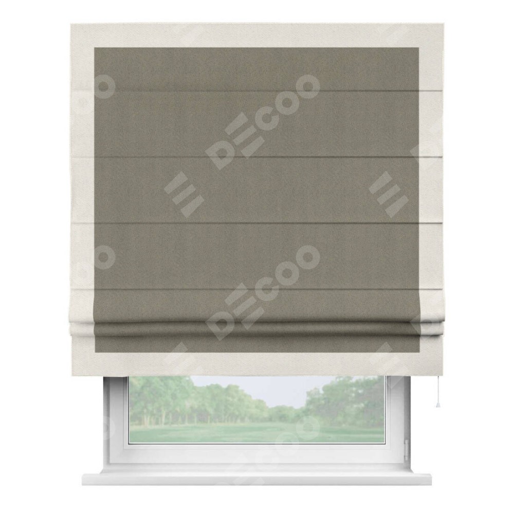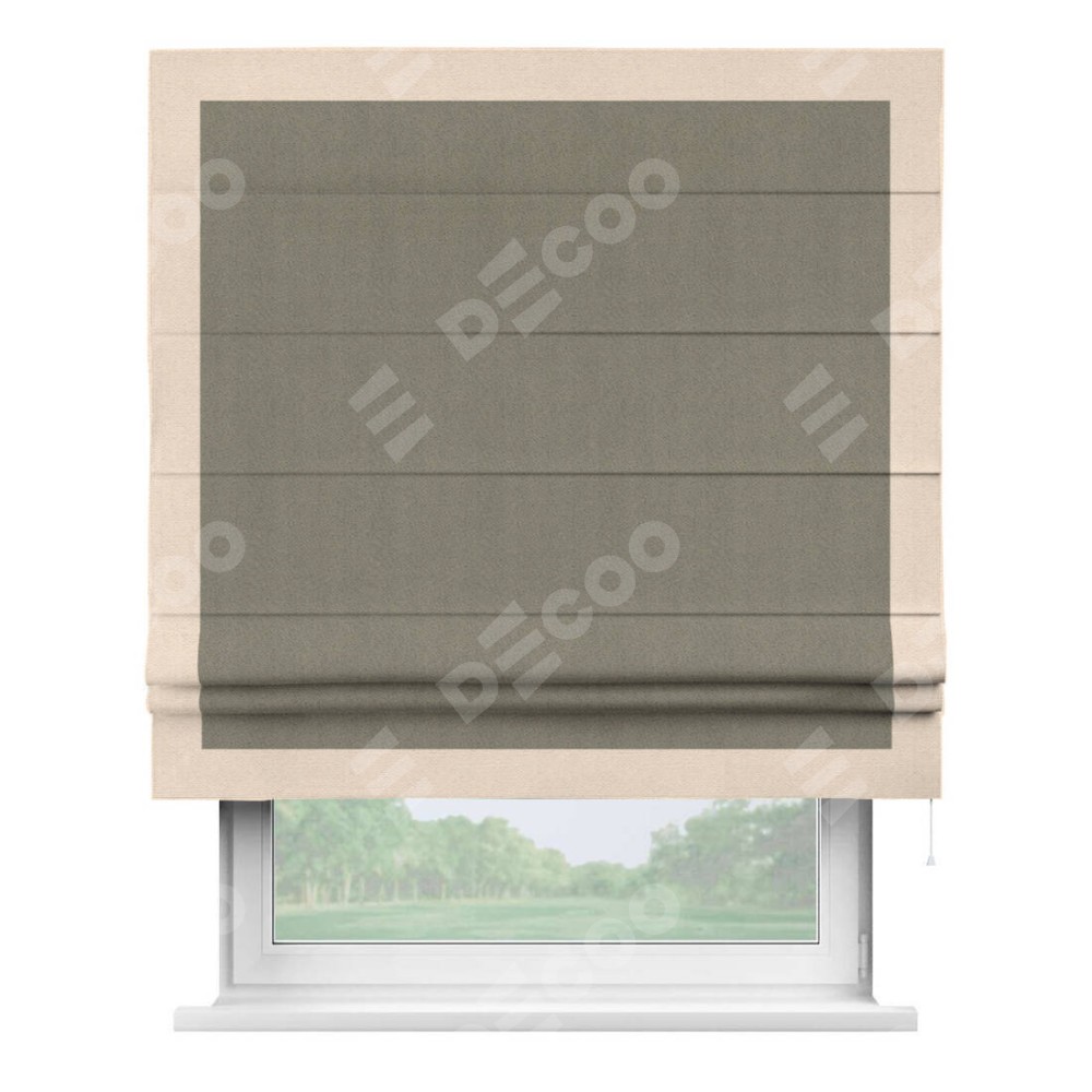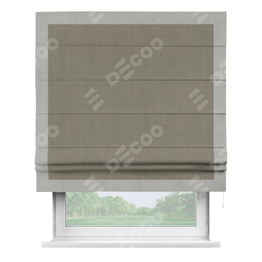 Римская штора производителя «Cortin», используется для проёма, пошита из ткани блэкаут с блеском графитовый, артикул 34648. Отделка шторы кантом «Чесс», ткань для канта используется из блэкаута с блеском разной расцветки на выбор. Изнаночная сторона материала черного цвета, что обеспечивает необходимую светонепроницаемость. Имеет универсальный механизм и подходит для монтажа: на потолок, на стену и в нишу.