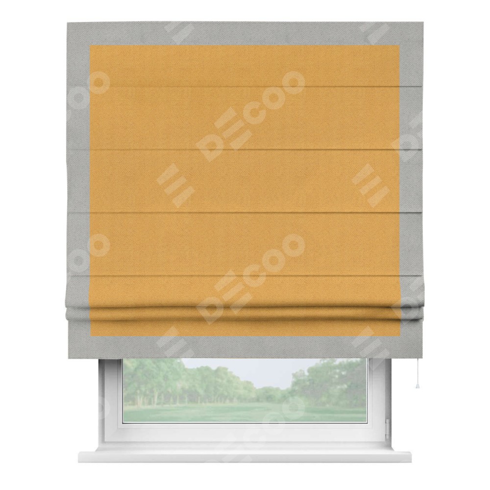 Римская штора производителя «Cortin», используется для проёма, пошита из ткани блэкаут с блеском золотой, артикул 34626. Отделка шторы кантом «Чесс», ткань для канта используется из блэкаута с блеском разной расцветки на выбор. Изнаночная сторона материала черного цвета, что обеспечивает необходимую светонепроницаемость. Имеет универсальный механизм и подходит для монтажа: на потолок, на стену и в нишу.