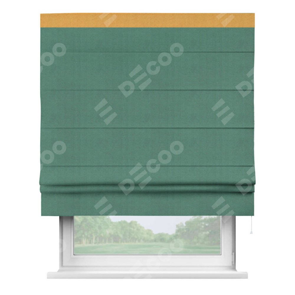 Римская штора производителя «Cortin», используется для проёма, пошита из ткани блэкаут с блеском изумрудный, артикул 34628. Отделка шторы кантом «Кинг», ткань для канта используется из блэкаута с блеском разной расцветки на выбор. Изнаночная сторона материала черного цвета, что обеспечивает необходимую светонепроницаемость. Имеет универсальный механизм и подходит для монтажа: на потолок, на стену и в нишу.