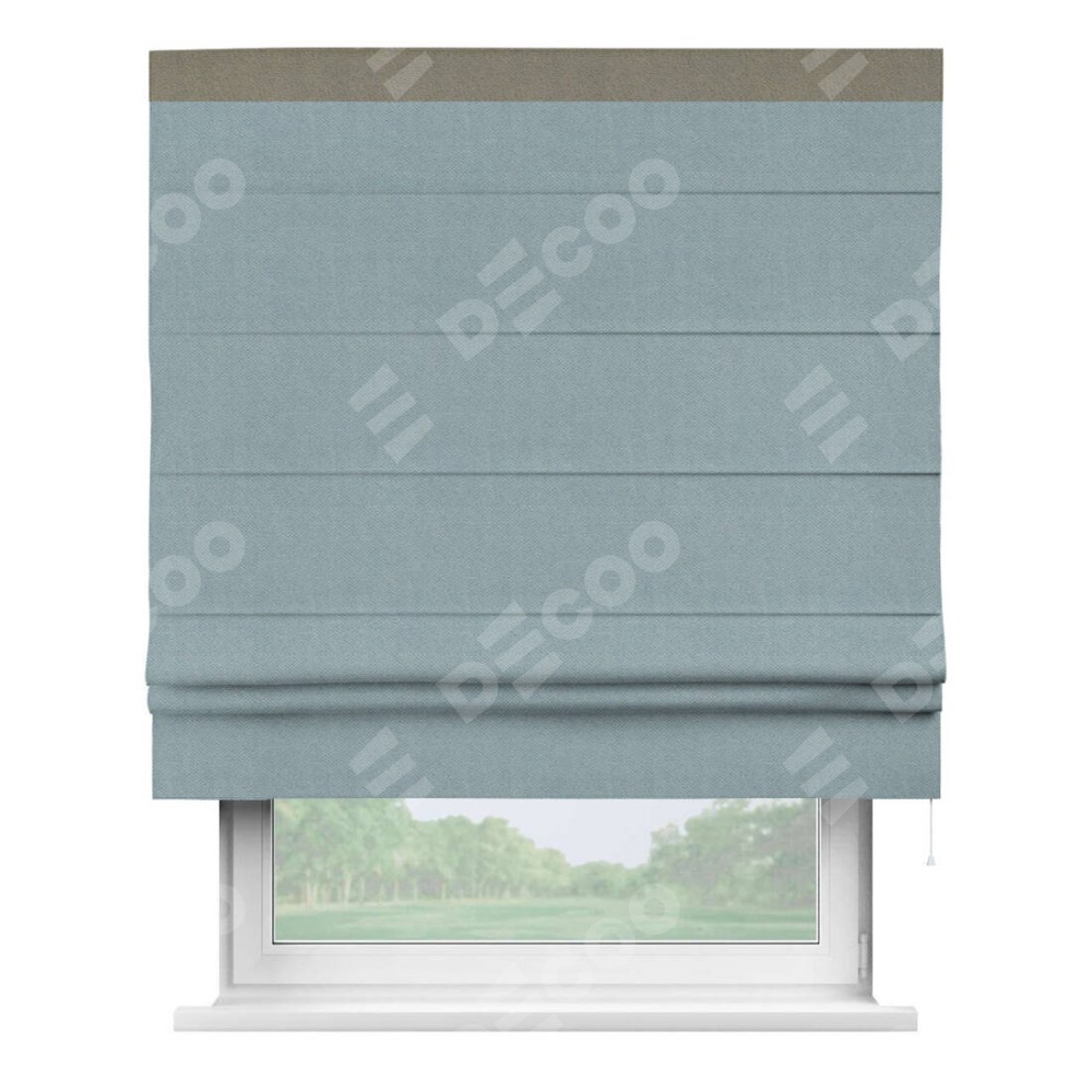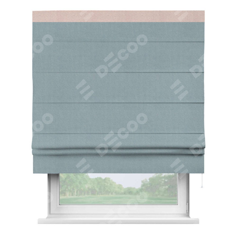 Римская штора производителя «Cortin», используется для проёма, пошита из ткани блэкаут с блеском синий, артикул 34625. Отделка шторы кантом «Кинг», ткань для канта используется из блэкаута с блеском разной расцветки на выбор. Изнаночная сторона материала черного цвета, что обеспечивает необходимую светонепроницаемость. Имеет универсальный механизм и подходит для монтажа: на потолок, на стену и в нишу.
