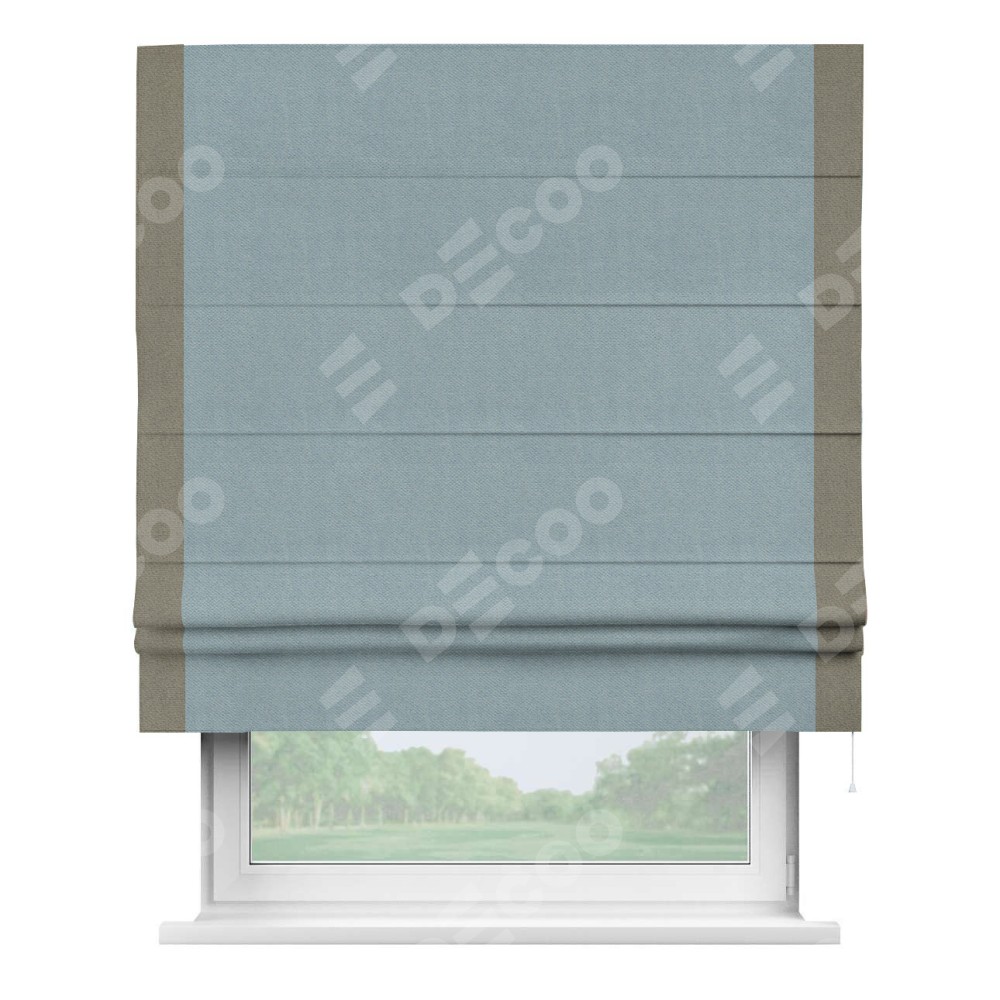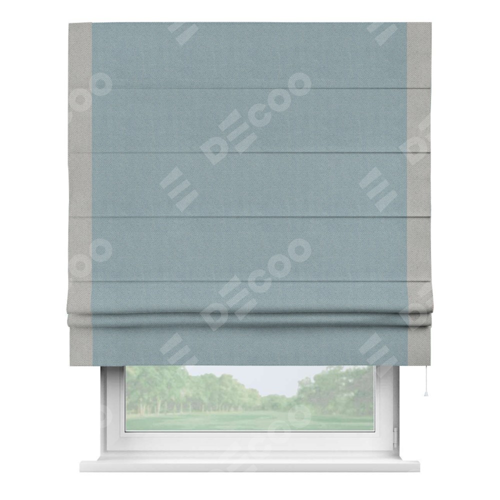 Римская штора производителя «Cortin», используется для проёма, пошита из ткани блэкаут с блеском синий, артикул 34625. Отделка шторы кантом «Стрим Дуо», ткань для канта используется из блэкаута с блеском разной расцветки на выбор. Изнаночная сторона материала черного цвета, что обеспечивает необходимую светонепроницаемость. Имеет универсальный механизм и подходит для монтажа: на потолок, на стену и в нишу.