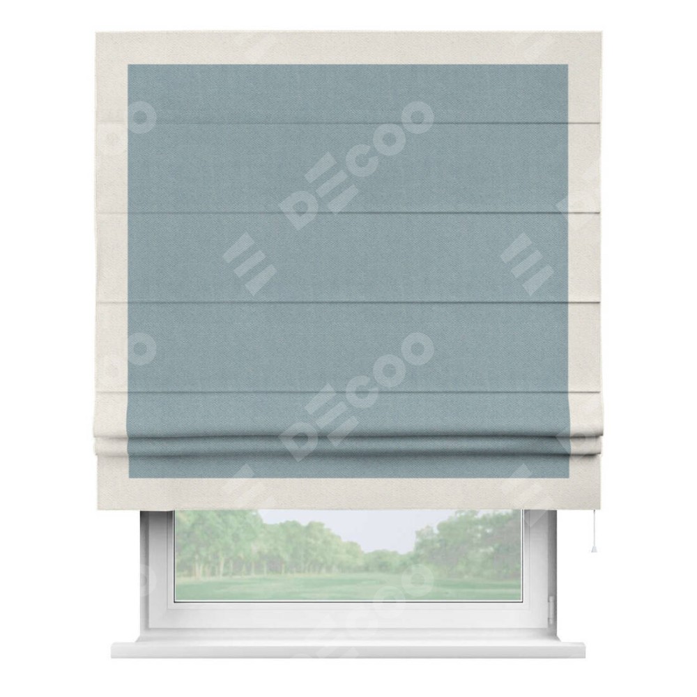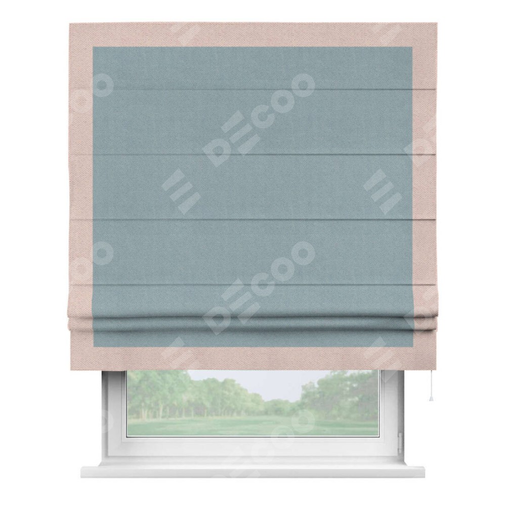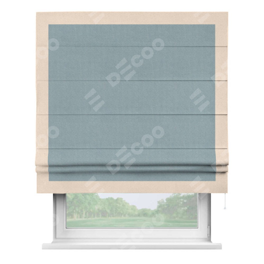 Римская штора производителя «Cortin», используется для проёма, пошита из ткани блэкаут с блеском синий, артикул 34625. Отделка шторы кантом «Чесс», ткань для канта используется из блэкаута с блеском разной расцветки на выбор. Изнаночная сторона материала черного цвета, что обеспечивает необходимую светонепроницаемость. Имеет универсальный механизм и подходит для монтажа: на потолок, на стену и в нишу.