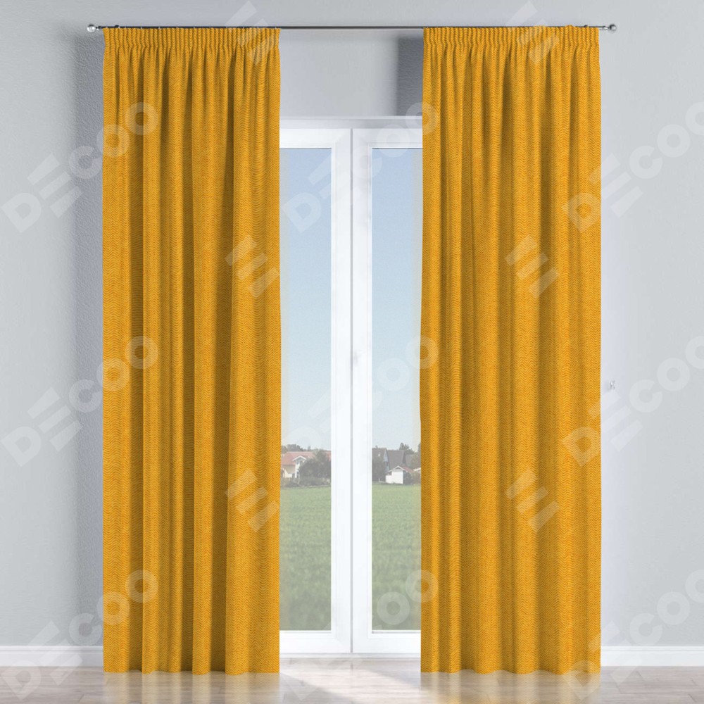 Комплект прямых штор, от производителя «Cortin», пошиты из ткани твид блэкаут медово-желтый, артикул ткани 21641. С изнаночной стороны в верхней части штор пристрачивается шторная лента с декоративными складками «Карандаш». Для создания элегантных складок прямые шторы шьются по стандарту с коэффициентом 1:2 (на 100 см. ширины проёма 200 см. ширины ткани).