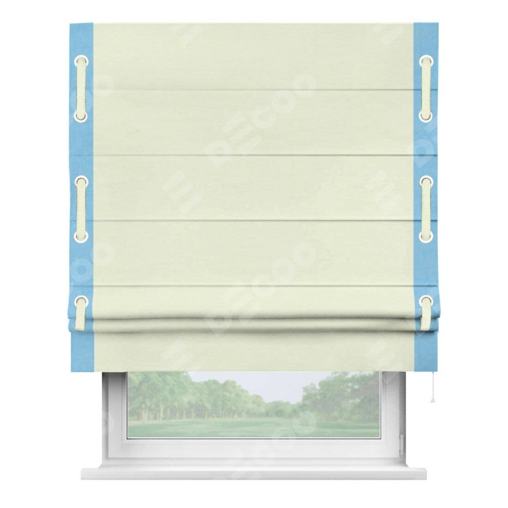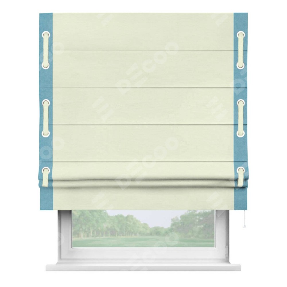 Римская штора производителя «Cortin», используется для проёма, пошита из ткани вельвет молочный, артикул ткани 85536. Отделка шторы кантом «Стрим Дуо» на кантах расположены люверсы с пояском, ткань для канта используется из вельвета разной расцветки на выбор. Ткань для пояска обычно используется из основной ткани шторы, а так же можно сделать из любой расцветки по желанию. Имеет универсальный механизм и подходит для монтажа: на потолок, на стену и в нишу.