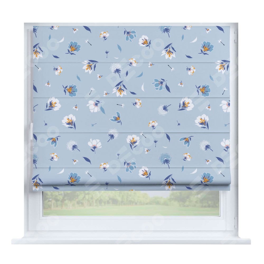 Римская штора производителя «Cortin», устанавливается на створку окна, пошита из ткани блэкаут с нанесением сублимационной печати «Голубые цветы». Штора шьётся по индивидуальным размерам, для данного типа римской шторы возможная ширина от 35 до 150 см., высота до 250 см.