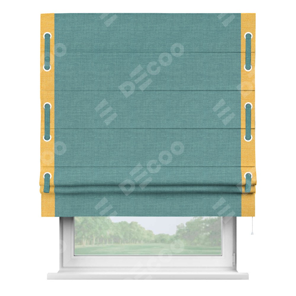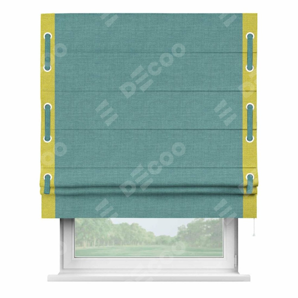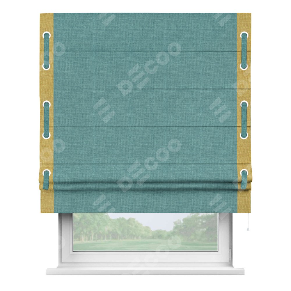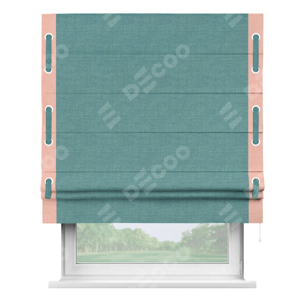 Римская штора производителя «Cortin», используется для проёма, пошита из ткани лён бирюза, артикул 7446. Отделка шторы кантом «Стрим Дуо» на кантах расположены люверсы с пояском, ткань для канта используется из льна разной расцветки на выбор. Ткань для пояска обычно используется из основной ткани шторы, а так же можно сделать из любой расцветки по желанию. Имеет универсальный механизм и подходит для монтажа: на потолок, на стену и в нишу.