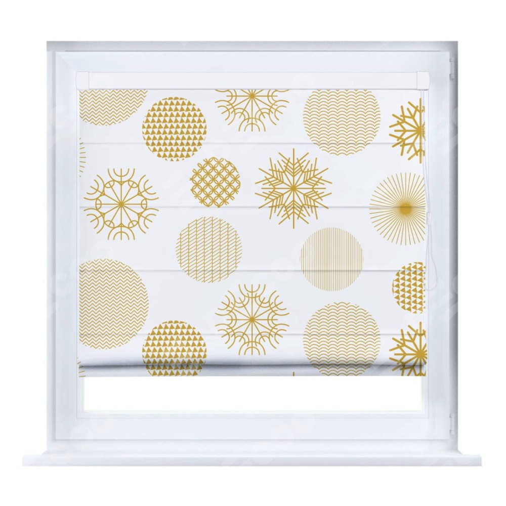Римская штора производителя «Cortin», устанавливается на створку окна, пошита из ткани блэкаут с нанесением сублимационной печати «Золотые шары». Штора шьётся по индивидуальным размерам, для данного типа римской шторы возможная ширина от 35 до 150 см., высота до 250 см.