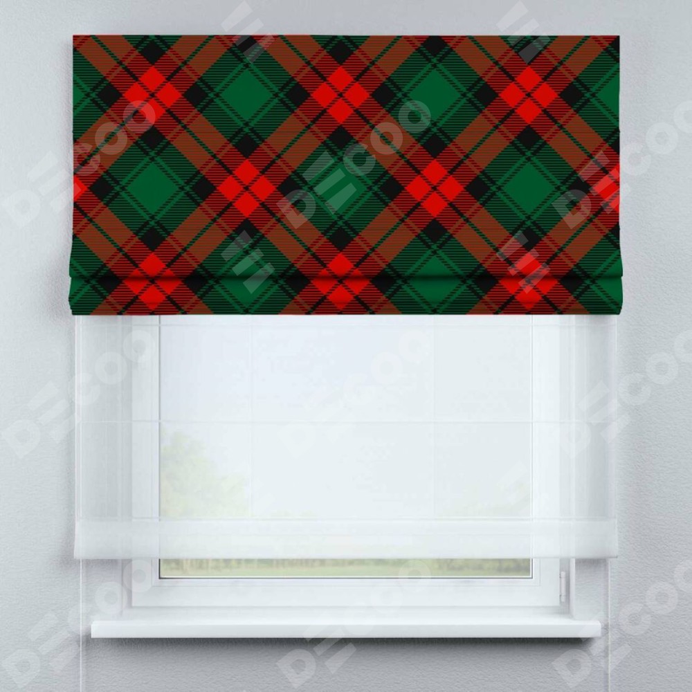 Римская штора день-ночь производителя «Cortin», используется для проёма, пошита из двух полотен, с лицевой блэкаут с нанесением сублимационной печати «Красно-зелёная клетка», вторая ткань тюль (по стандарту комплектуется тюль белого цвета артикул V-01). Имеет универсальный механизм и подходит для монтажа: на потолок, на стену и в нишу.