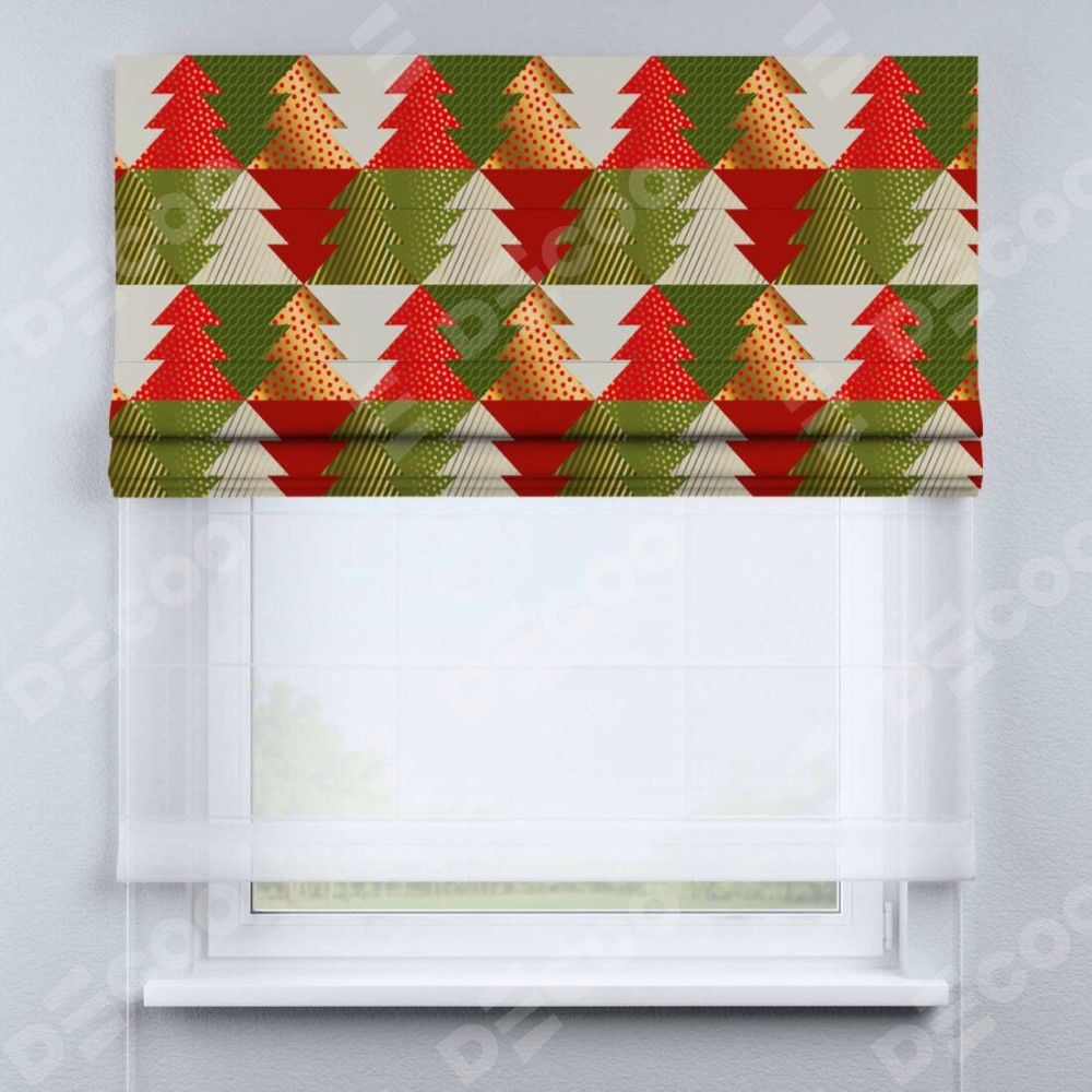 Римская штора день-ночь производителя «Cortin», используется для проёма, пошита из двух полотен, с лицевой блэкаут с нанесением сублимационной печати «Новогоднее украшение», вторая ткань тюль (по стандарту комплектуется тюль белого цвета артикул V-01). Имеет универсальный механизм и подходит для монтажа: на потолок, на стену и в нишу.