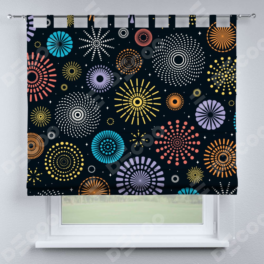 Римская штора производителя «Cortin», используется для проёма, пошита из ткани блэкаут с нанесением сублимационной печати «Праздничный фейерверк». Данная модель пошита на петлях, комплектуется на выбор круглым карнизом и подходит для монтажа на стену. Римская штора на петлях имеет простую систему регулировки высоты, отличительным преимуществом данной модели является простой способ монтажа. Достаточно повесить ее на трубу и штора готова!