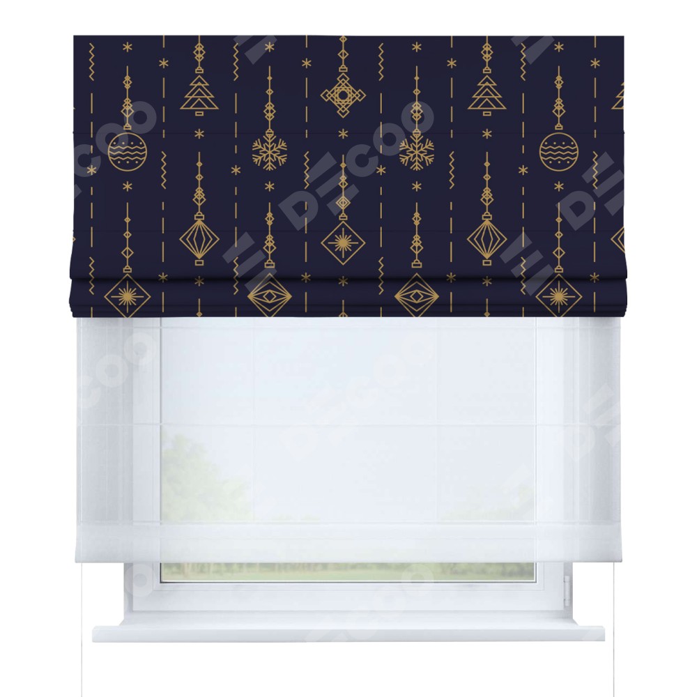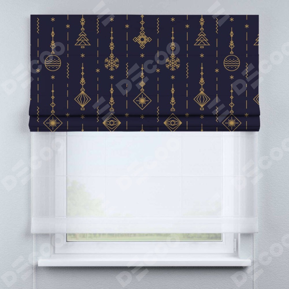 Римская штора день-ночь производителя «Cortin», используется для проёма, пошита из двух полотен, с лицевой блэкаут с нанесением сублимационной печати «Сияние гирлянд», вторая ткань тюль (по стандарту комплектуется тюль белого цвета артикул V-01). Имеет универсальный механизм и подходит для монтажа: на потолок, на стену и в нишу.