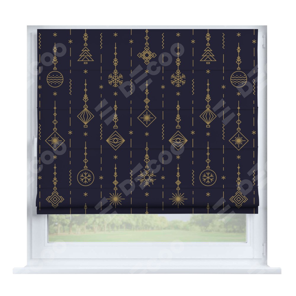 Римская штора производителя «Cortin», устанавливается на створку окна, пошита из ткани блэкаут с нанесением сублимационной печати «Сияние гирлянд». Штора шьётся по индивидуальным размерам, для данного типа римской шторы возможная ширина от 35 до 150 см., высота до 250 см.