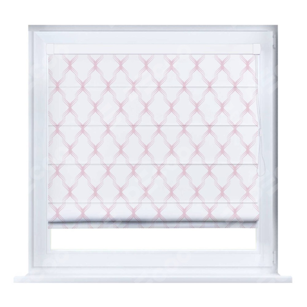 Римская штора производителя «Cortin», устанавливается на створку окна, пошита из ткани блэкаут с нанесением сублимационной печати «Розовые ромбы». Штора шьётся по индивидуальным размерам, для данного типа римской шторы возможная ширина от 35 до 150 см., высота до 250 см.