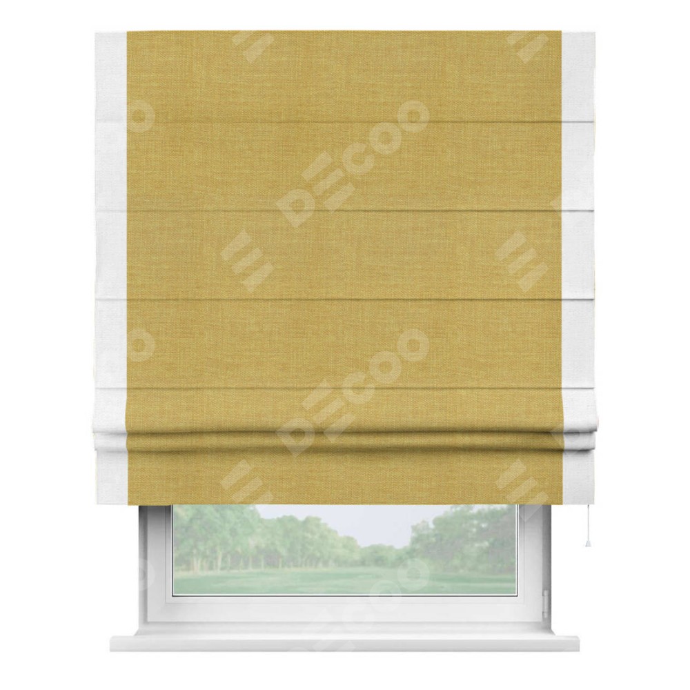 Римская штора производителя «Cortin», используется для проёма, пошита из ткани лён горчичный, артикул 74740. Отделка шторы кантом «Стрим Дуо», ткань для канта используется из льна разной расцветки на выбор. Имеет универсальный механизм и подходит для монтажа: на потолок, на стену и в нишу.