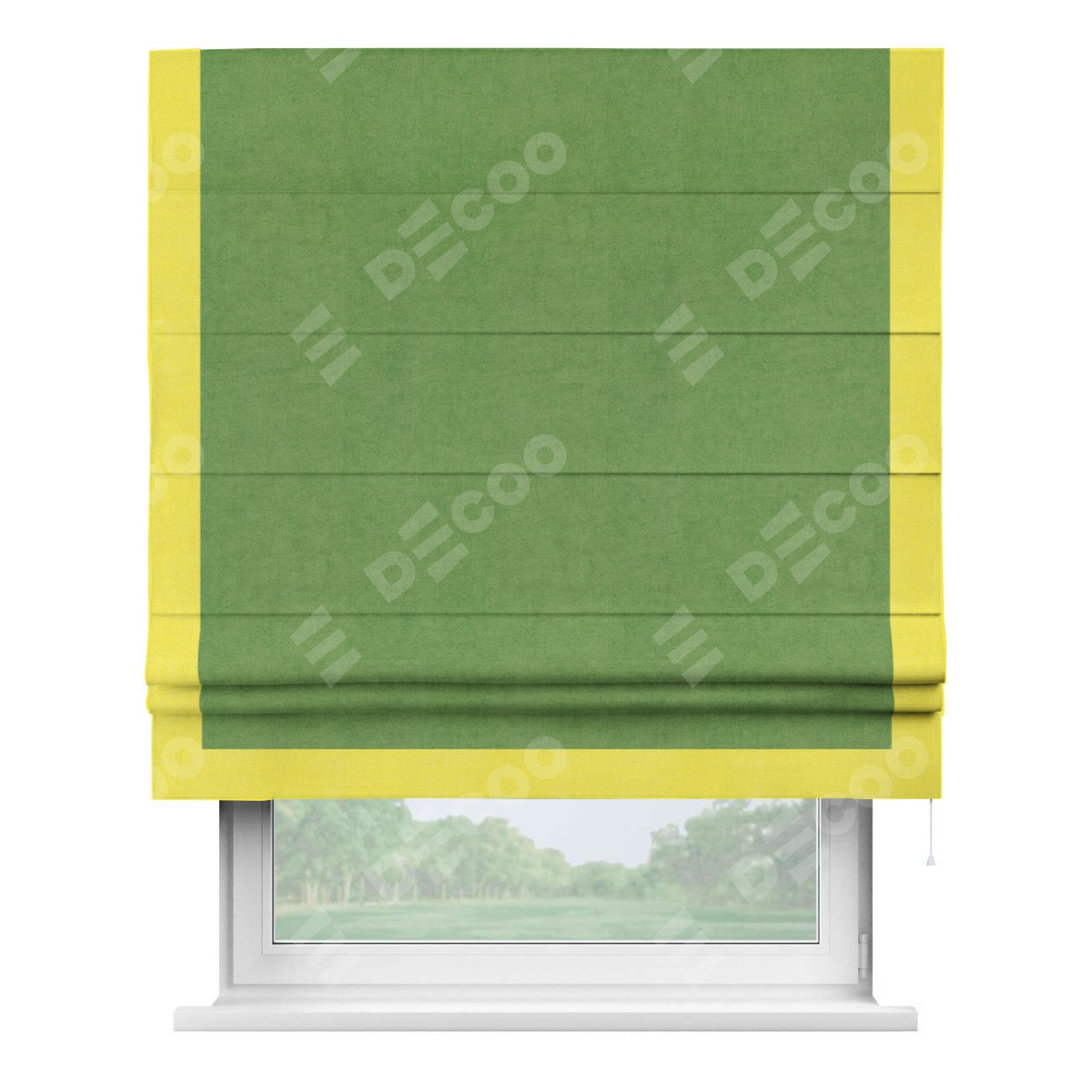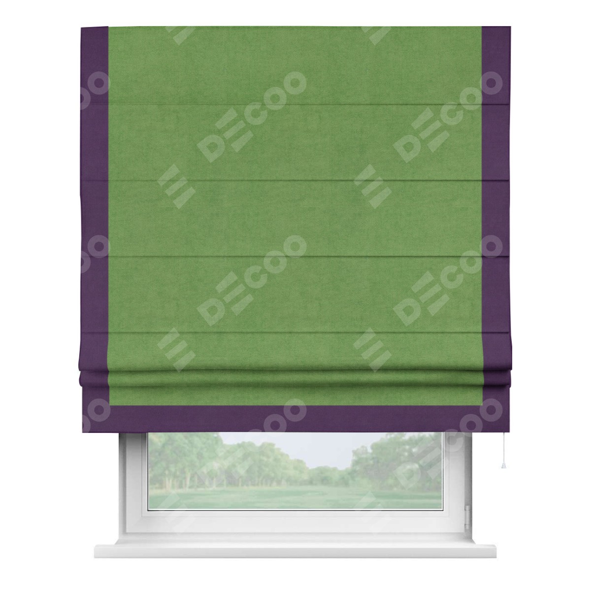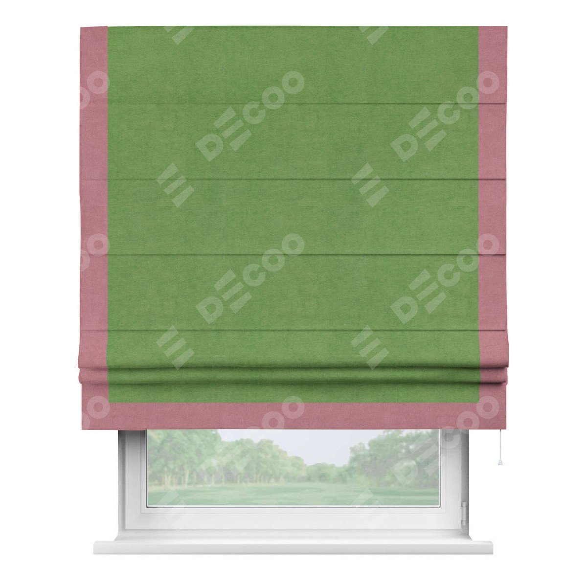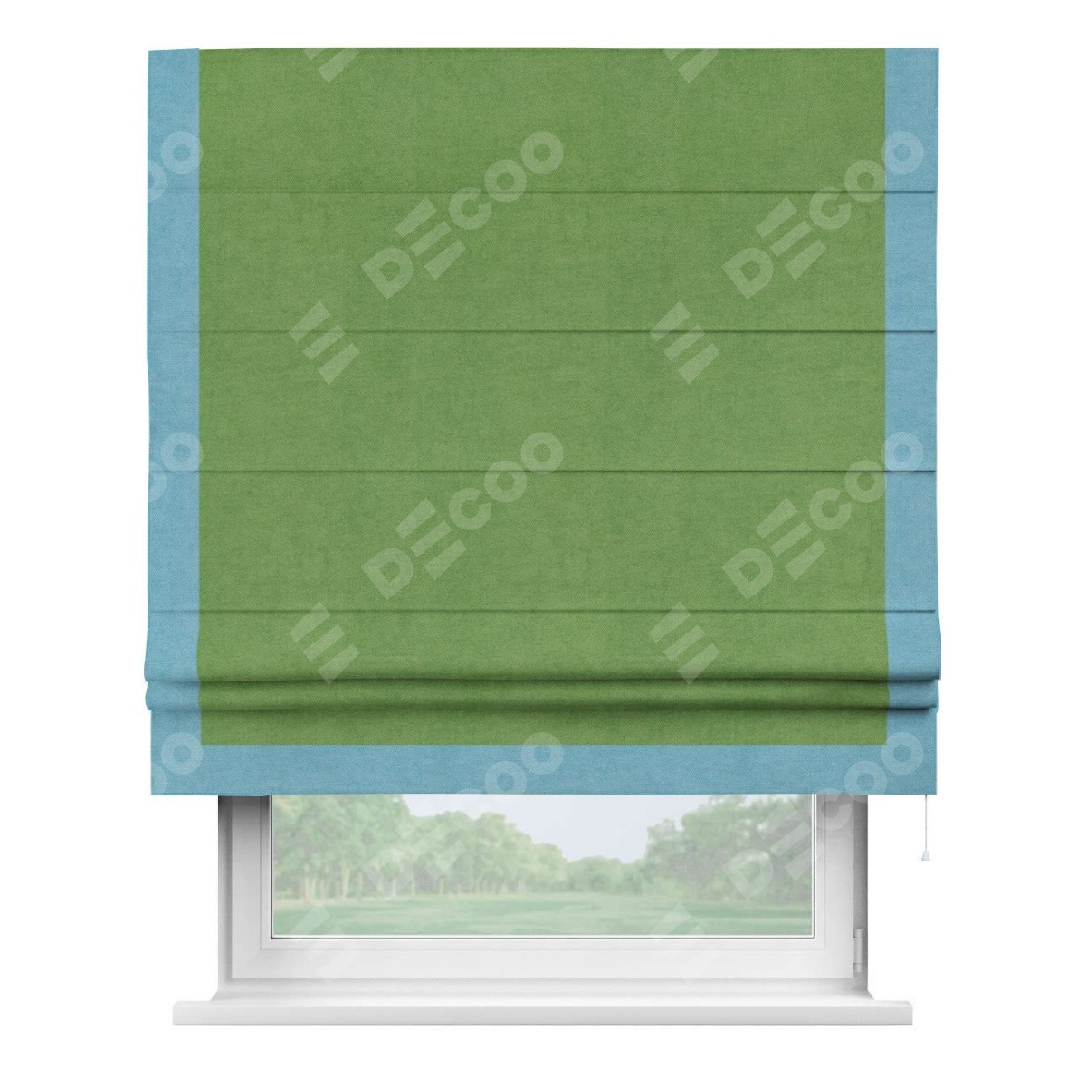 Римская штора производителя «Cortin», используется для проёма, пошита из ткани вельвет салатовый, артикул ткани 87072. Отделка шторы кантом «Виктория», ткань для канта используется из вельвета разной расцветки на выбор. Имеет универсальный механизм и подходит для монтажа: на потолок, на стену и в нишу.