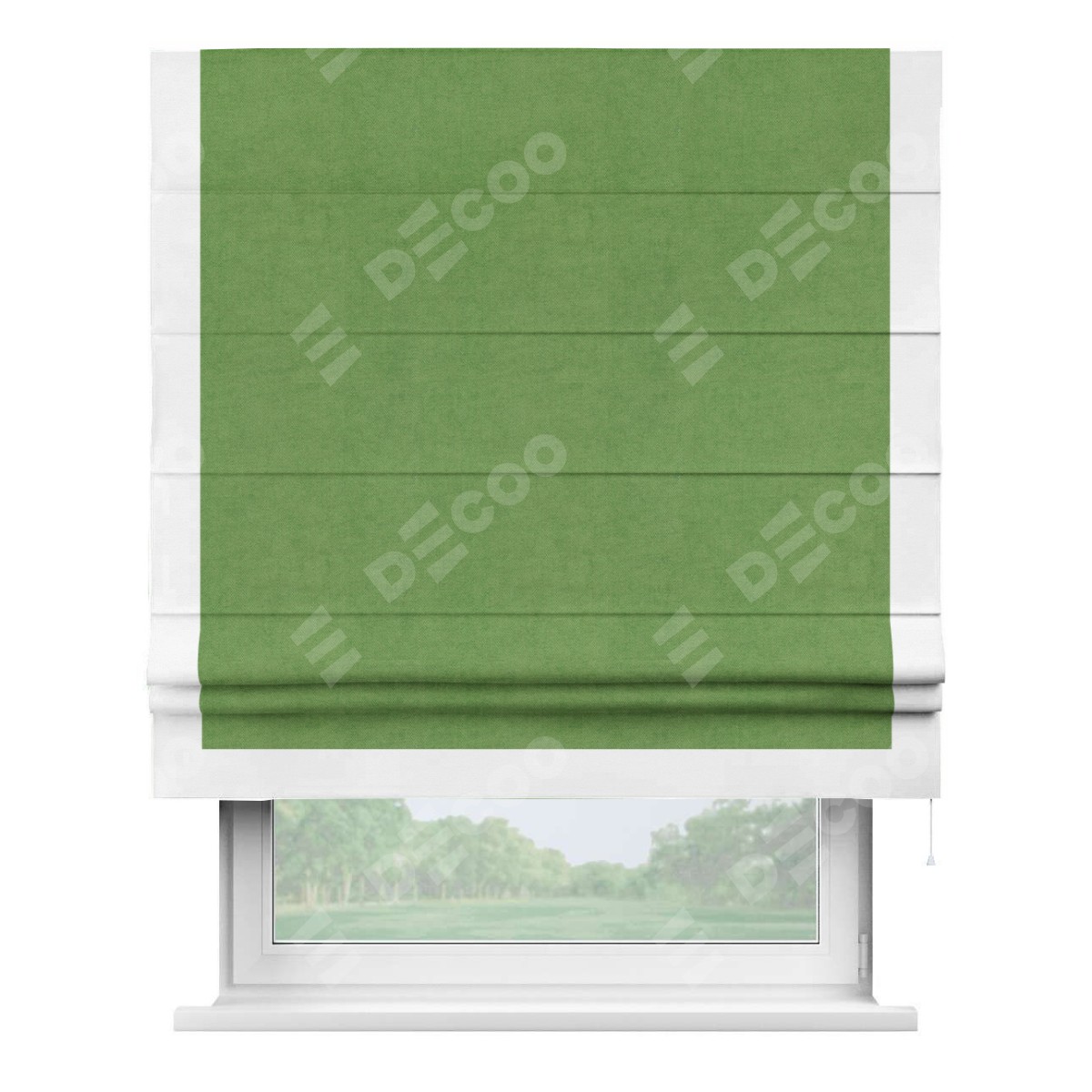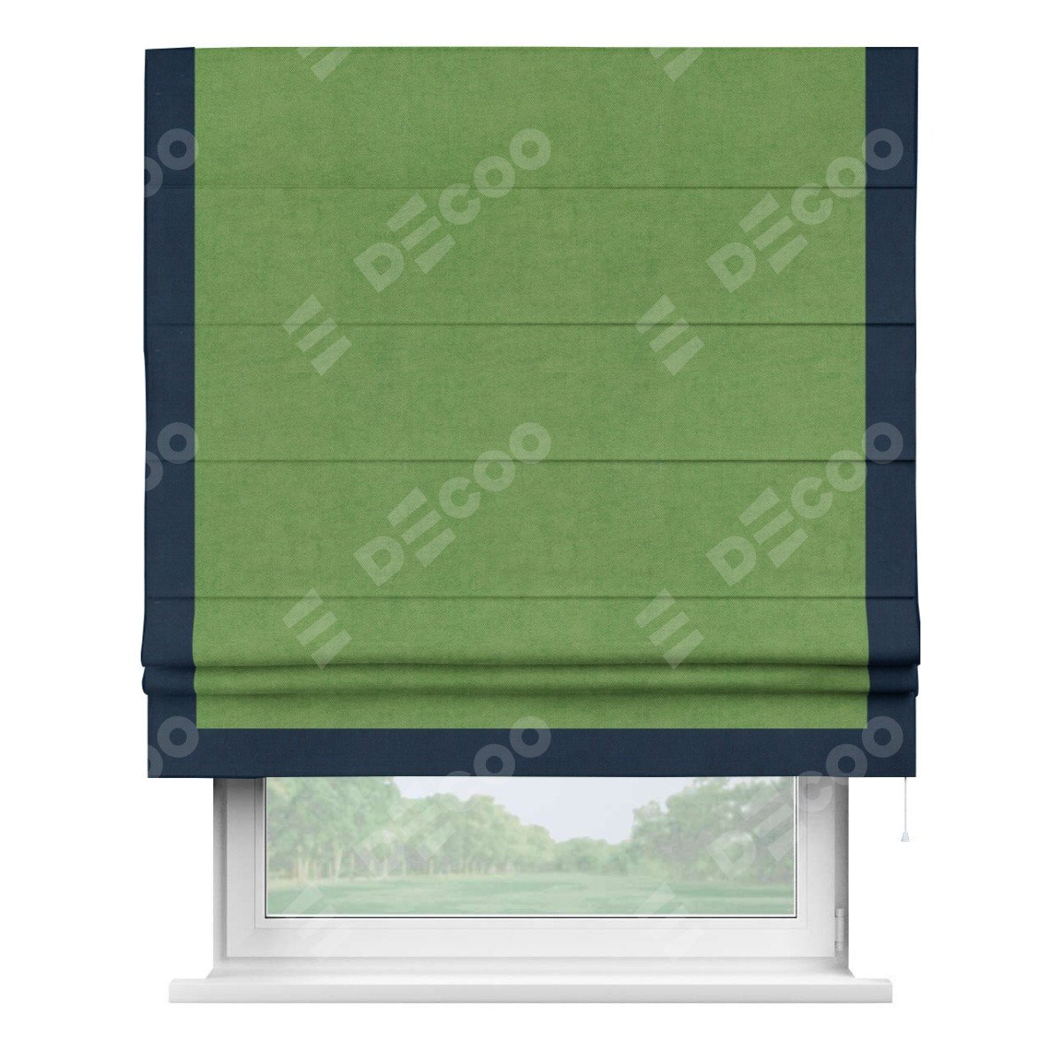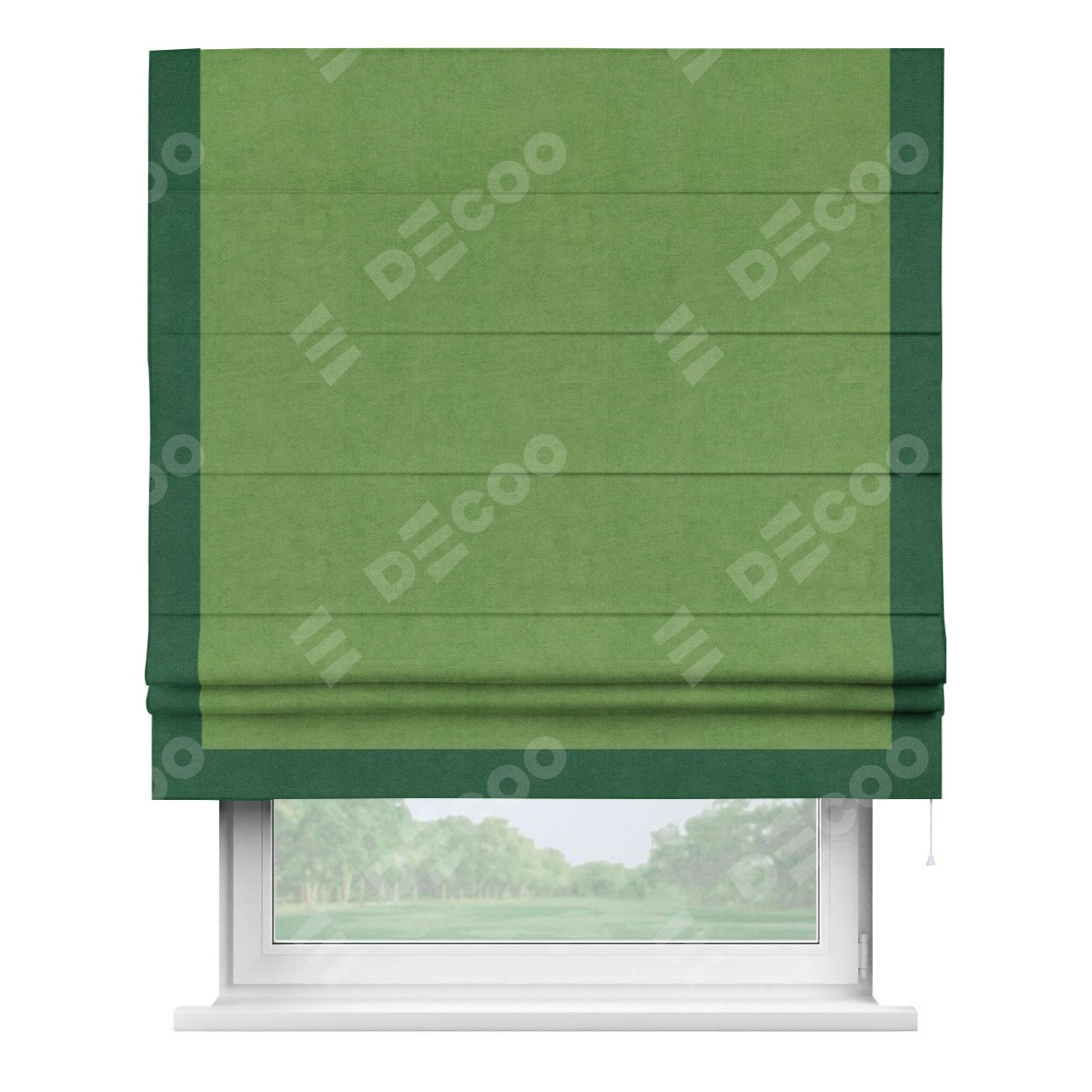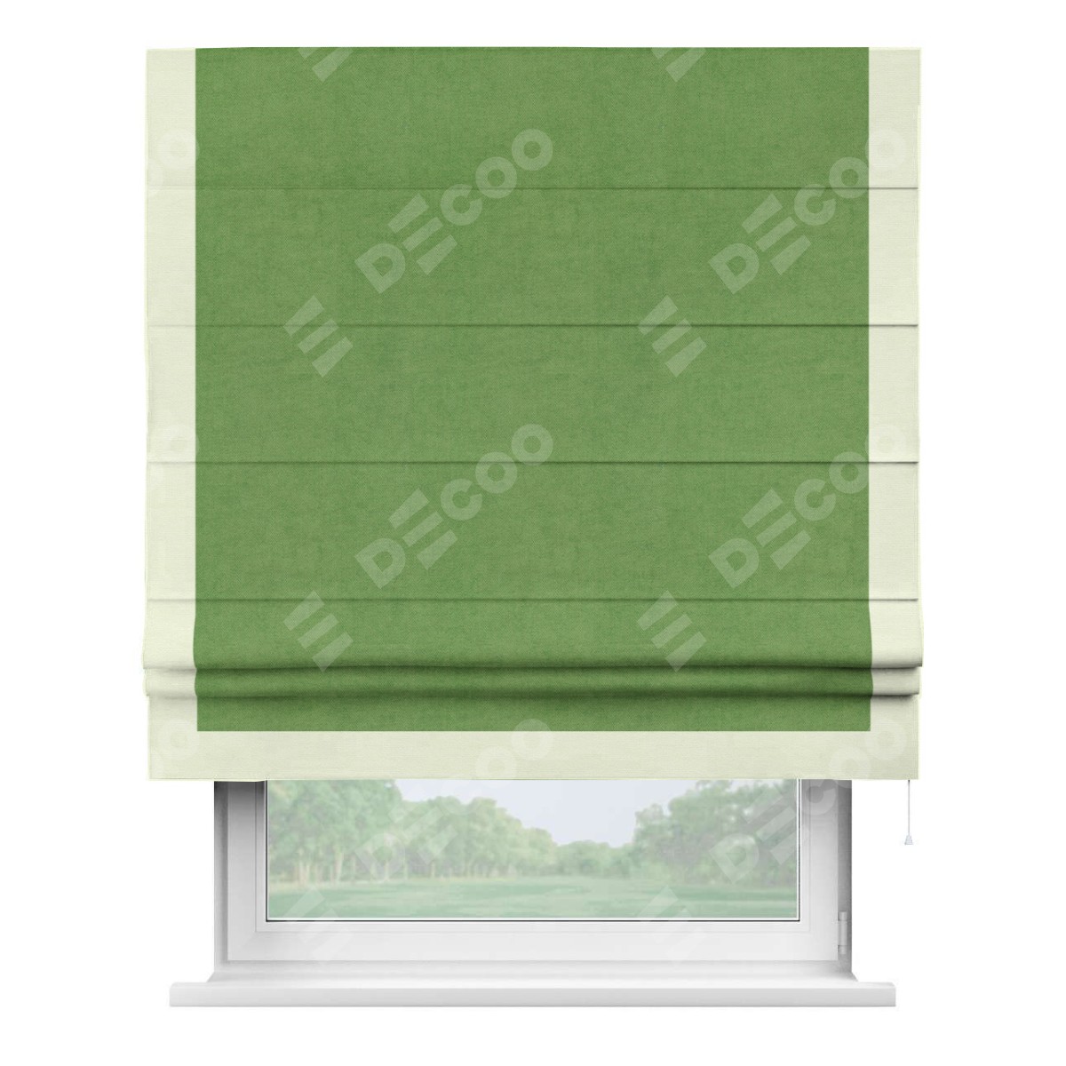 Римская штора производителя «Cortin», используется для проёма, пошита из ткани вельвет салатовый, артикул ткани 87072. Отделка шторы кантом «Виктория», ткань для канта используется из вельвета разной расцветки на выбор. Имеет универсальный механизм и подходит для монтажа: на потолок, на стену и в нишу.