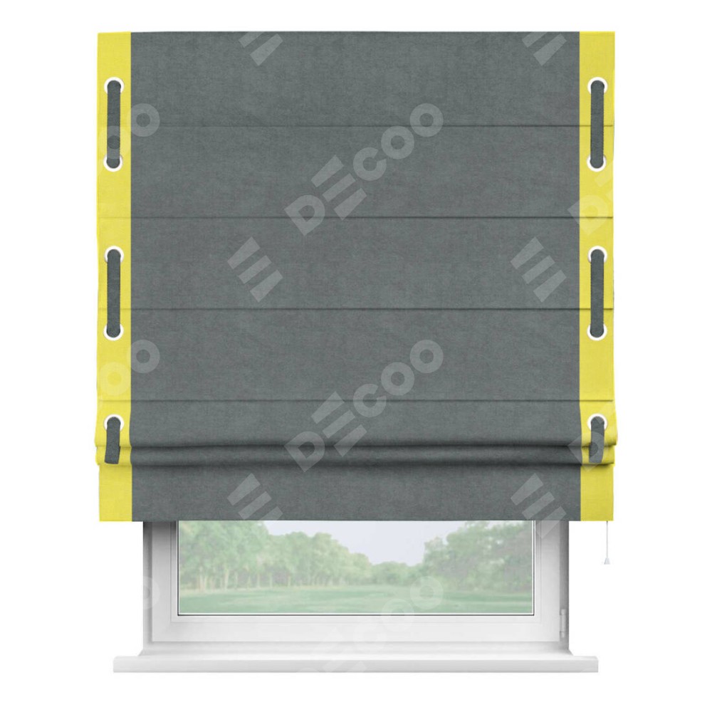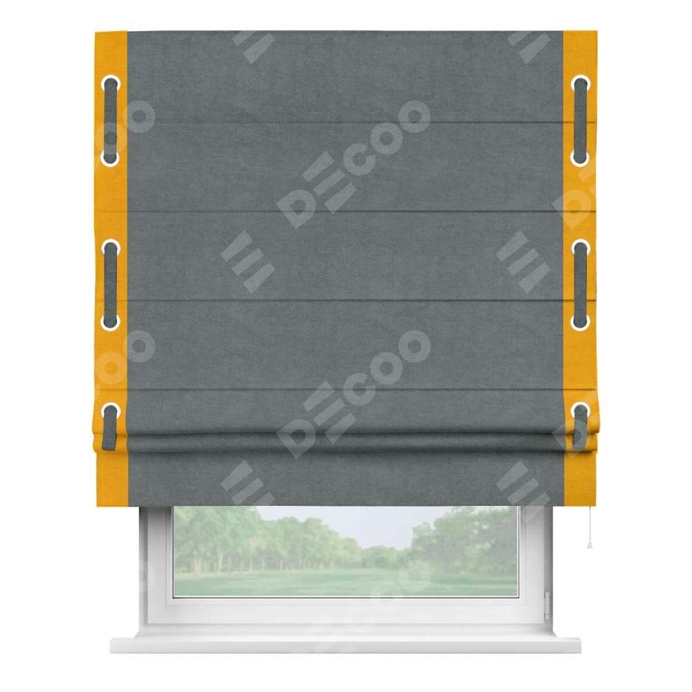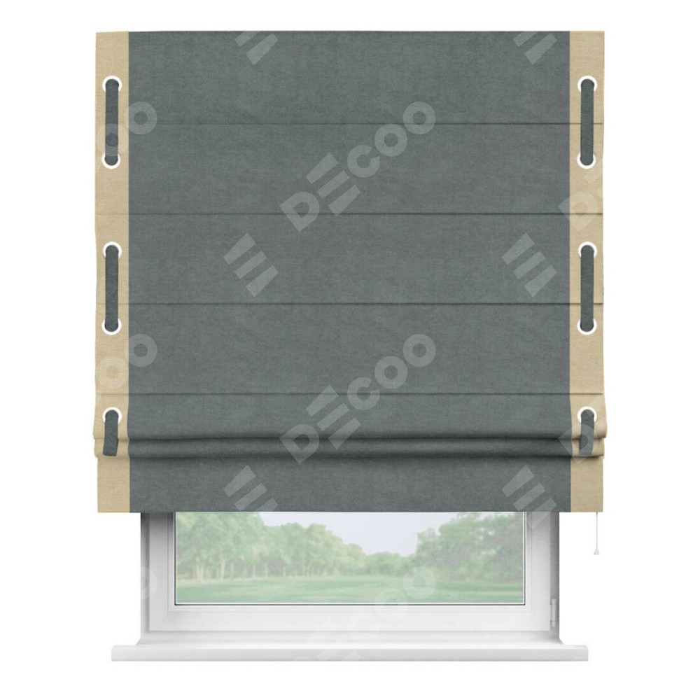 Римская штора производителя «Cortin», используется для проёма, пошита из ткани вельвет серый, артикул ткани 85542. Отделка шторы кантом «Стрим Дуо» на кантах расположены люверсы с пояском, ткань для канта используется из вельвета разной расцветки на выбор. Ткань для пояска обычно используется из основной ткани шторы, а так же можно сделать из любой расцветки по желанию. Имеет универсальный механизм и подходит для монтажа: на потолок, на стену и в нишу.