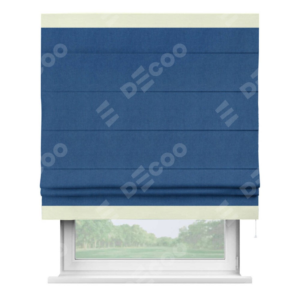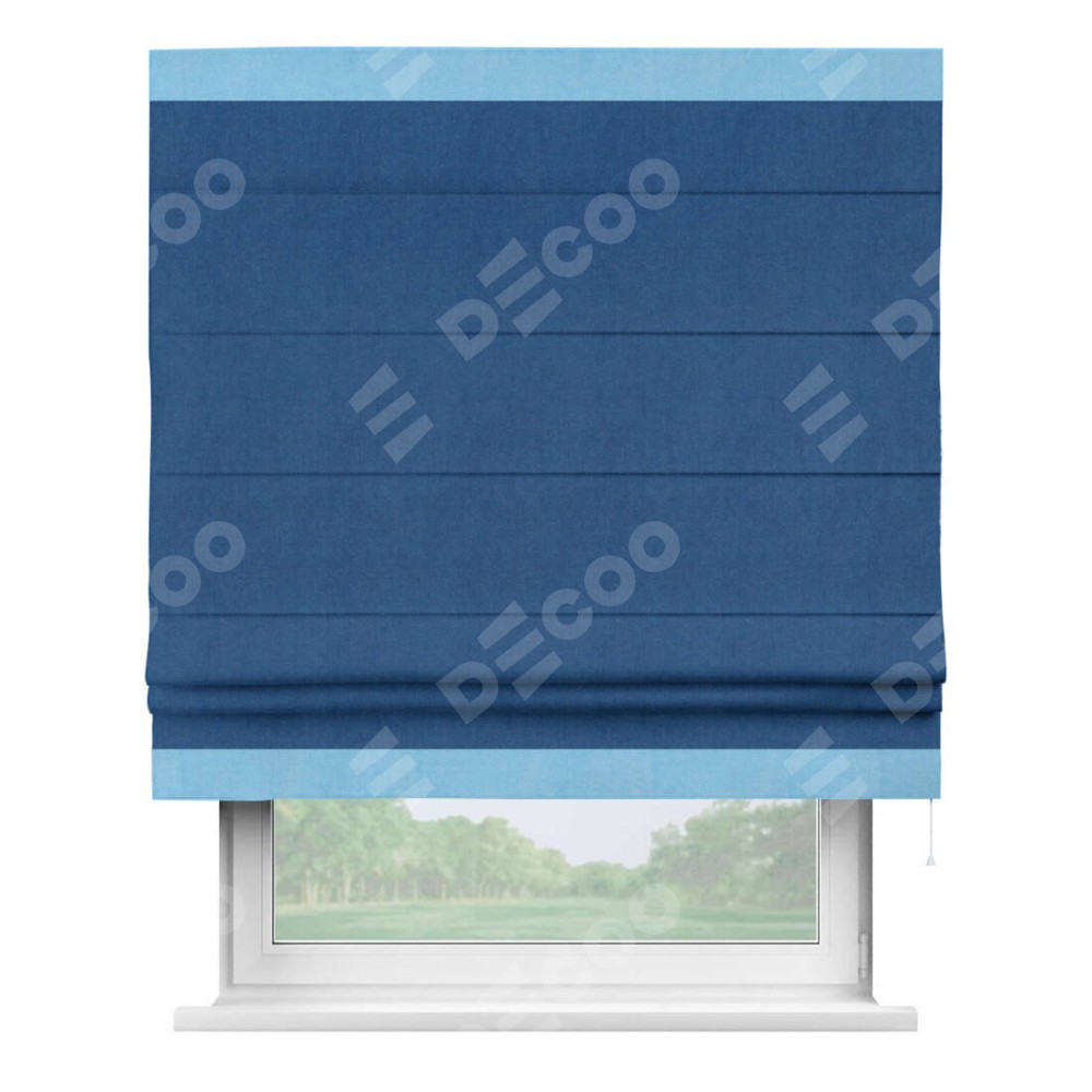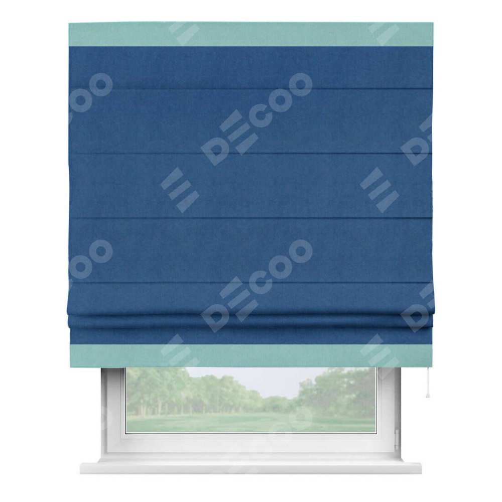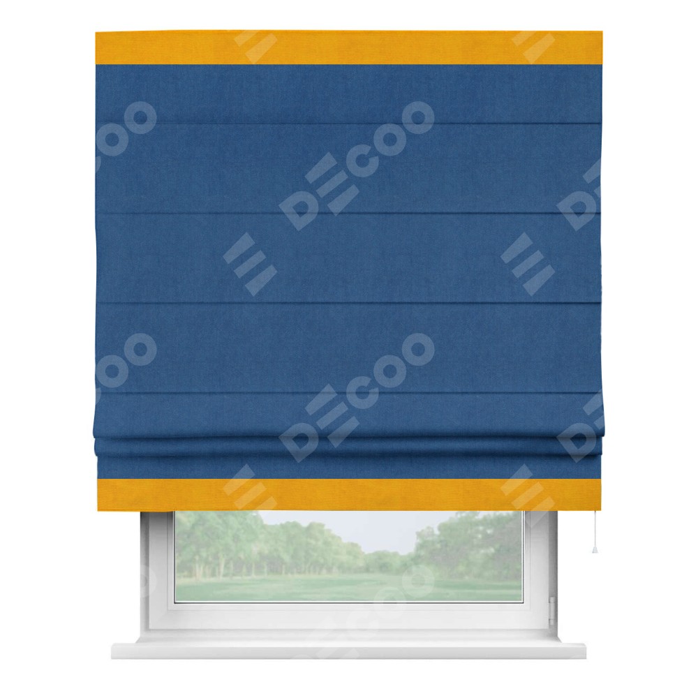 Римская штора производителя «Cortin», используется для проёма, пошита из ткани вельвет синий, артикул ткани 85554. Отделка шторы кантом «Горизонт», ткань для канта используется из вельвета разной расцветки на выбор. Имеет универсальный механизм и подходит для монтажа: на потолок, на стену и в нишу.