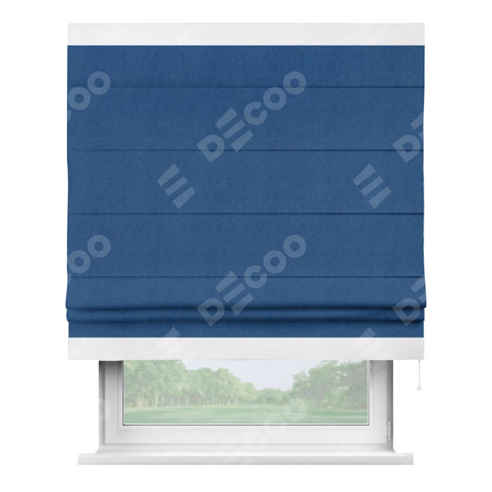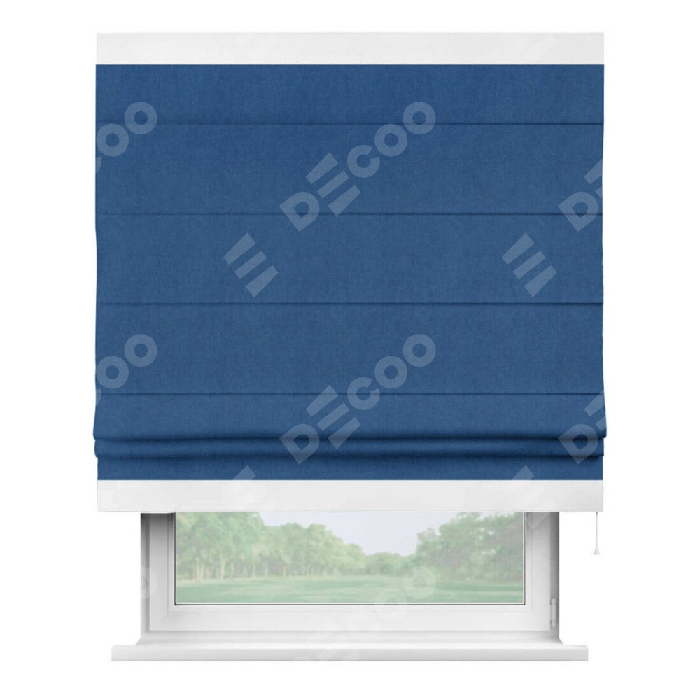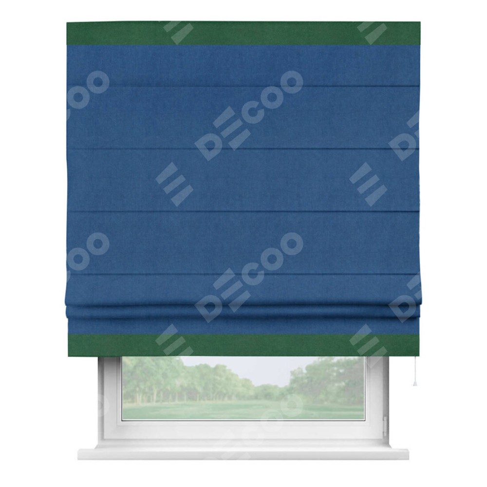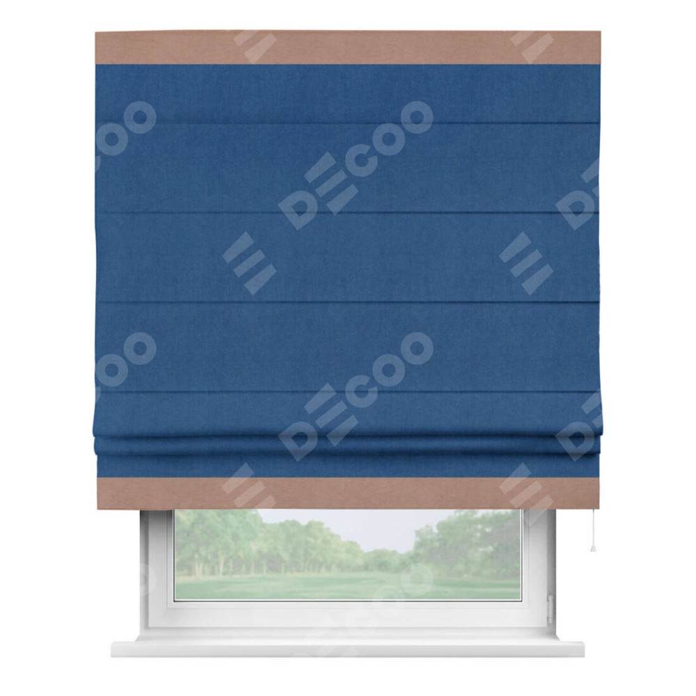 Римская штора производителя «Cortin», используется для проёма, пошита из ткани вельвет синий, артикул ткани 85554. Отделка шторы кантом «Горизонт», ткань для канта используется из вельвета разной расцветки на выбор. Имеет универсальный механизм и подходит для монтажа: на потолок, на стену и в нишу.