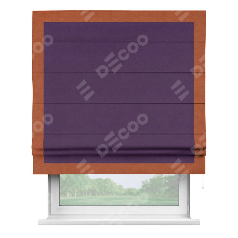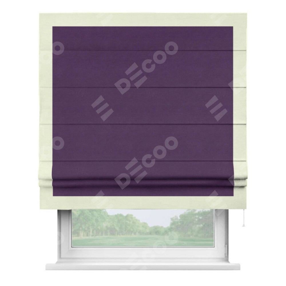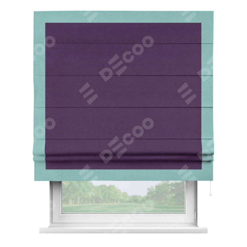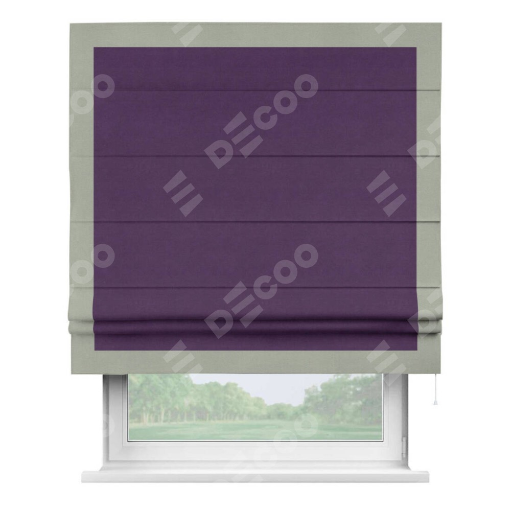 Римская штора производителя «Cortin», используется для проёма, пошита из ткани вельвет темно-фиолетовый, артикул ткани 17753. Отделка шторы кантом «Чесс», ткань для канта используется из вельвета разной расцветки на выбор. Имеет универсальный механизм и подходит для монтажа: на потолок, на стену и в нишу.