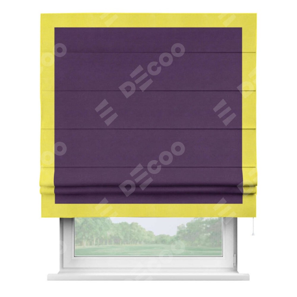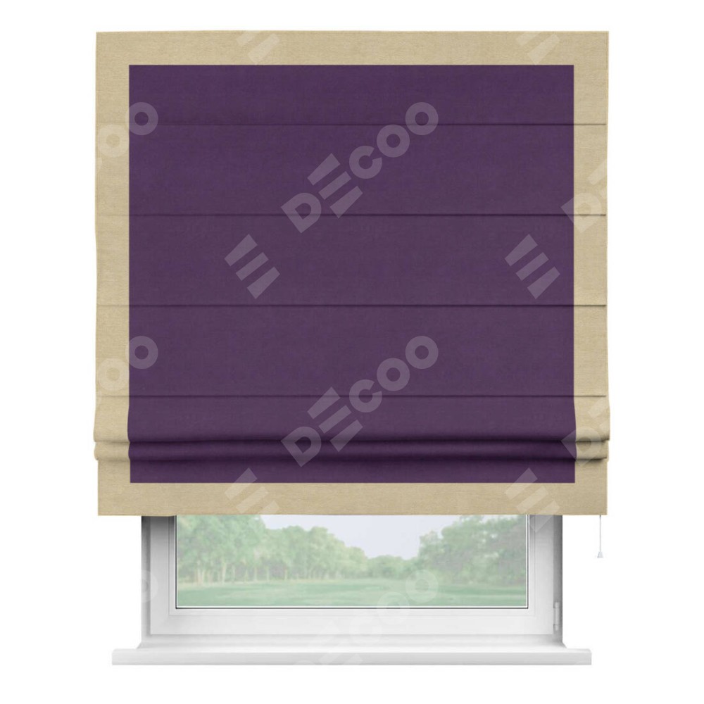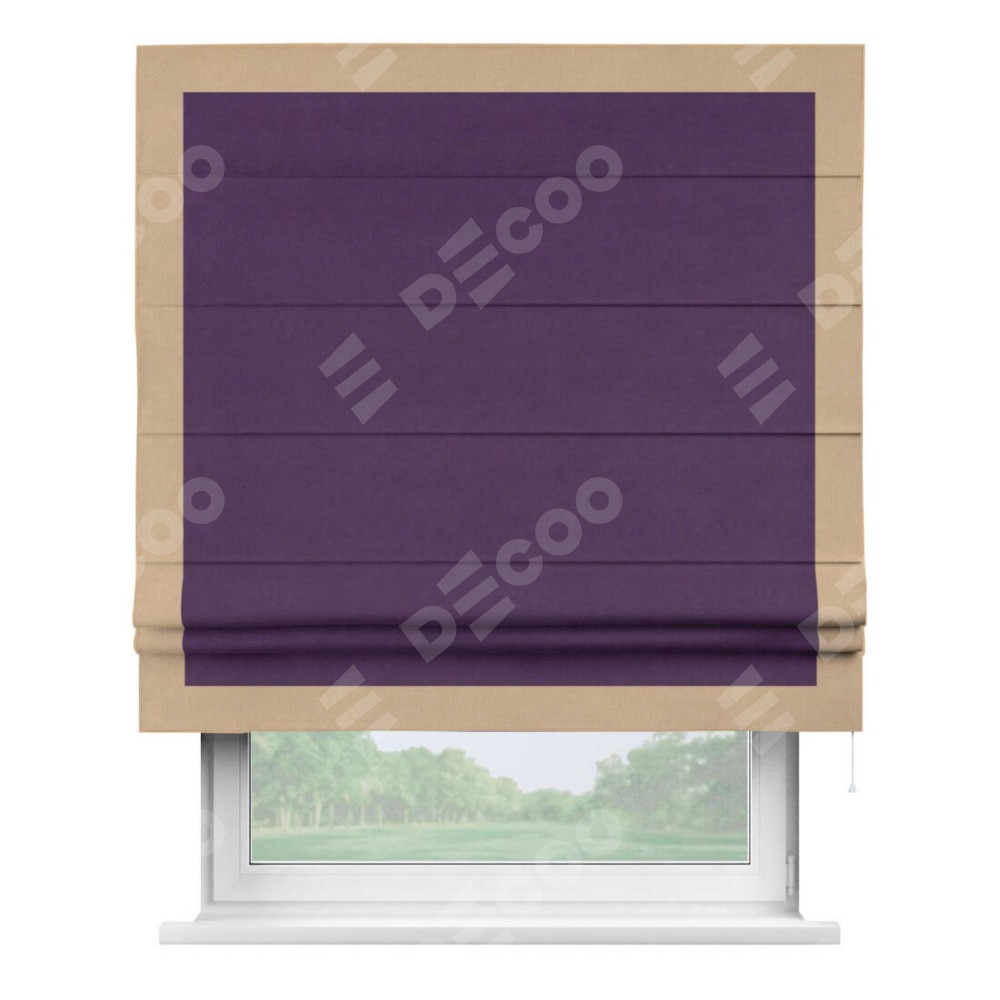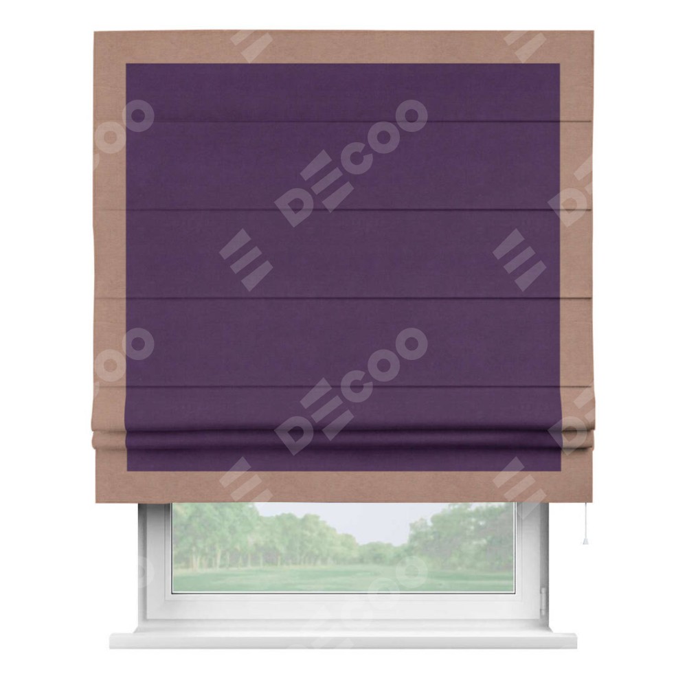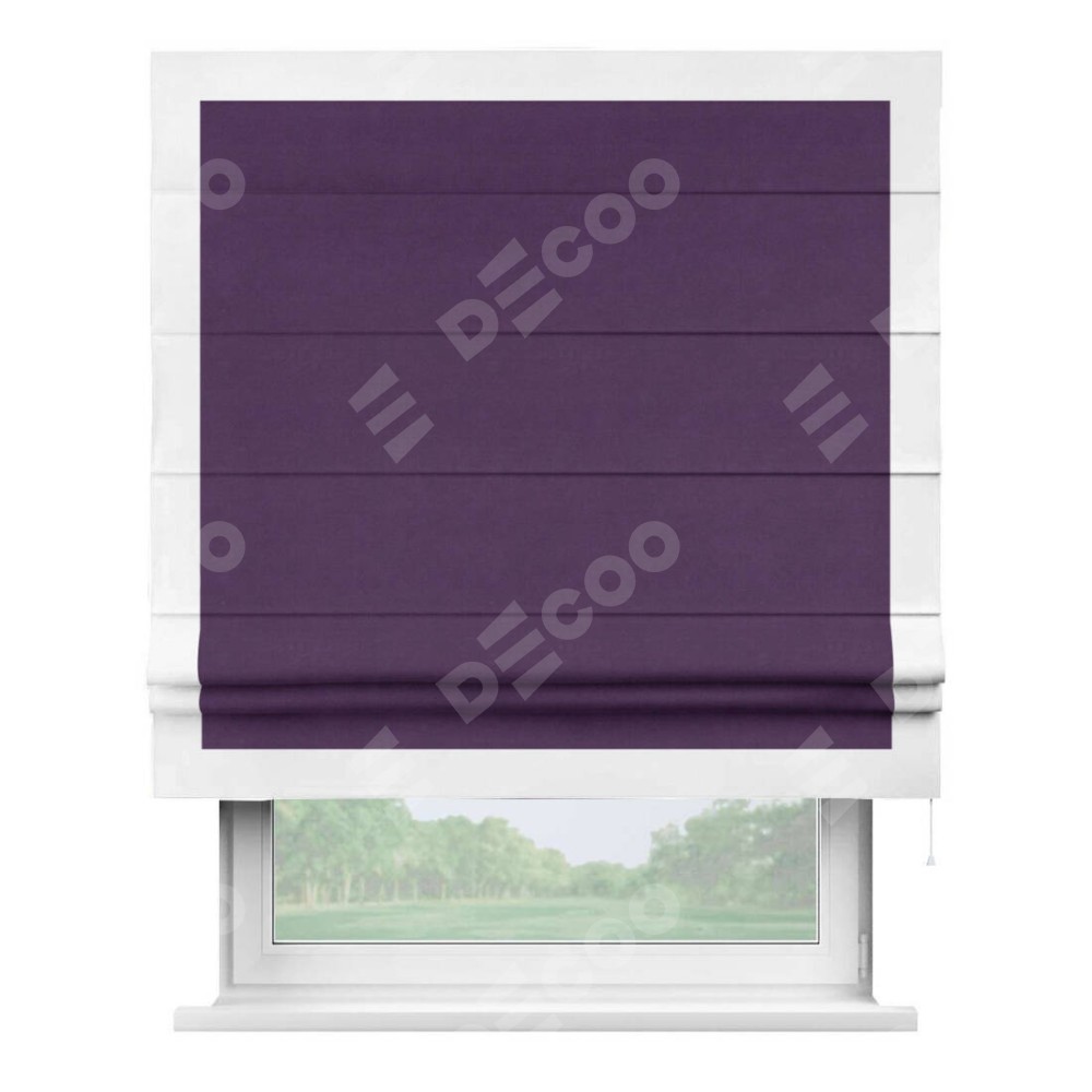 Римская штора производителя «Cortin», используется для проёма, пошита из ткани вельвет темно-фиолетовый, артикул ткани 17753. Отделка шторы кантом «Чесс», ткань для канта используется из вельвета разной расцветки на выбор. Имеет универсальный механизм и подходит для монтажа: на потолок, на стену и в нишу.