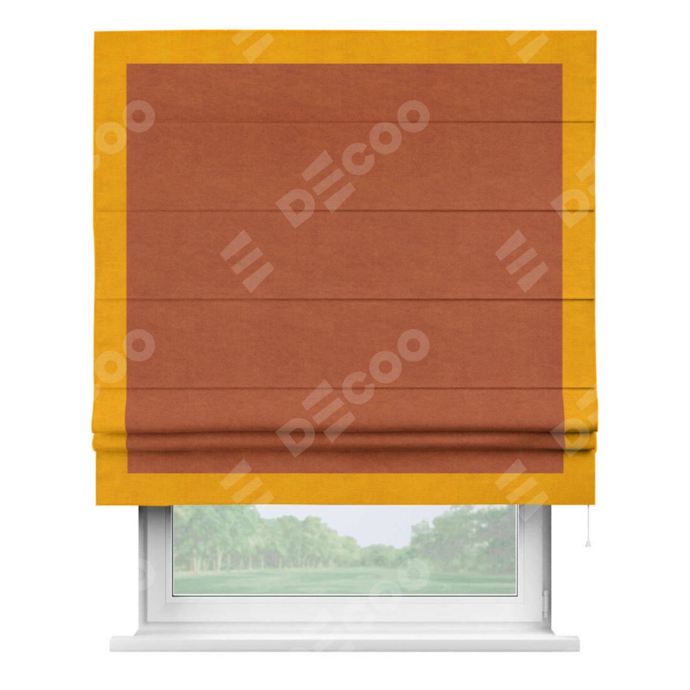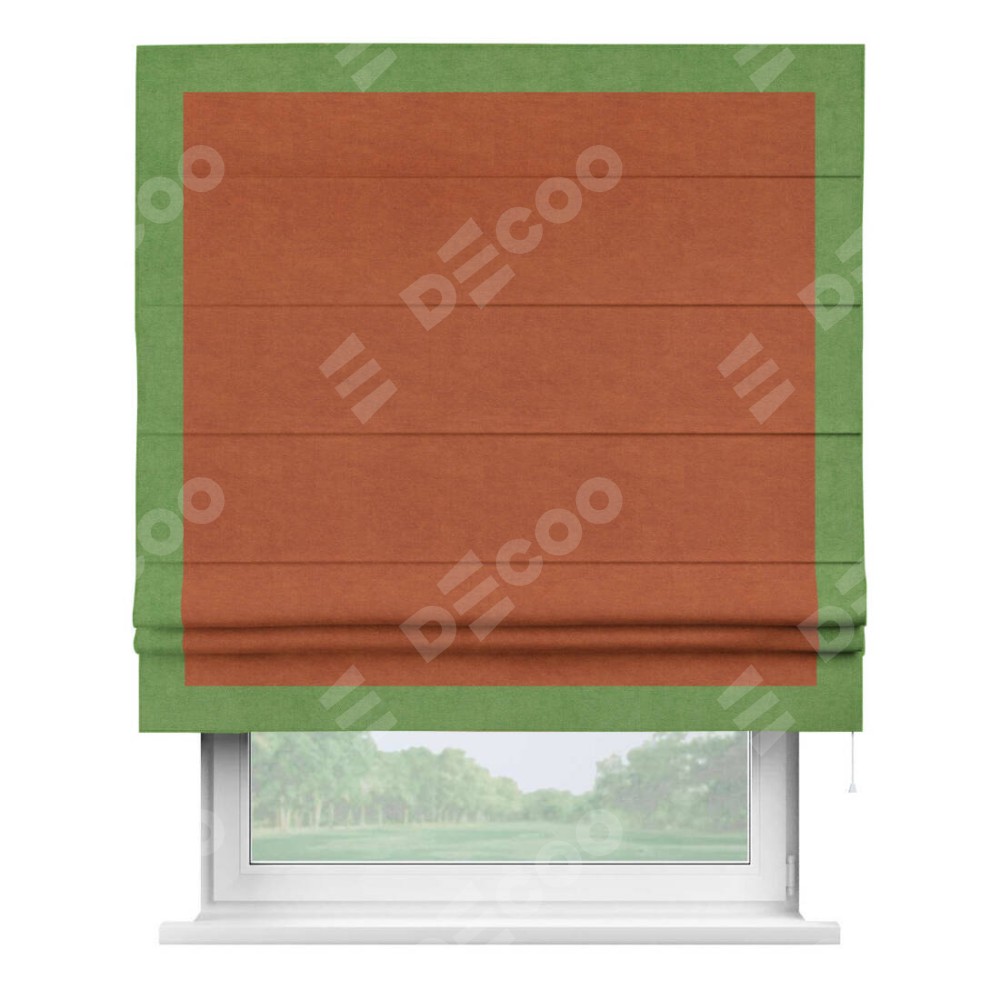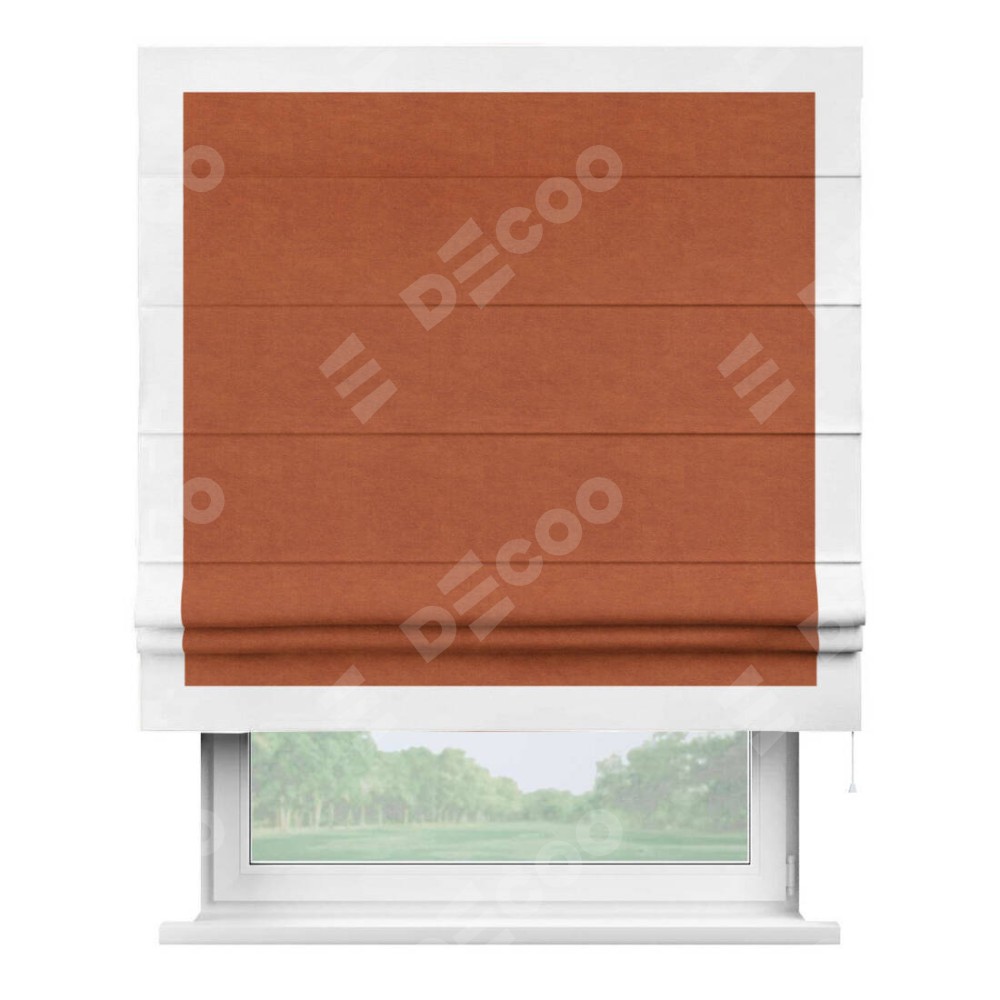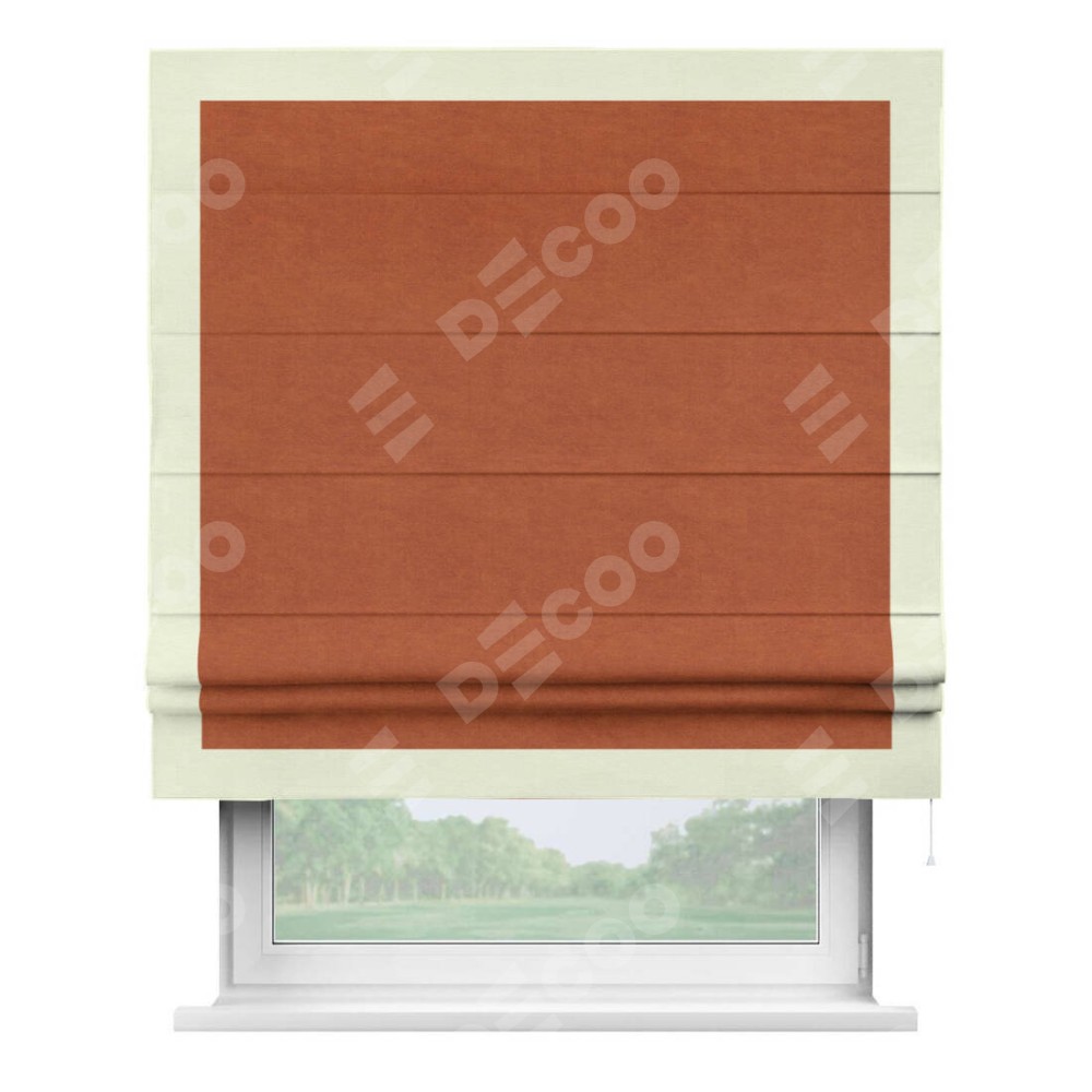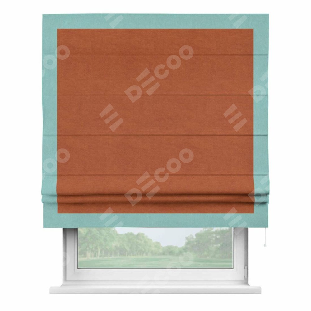 Римская штора производителя «Cortin», используется для проёма, пошита из ткани вельвет терракотовый, артикул ткани 85548. Отделка шторы кантом «Чесс», ткань для канта используется из вельвета разной расцветки на выбор. Имеет универсальный механизм и подходит для монтажа: на потолок, на стену и в нишу.