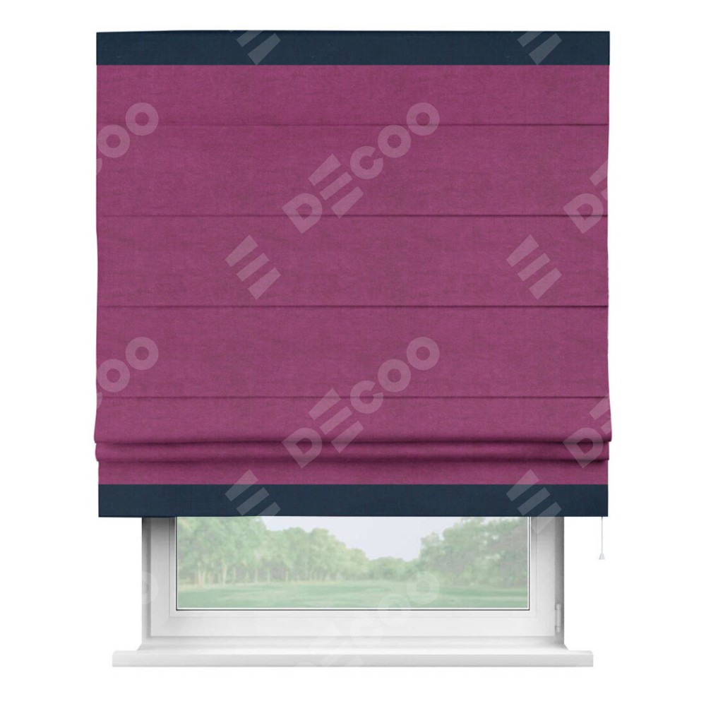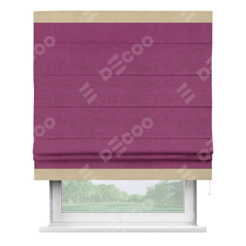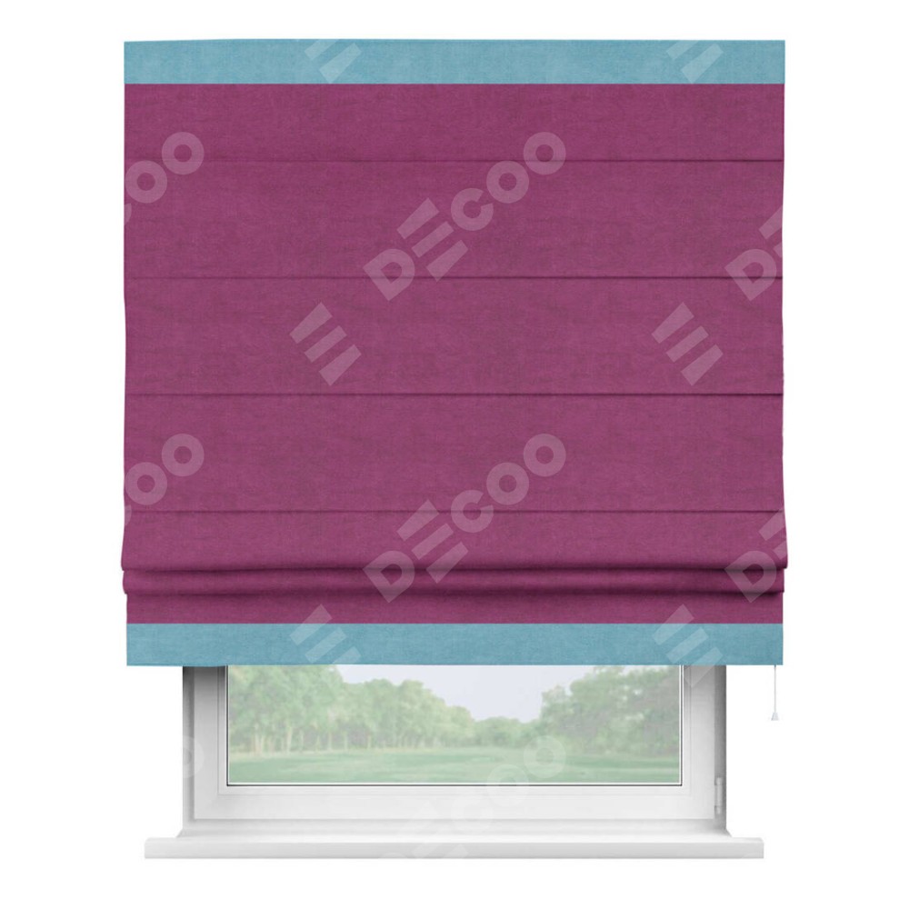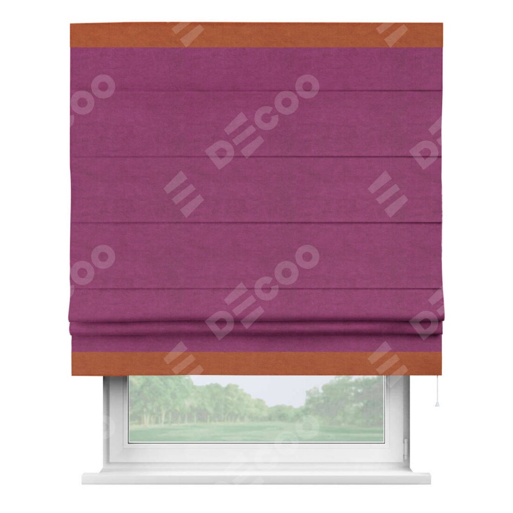 Римская штора производителя «Cortin», используется для проёма, пошита из ткани вельвет фиолетовый, артикул ткани 85552. Отделка шторы кантом «Горизонт», ткань для канта используется из вельвета разной расцветки на выбор. Имеет универсальный механизм и подходит для монтажа: на потолок, на стену и в нишу.