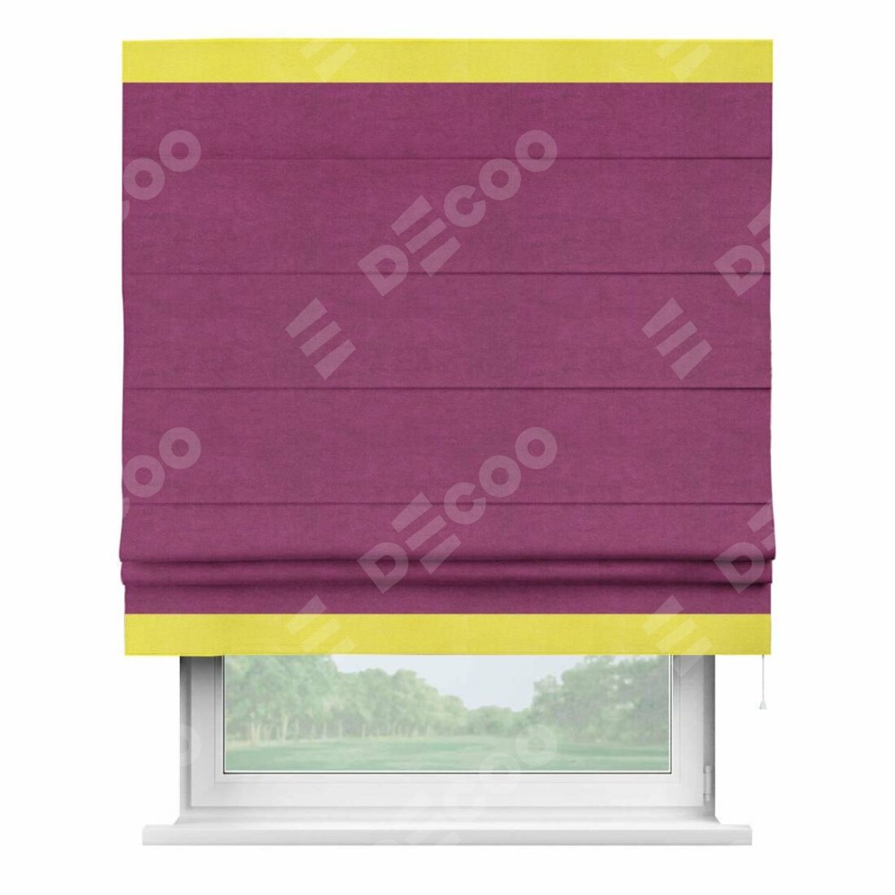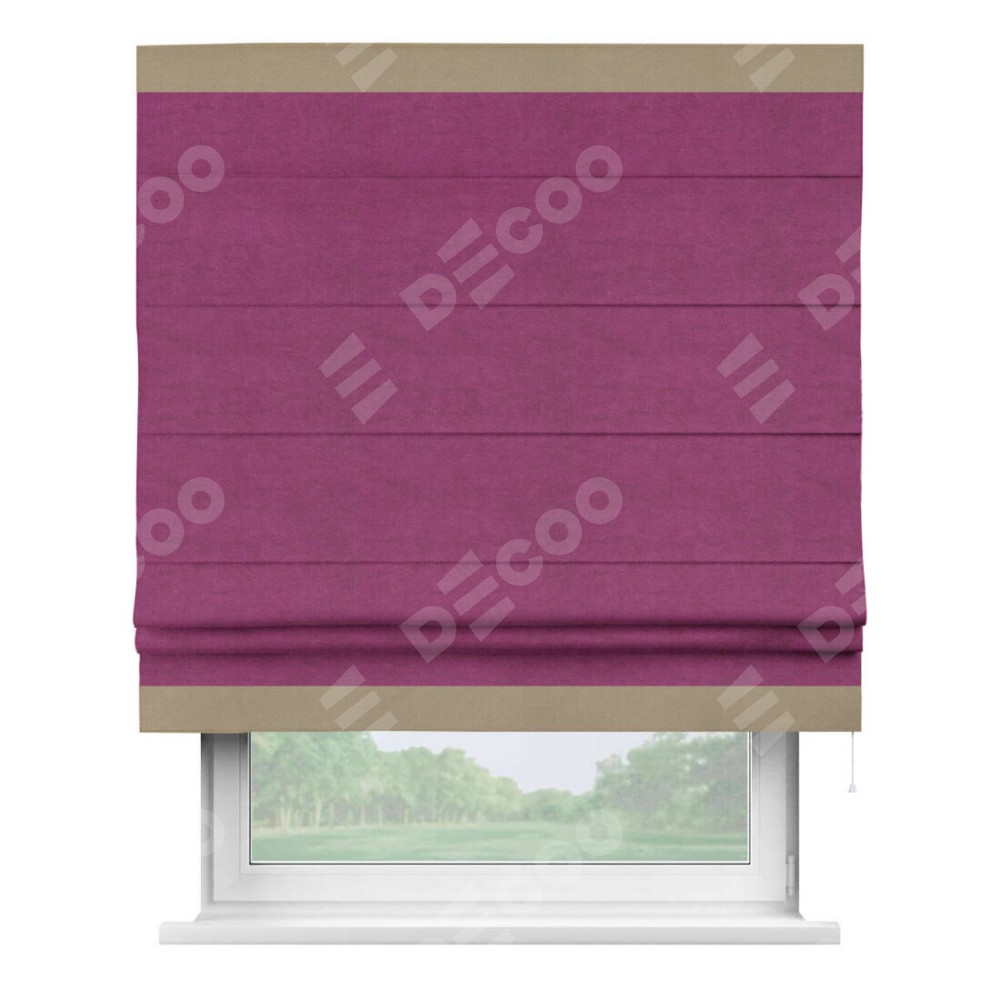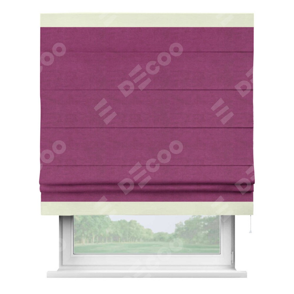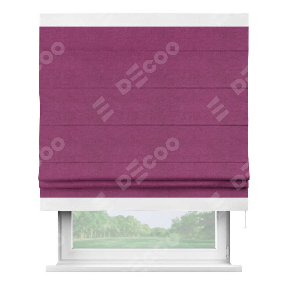 Римская штора производителя «Cortin», используется для проёма, пошита из ткани вельвет фиолетовый, артикул ткани 85552. Отделка шторы кантом «Горизонт», ткань для канта используется из вельвета разной расцветки на выбор. Имеет универсальный механизм и подходит для монтажа: на потолок, на стену и в нишу.