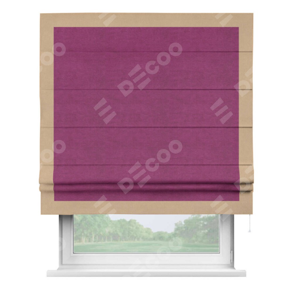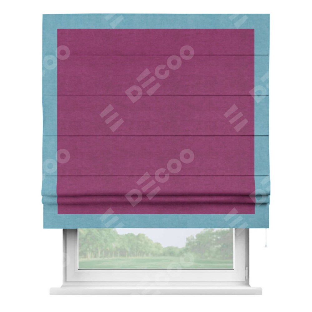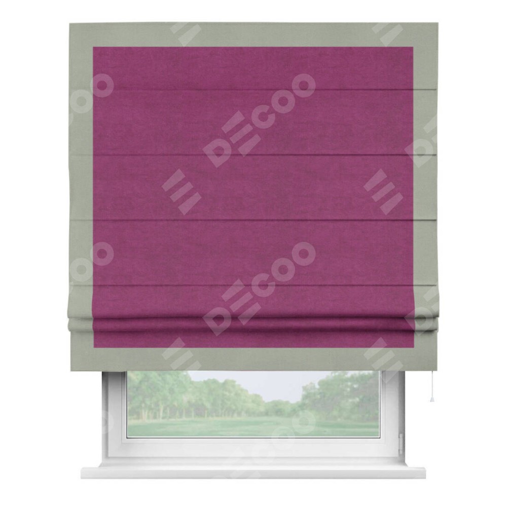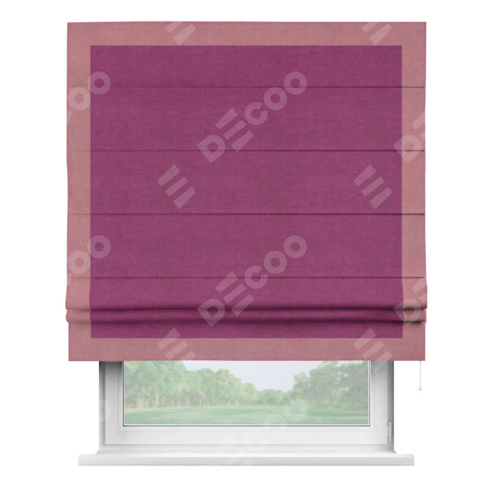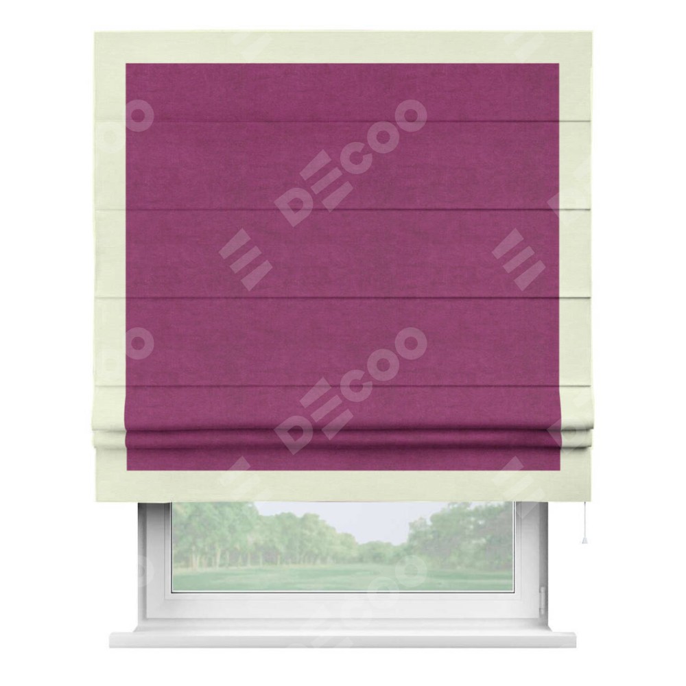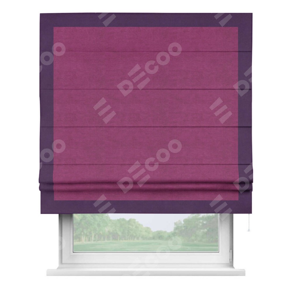 Римская штора производителя «Cortin», используется для проёма, пошита из ткани вельвет фиолетовый, артикул ткани 85552. Отделка шторы кантом «Чесс», ткань для канта используется из вельвета разной расцветки на выбор. Имеет универсальный механизм и подходит для монтажа: на потолок, на стену и в нишу.