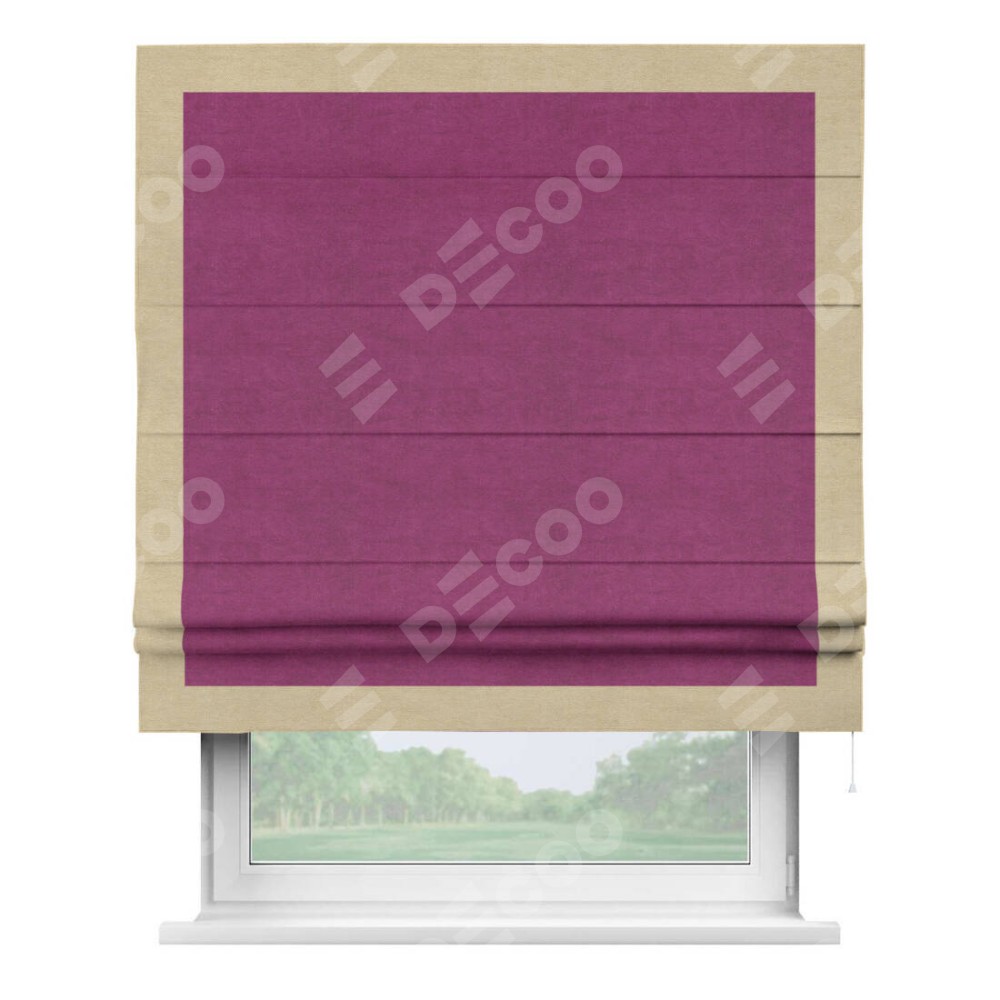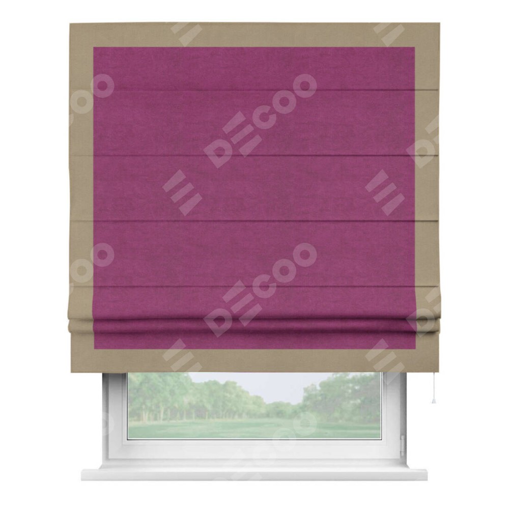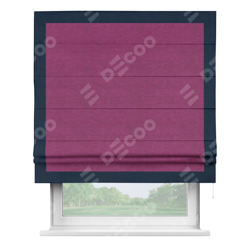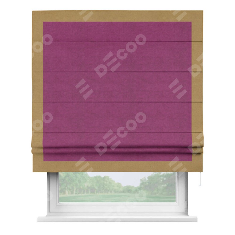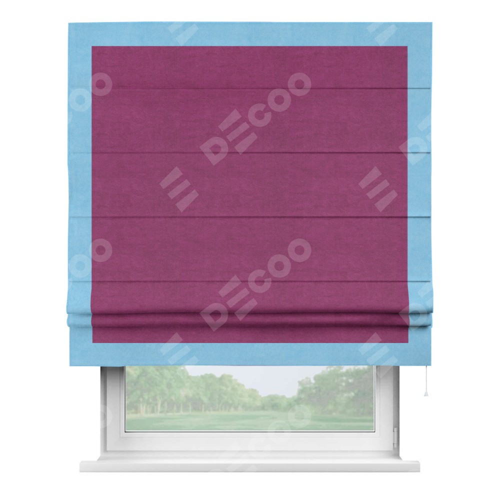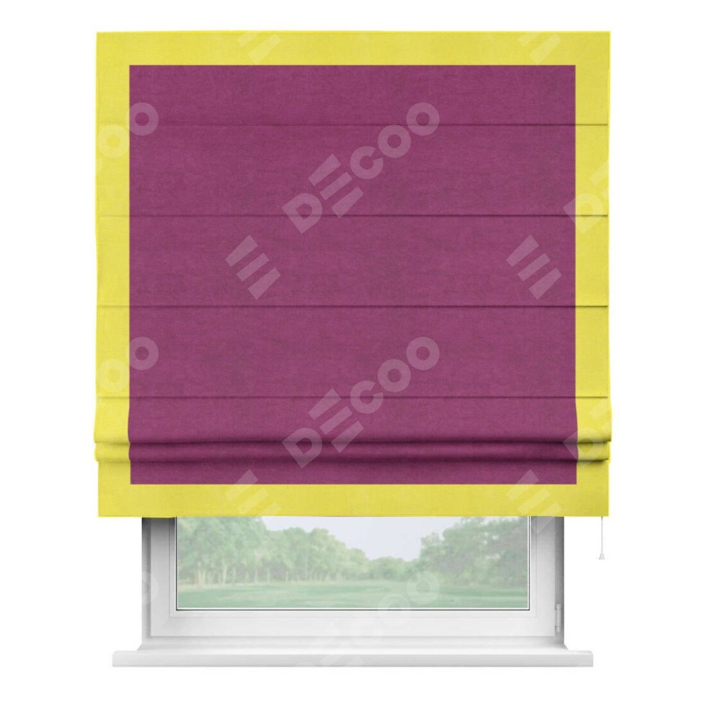 Римская штора производителя «Cortin», используется для проёма, пошита из ткани вельвет фиолетовый, артикул ткани 85552. Отделка шторы кантом «Чесс», ткань для канта используется из вельвета разной расцветки на выбор. Имеет универсальный механизм и подходит для монтажа: на потолок, на стену и в нишу.