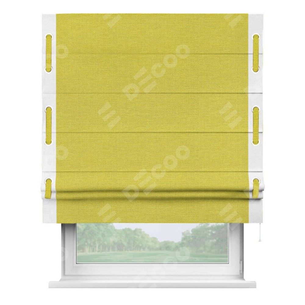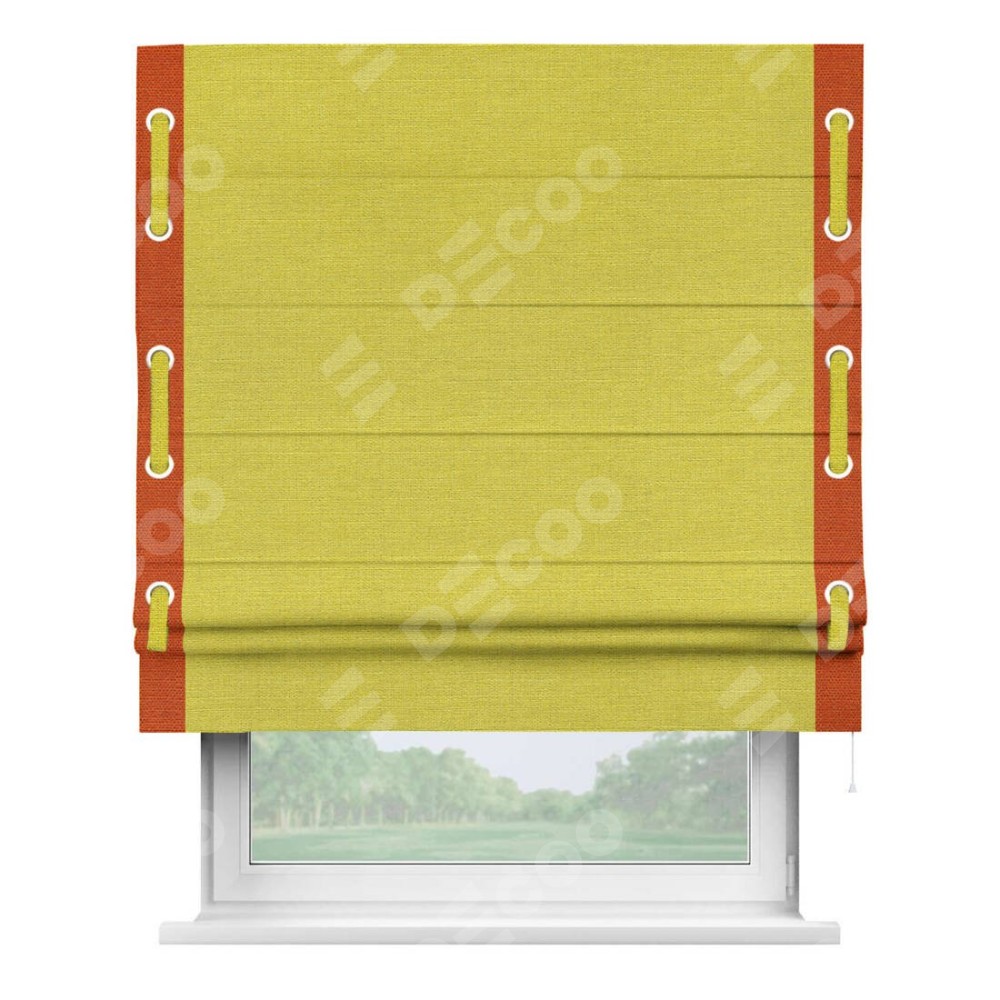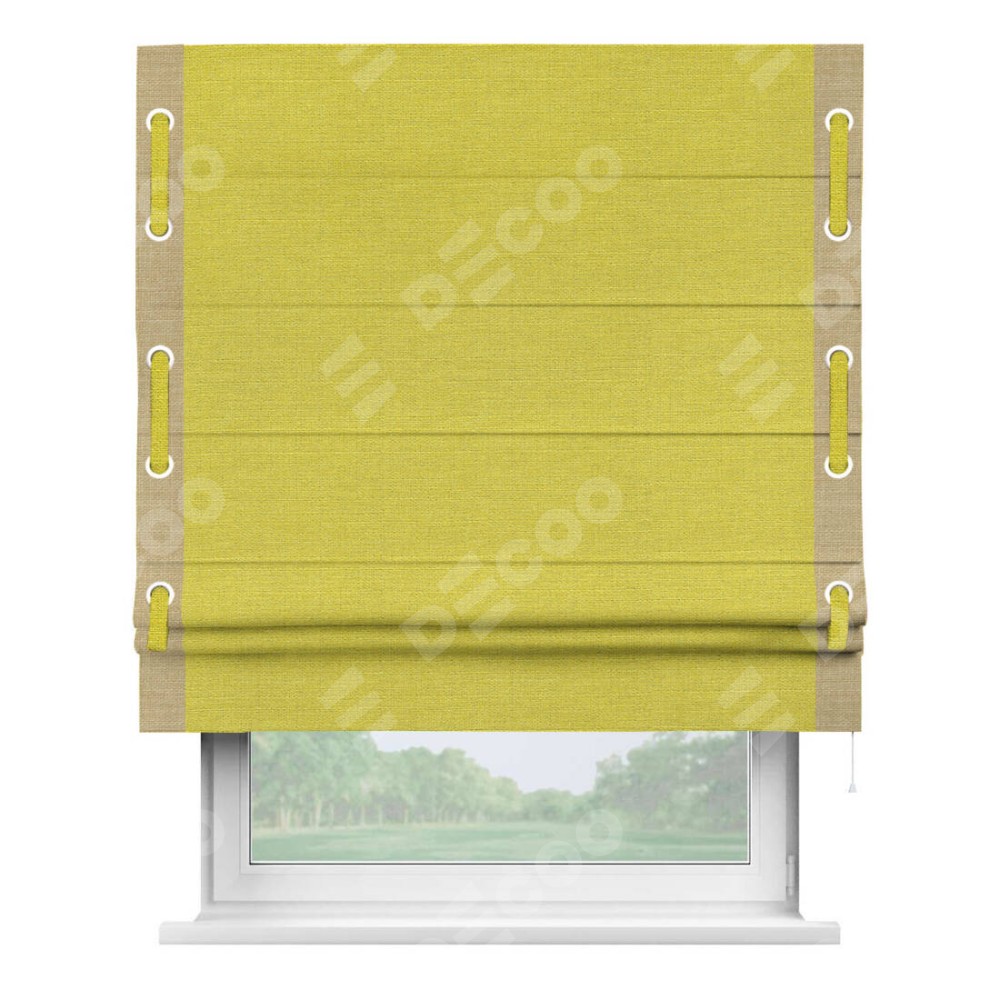 Римская штора производителя «Cortin», используется для проёма, пошита из ткани лён салатовый, артикул 53437. Отделка шторы кантом «Стрим Дуо» на кантах расположены люверсы с пояском, ткань для канта используется из льна разной расцветки на выбор. Ткань для пояска обычно используется из основной ткани шторы, а так же можно сделать из любой расцветки по желанию. Имеет универсальный механизм и подходит для монтажа: на потолок, на стену и в нишу.